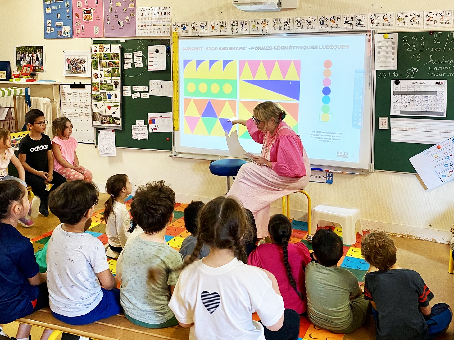 En collaboration avec PALM, elle a piloté un projet de design actif pour la Ville de Beauvais afin de sécuriser et d’embellir les abords de plusieurs groupes scolaires. Inspirée par des ateliers de création de gommettes réalisés avec les élèves, elle a conçu un paysage au sol composé de formes géométriques ludiques et colorées. Cette intervention transforme la chaussée en un terrain d’expression poétique qui réduit les incivilités tout en stimulant l’imaginaire des enfants.