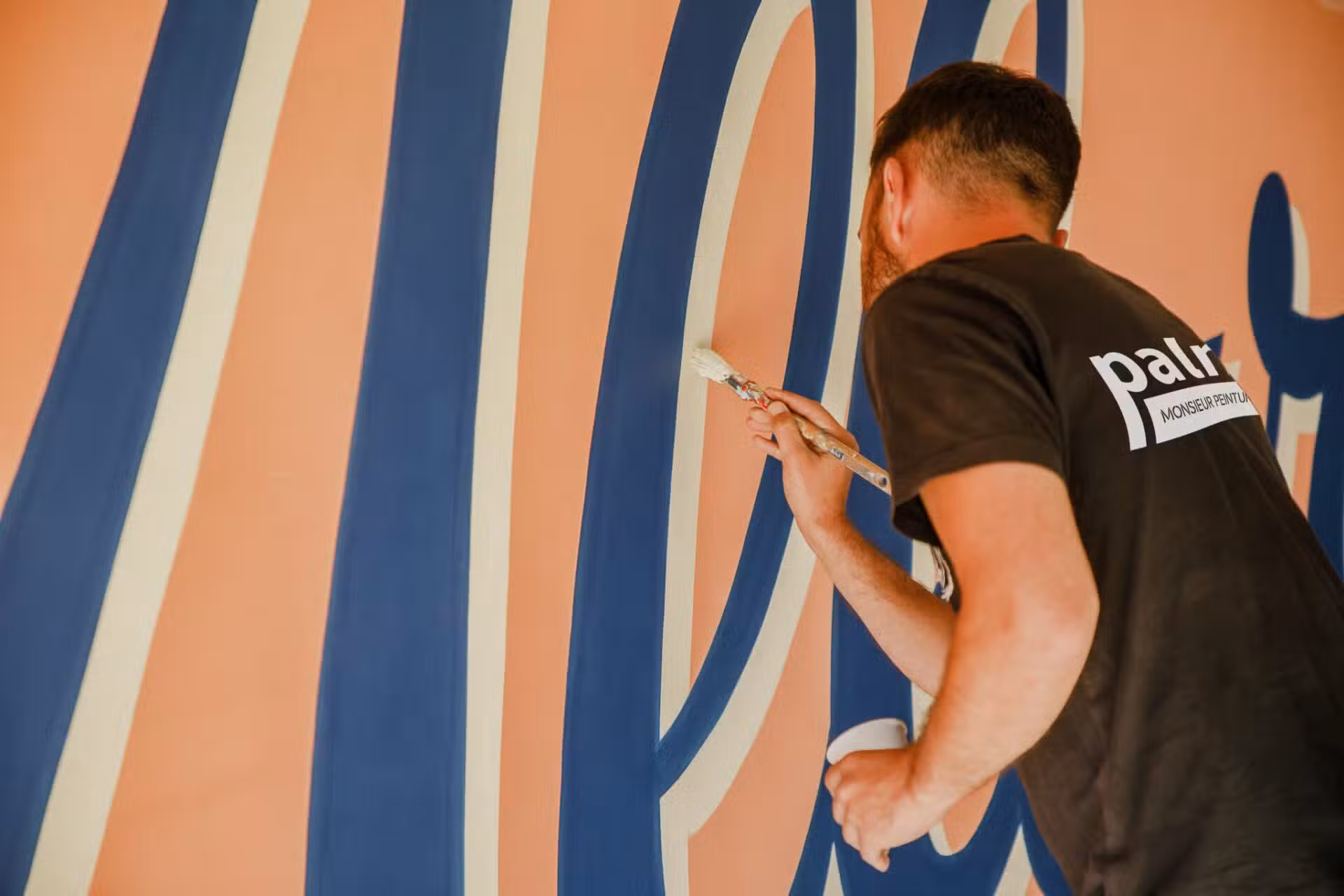 Parmi ses interventions, une fresque dynamique a été réalisée pour OVHcloud à Croix afin d’animer un espace de détente autour de l’univers du ping-pong : trajectoires, rebonds et effet cinétique transforment le lieu de pause en expérience visuelle ludique et rythmée. Le visuel imaginé par l’architecte du projet a été confié à PALM pour une mise en peinture manuelle précise, fidèle et texturée.