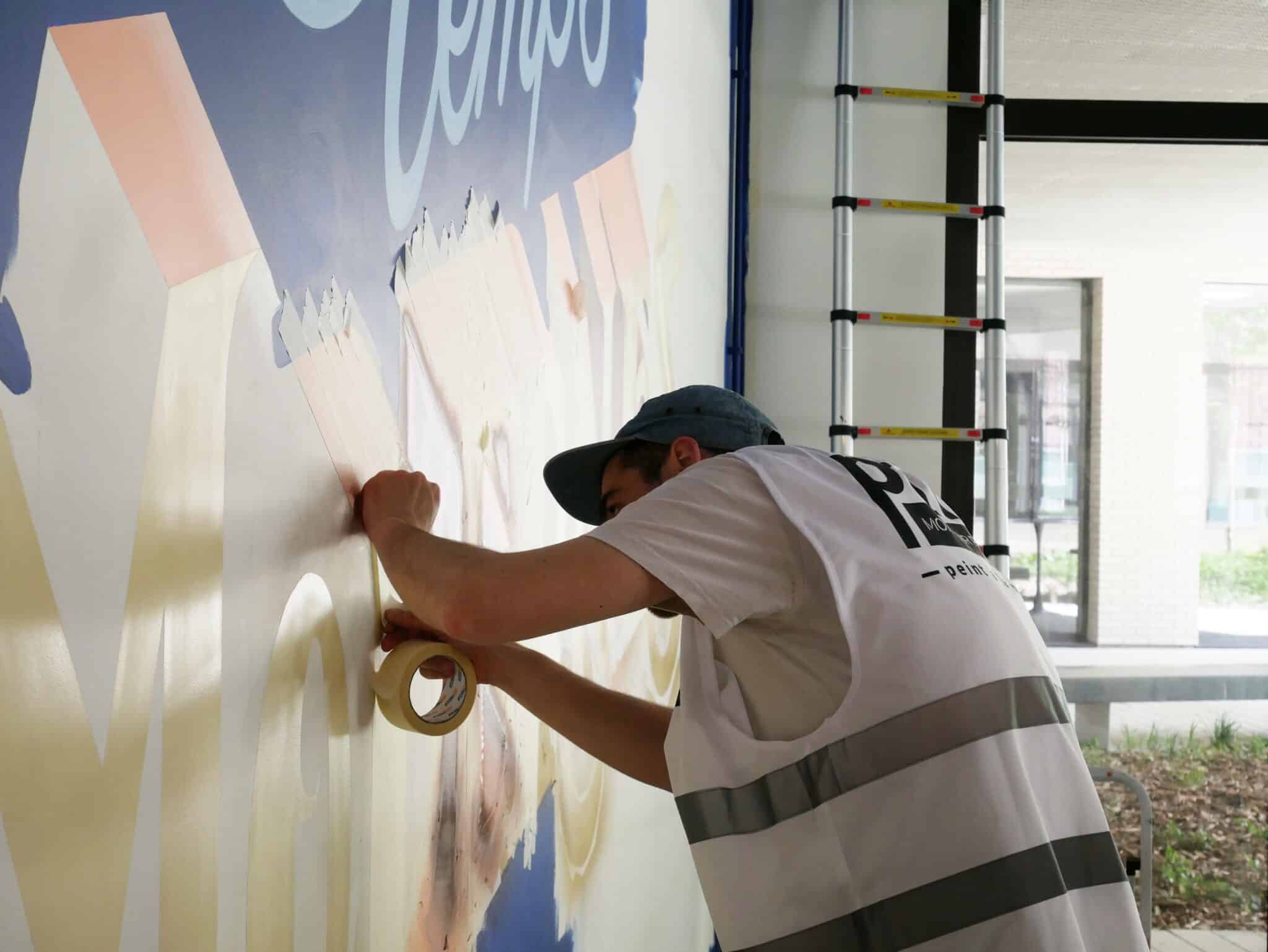 En collaboration avec PALM, il a investi l’ancienne usine Fenwick à Saint-Ouen, réhabilitée par AXA REIM, Sogeprom et SAA Architectes. Au sein du restaurant inter-entreprise, il a réalisé une œuvre inspirée du film Les Temps Modernes de Charlie Chaplin. En dialogue avec l’architecture industrielle et le mobilier, cette fresque rend un hommage symbolique aux ouvriers du site tout en illustrant l’évolution du monde du travail, ancrant ainsi l’art au cœur de ce patrimoine historique.