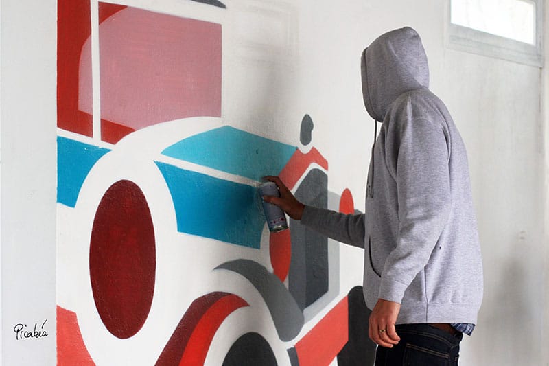 Avec PALM, il a habillé les bureaux de Contentsquare à Paris de fresques reprenant leur charte graphique digitale. Il a aussi réalisé à Grigny une signalétique artistique au sol pour sensibiliser les habitants au tri des déchets. Ces interventions renforcent l’identité des lieux tout en valorisant le quotidien des usagers.