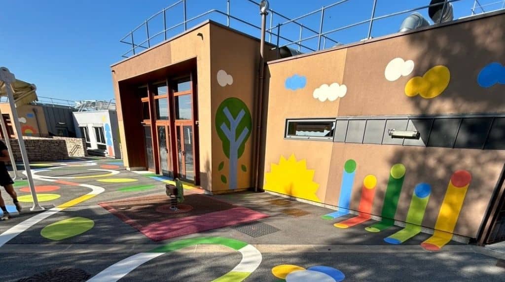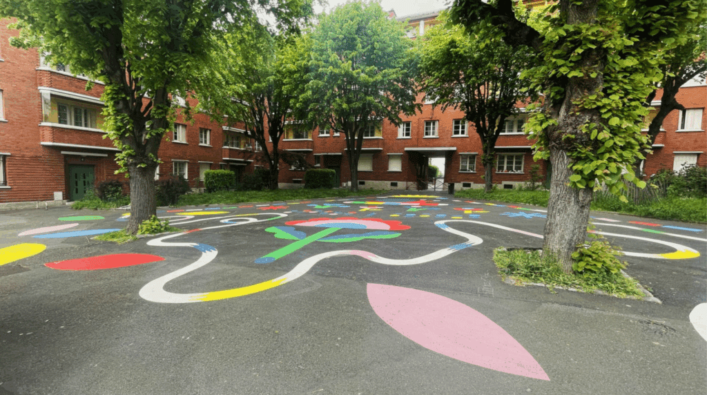- Créativité et fresques au sol : nous concevons des tracés colorés et organiques qui relient les espaces de la cour, créent des parcours ludiques et incitent les enfants à courir, sauter et explorer. Ces fresques renforcent également l’identité visuelle de l’école et du quartier
