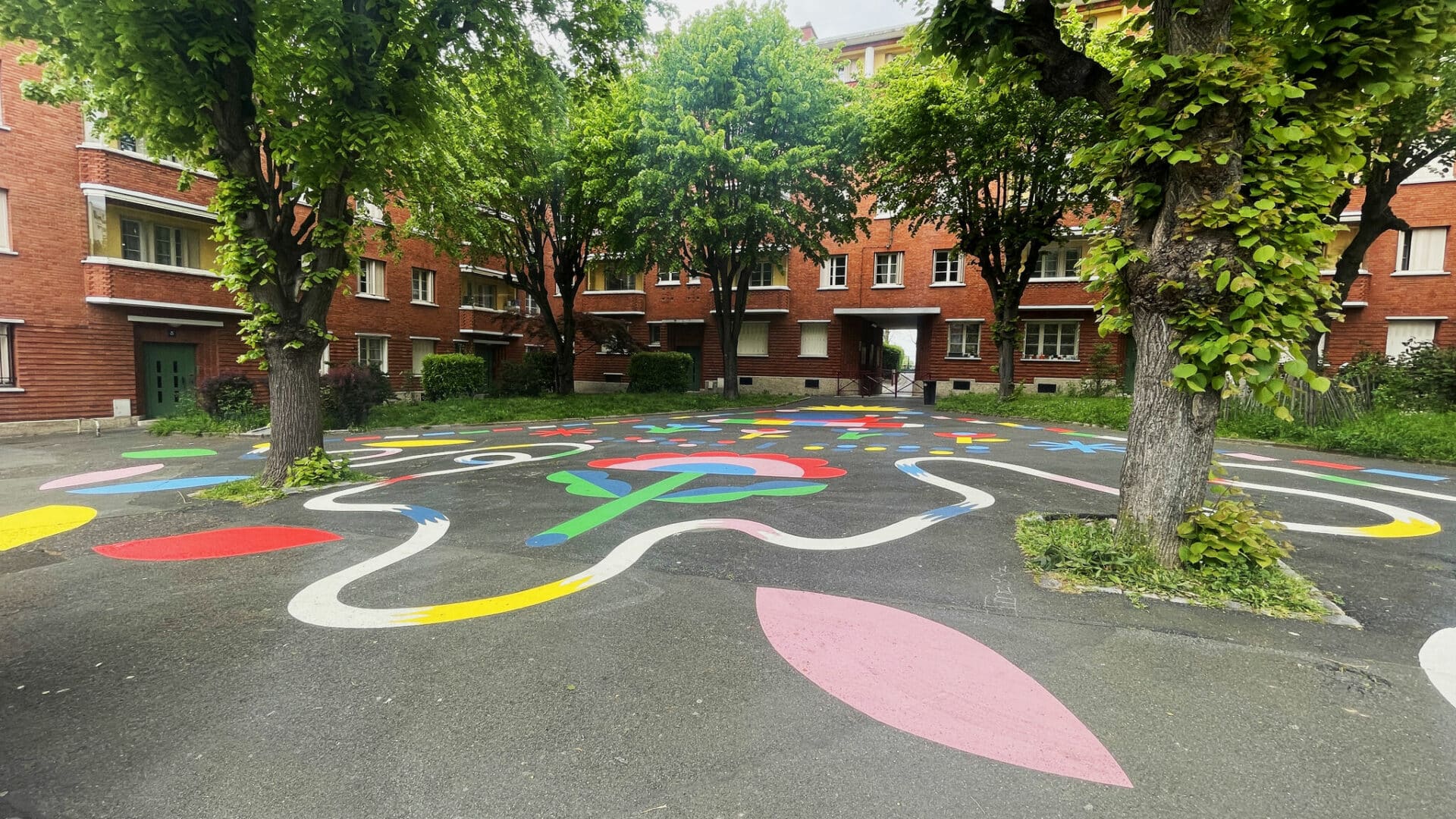 - Créativité et fresques au sol : nous concevons des tracés colorés et organiques qui relient les espaces de la cour, créent des parcours ludiques et incitent les enfants à courir, sauter et explorer. Ces fresques renforcent également l’identité visuelle de l’école et du quartier