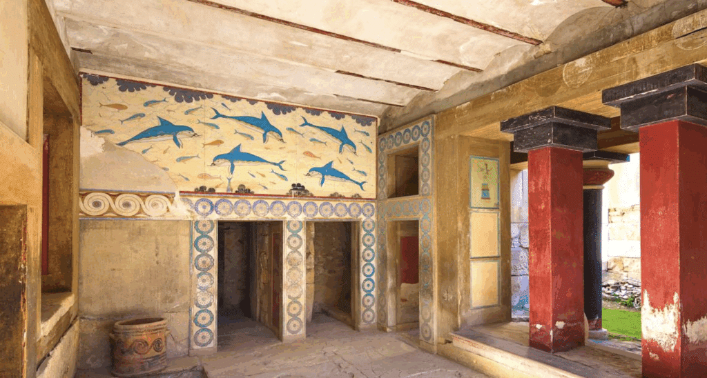 L’un des exemples les plus frappants se trouve dans le palais de Cnossos en Crète, construit par la civilisation minoenne vers 1900-1700 av. J.-C.. Ce vaste complexe, parfois surnommé le « labyrinthe » de Minos, utilisait déjà des codes visuels pour orienter les visiteurs. Les sols, les fresques murales et même la disposition des colonnes étaient pensés pour signaler des zones spécifiques et créer des repères sensoriels. Certaines fresques de dauphins, par exemple, identifiaient des espaces liés à la mer ou à la détente, tandis que des motifs géométriques récurrents marquaient des axes de circulation. L’art ne décorait pas seulement le palais, il participait directement à sa lisibilité et à la gestion des flux, dans un lieu immense et complexe.