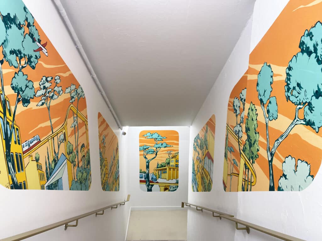 Avec l’artiste Florian Schneider, nous avons conçu des fresques artistiques peintes à la main directement dans le magasin, en lien avec les sports emblématiques portés par Intersport. En reprenant les couleurs de la marque et en illustrant ses valeurs comme le mouvement, l’esprit d’équipe ou l’engagement, l’œuvre offre une expérience graphique forte pour les visiteurs.