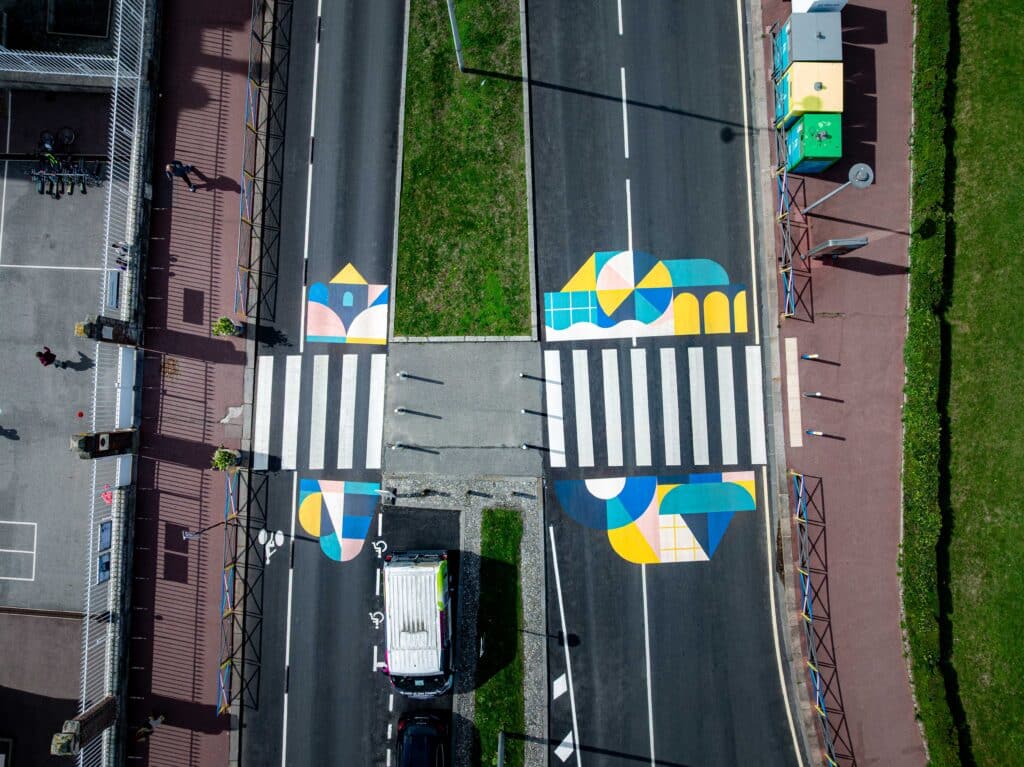 Sur un petit tronçon de la place, un motif a volontairement été laissé vide, pour que les enfants puissent venir le colorier à la craie. Une manière de leur permettre de s’approprier la place, de s’exprimer librement sur le domaine public, à travers l’art.