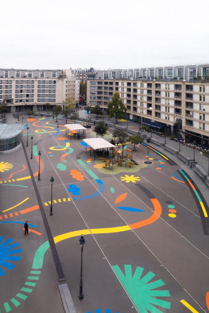 Cette fresque décorative fait écho aux nombreux éléments architecturaux de la place. L’œuvre renvoie aussi à la faune et la flore de la région.