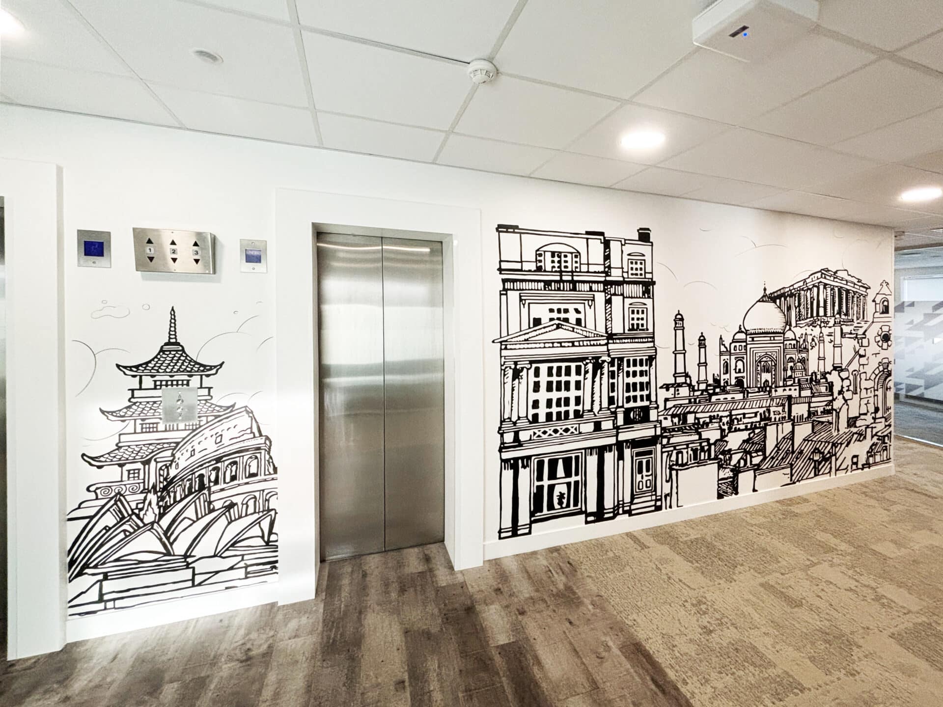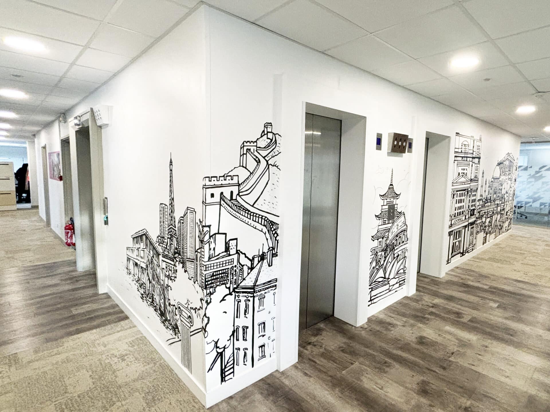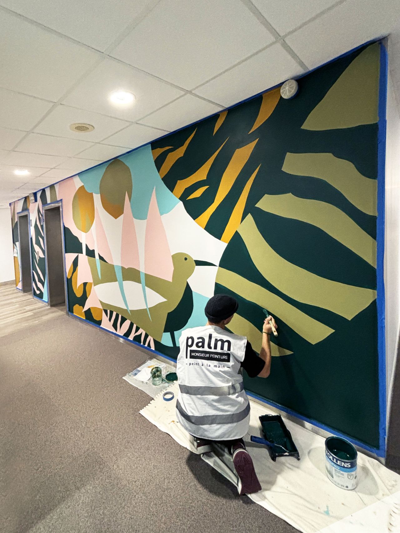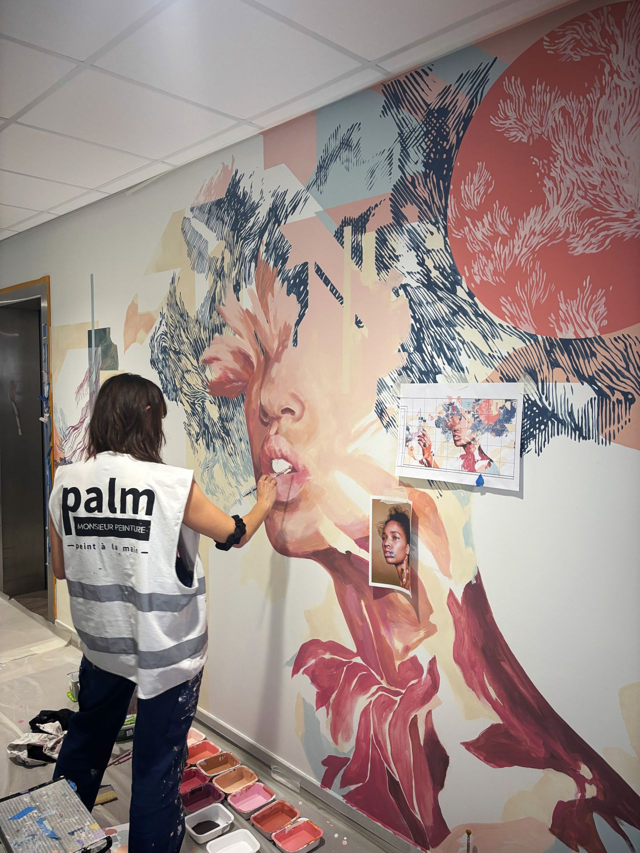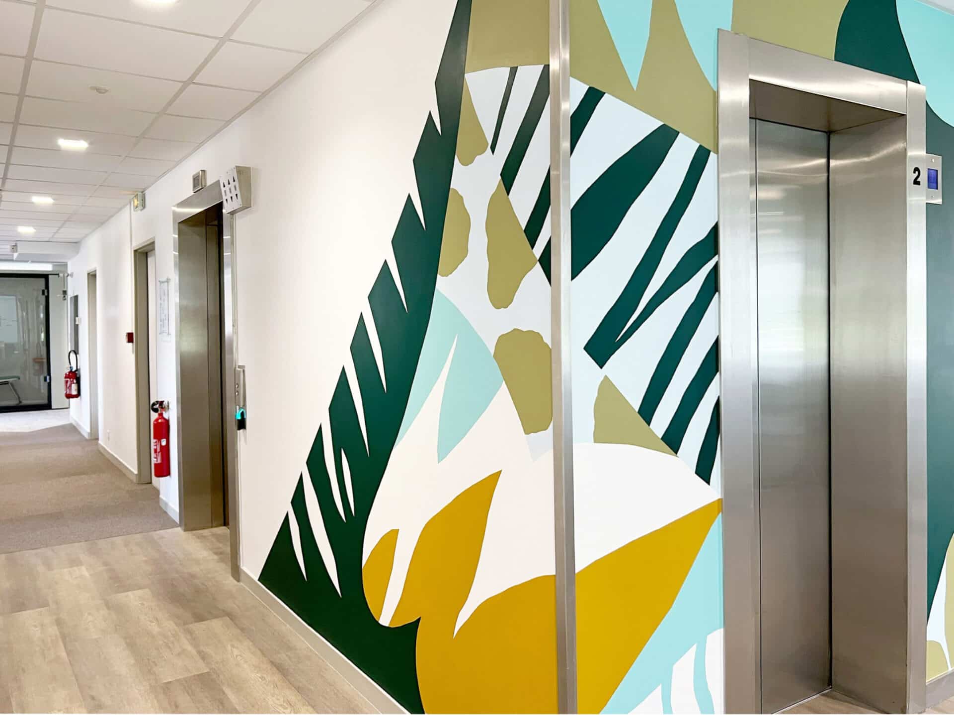 Ici on retrouve l’œuvre réalisée au siège social à Levallois-Perret. D’autres fresques artistiques suivront, à Marseille, Bordeaux, Bezannes…