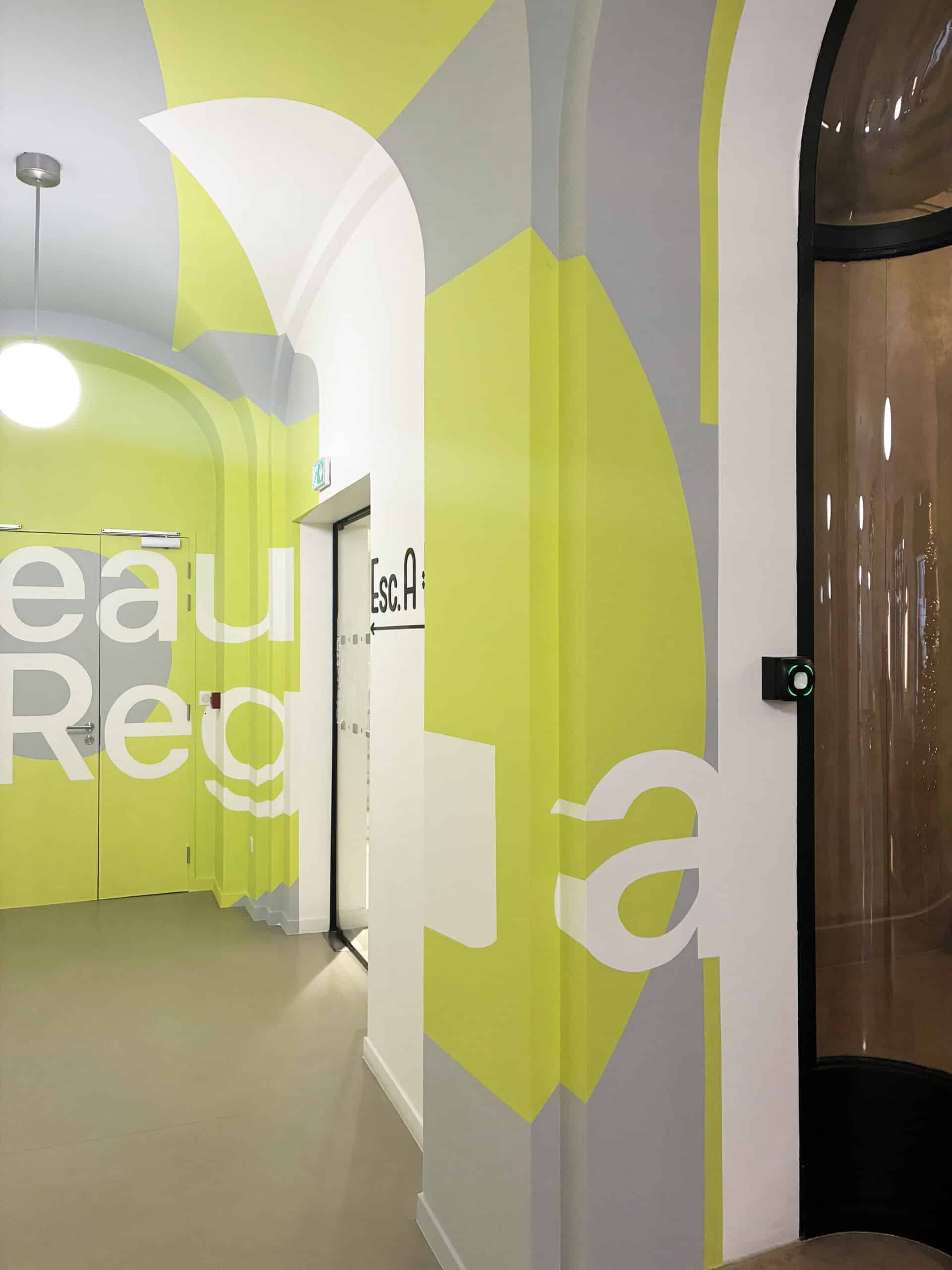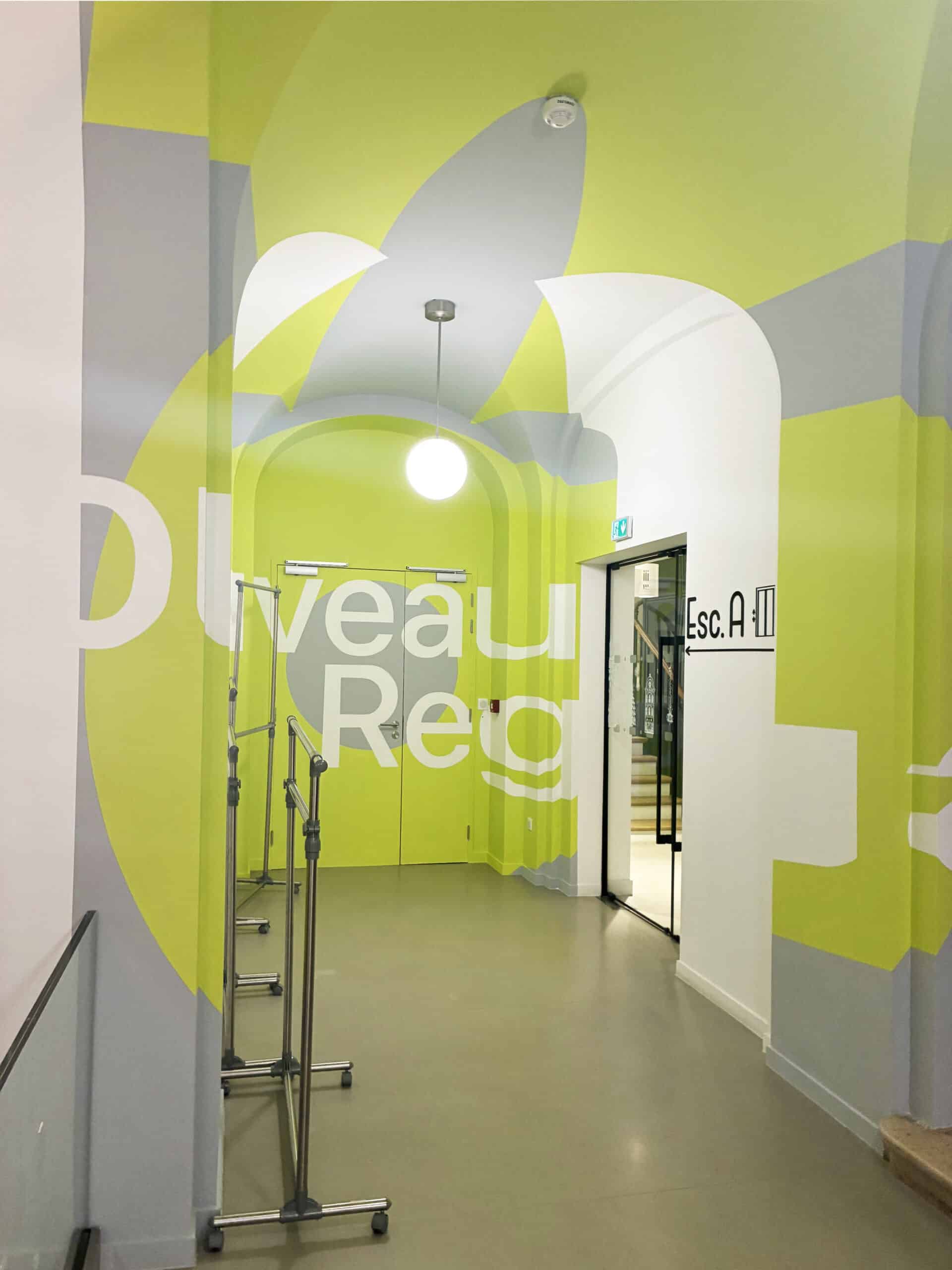 Mots-clés, couleurs de la charte et lignes graphiques : la fresque traduit les valeurs du cabinet en image. Ce jeu de perspective reprend l’identité visuelle de Capstan pour créer un décor moderne, impactant et accessible.