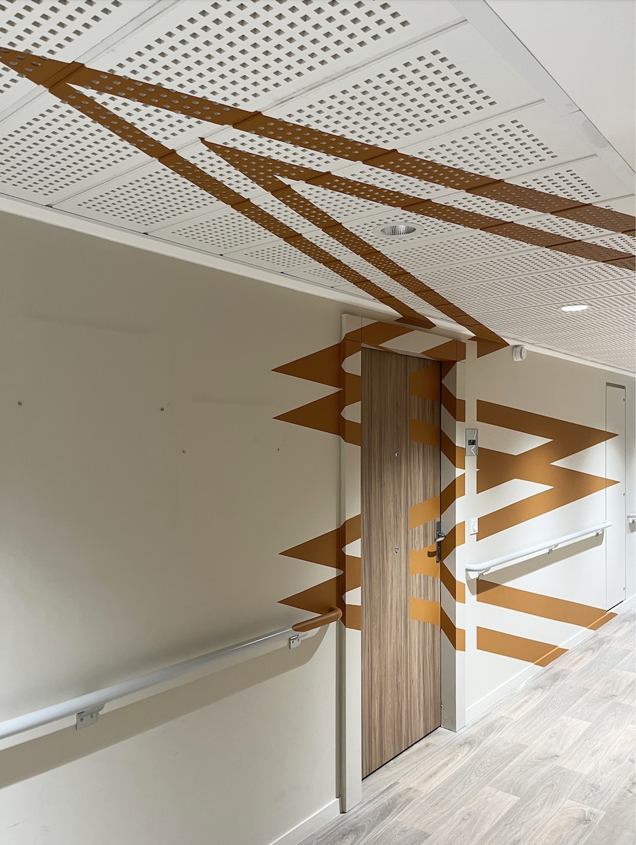 Les motifs et les couleurs, que nous avons développés en compagnie de l’artiste STO, s’inspirent directement de la charte graphique imaginée par l’architecte du projet. Une manière d’ancrer l’œuvre dans son contexte, tout en affirmant une identité forte et accueillante.