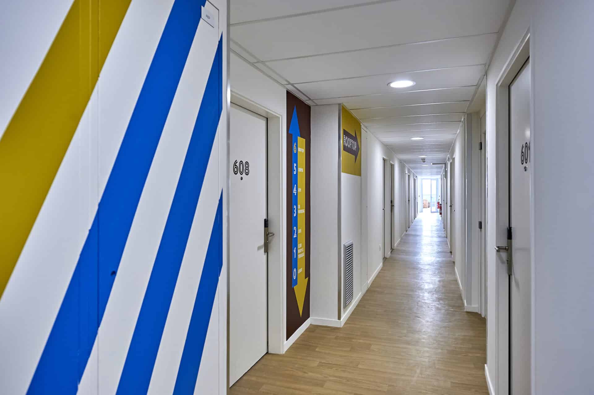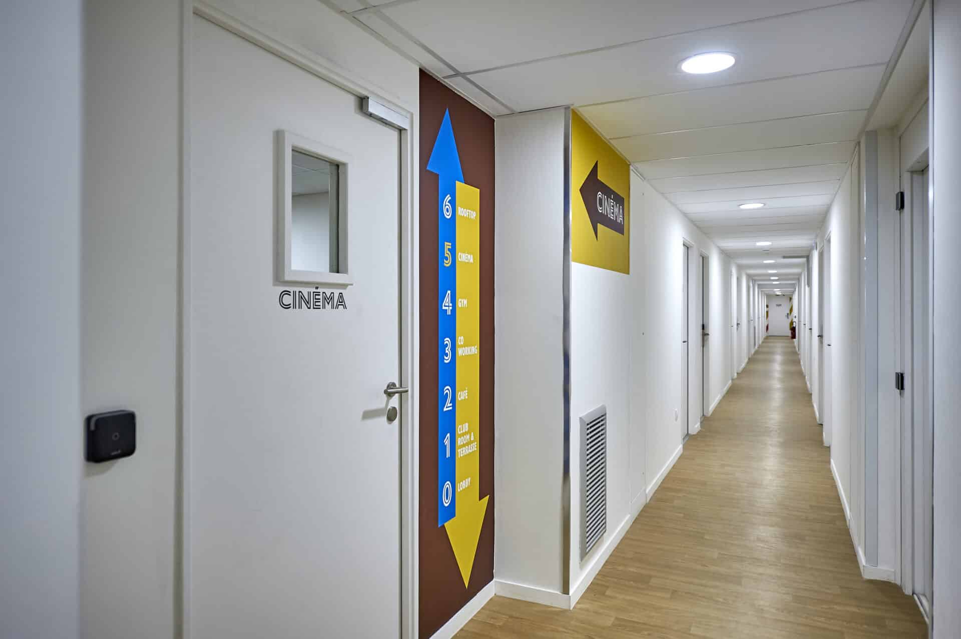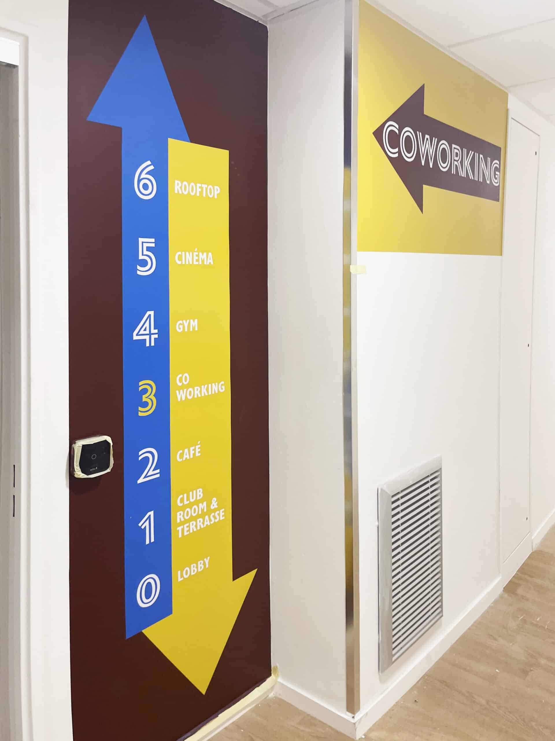 Derrière l’apparente simplicité, un chantier d’envergure mené en un temps record : signalétique peinte à la main dans les longs couloirs, sur des centaines de portes et dans des dizaines d’espaces clés. Six étages transformés en trois semaines, pour un résultat premium, durable et authentique.