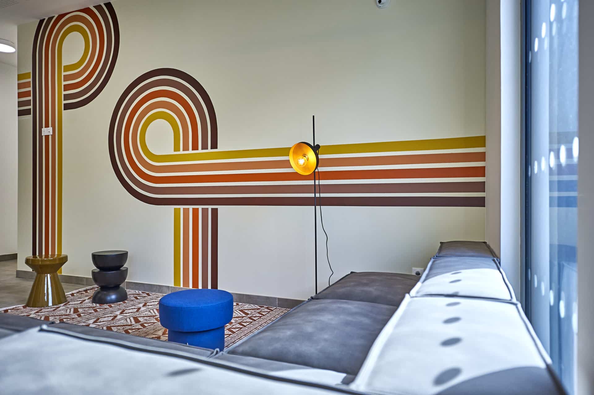 Formes fluides et couleurs chaudes, des oranges aux bruns, installent une identité nette et immersive. Tous les espaces ont été habillés à la main, dans une reproduction précise de chaque motif.