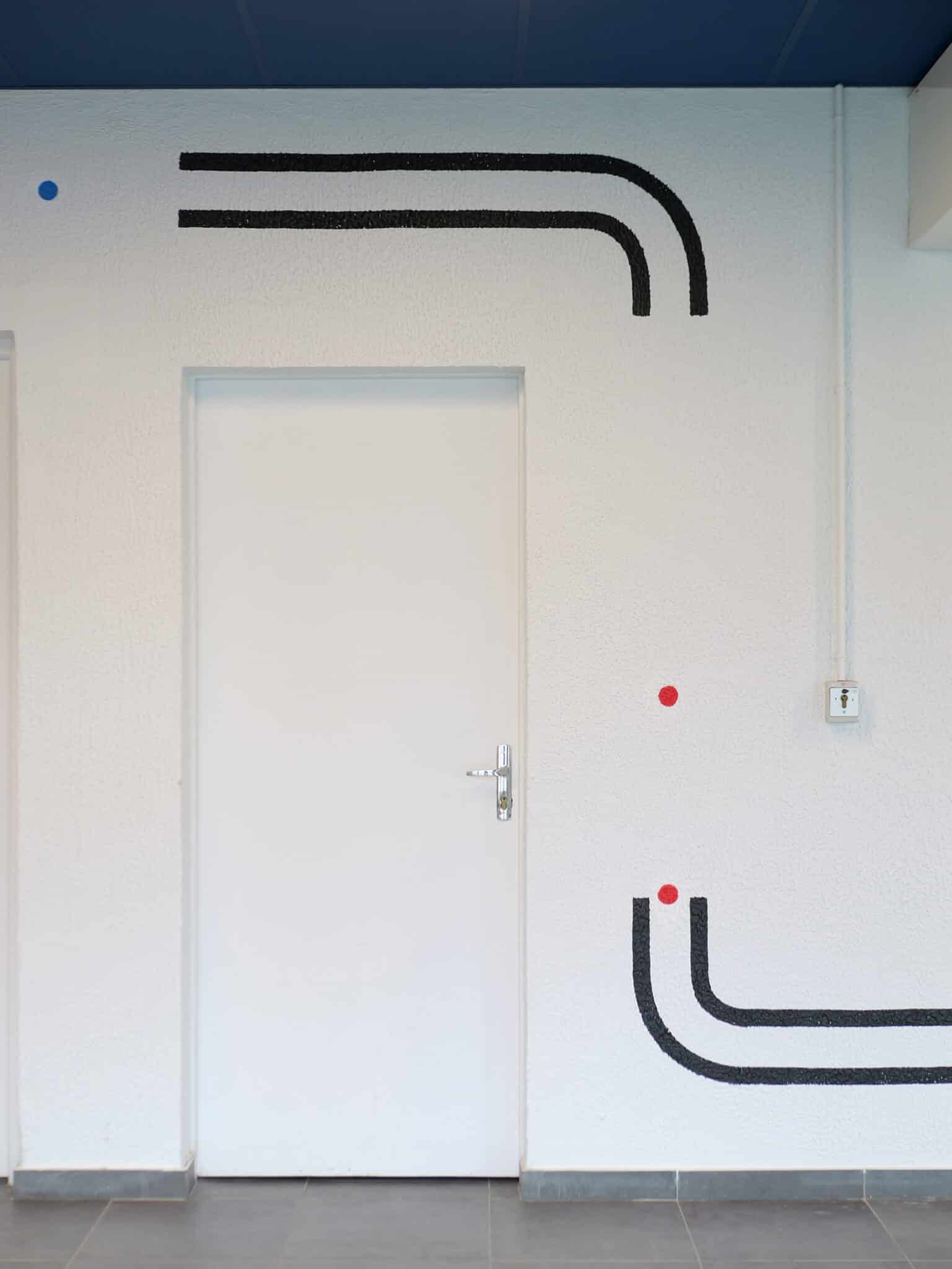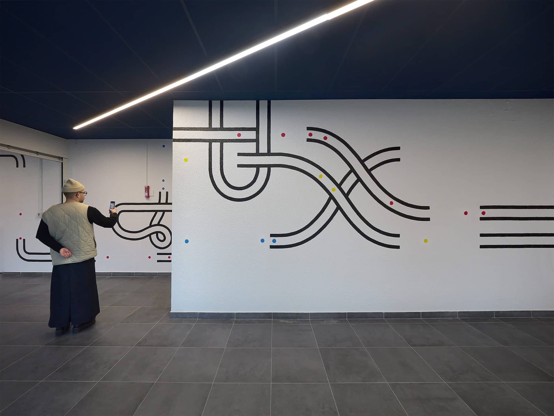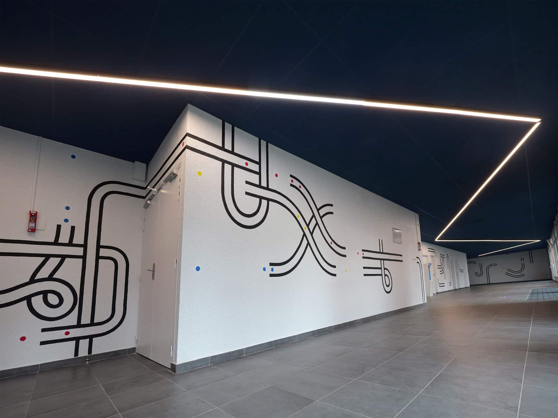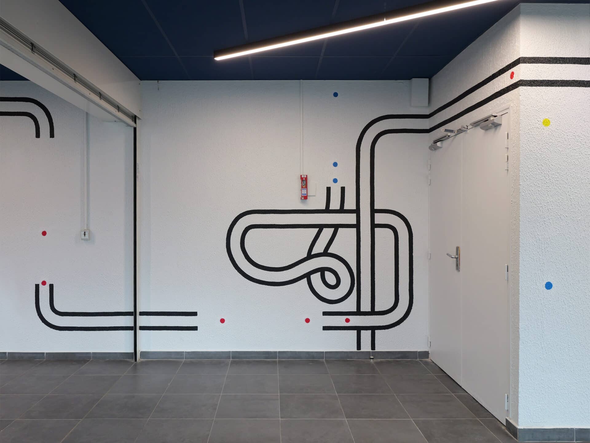 Avec Jeu de Piste, l’artiste déploie un réseau de lignes, de chemins et de “billes” de couleur inspirés des cartes urbaines. La fresque se densifie ou s’allège selon les murs, en écho à l’architecture, pour guider le regard et rythmer la circulation.