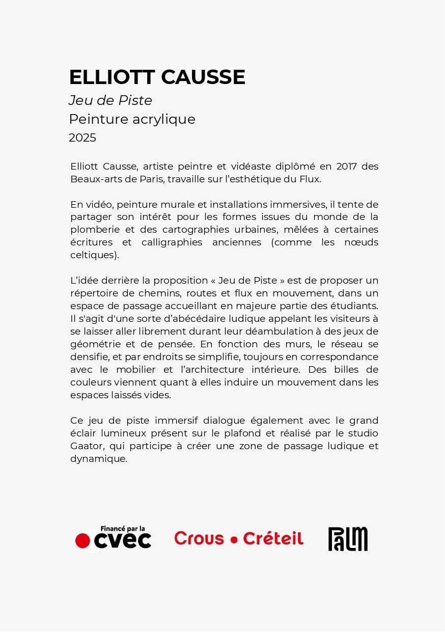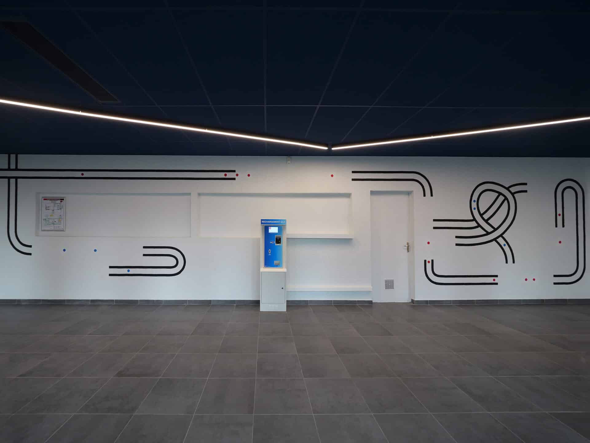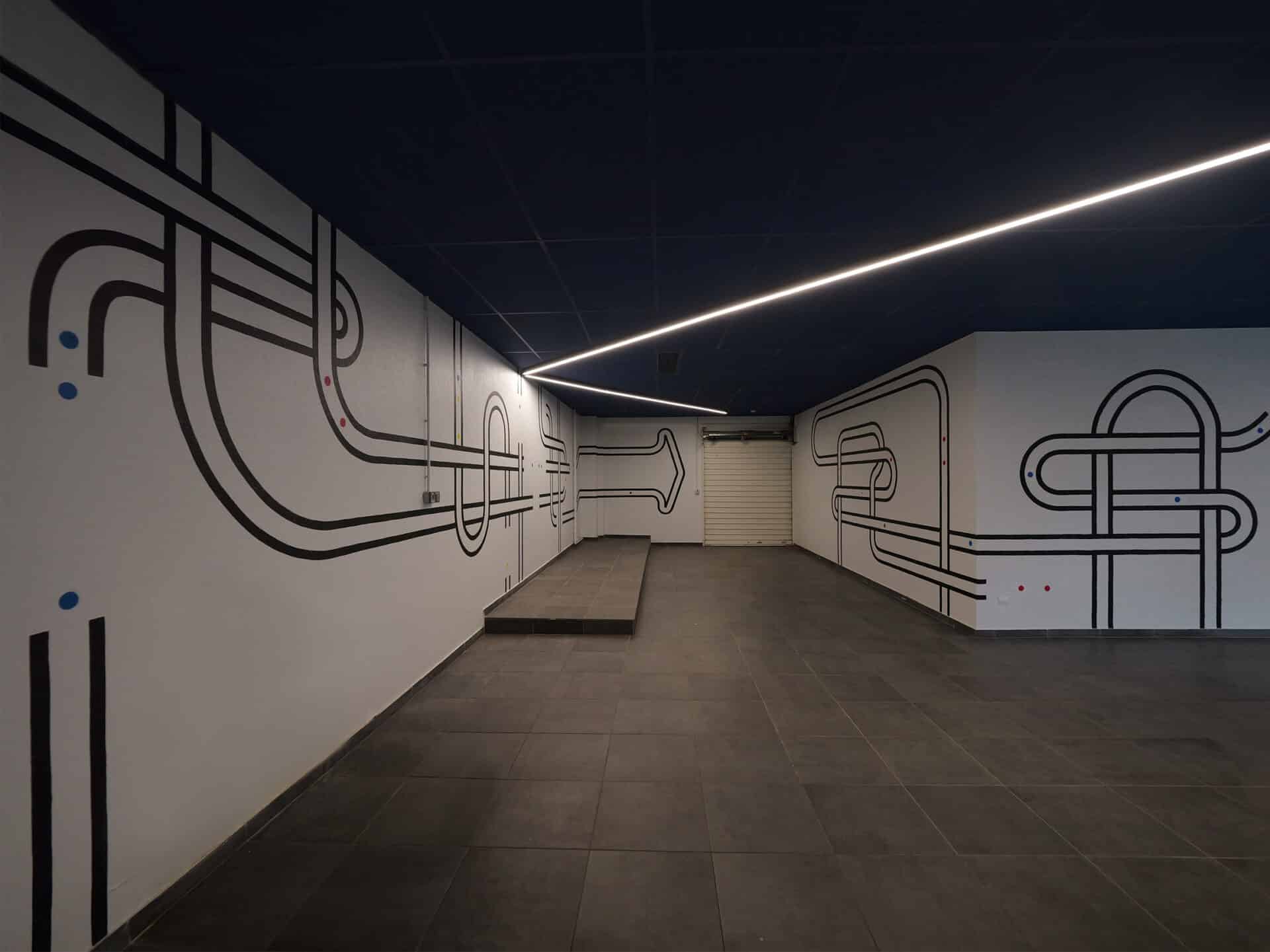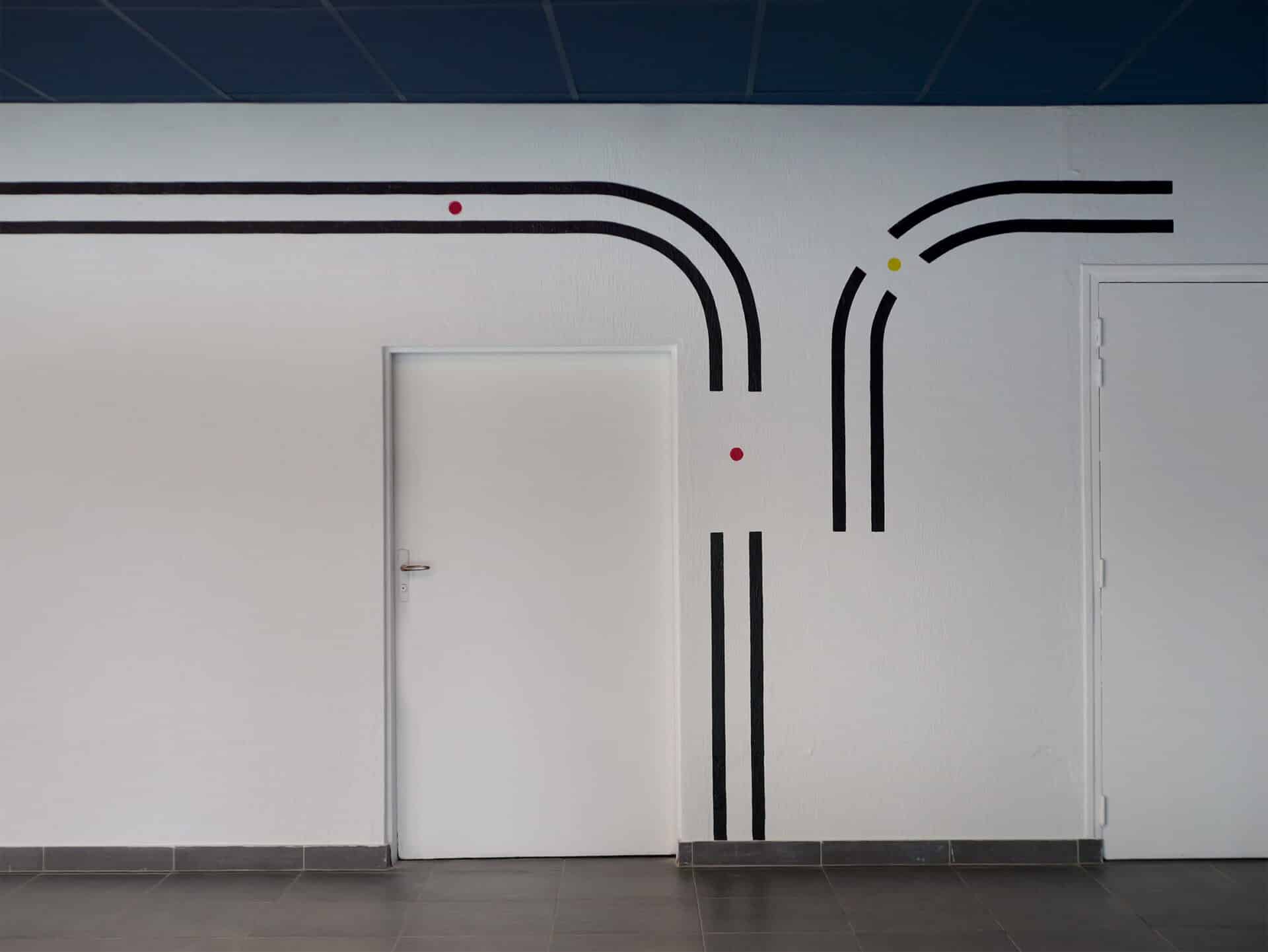 Avec Jeu de Piste, l’artiste déploie un réseau de lignes, de chemins et de “billes” de couleur inspirés des cartes urbaines. La fresque se densifie ou s’allège selon les murs, en écho à l’architecture, pour guider le regard et rythmer la circulation.