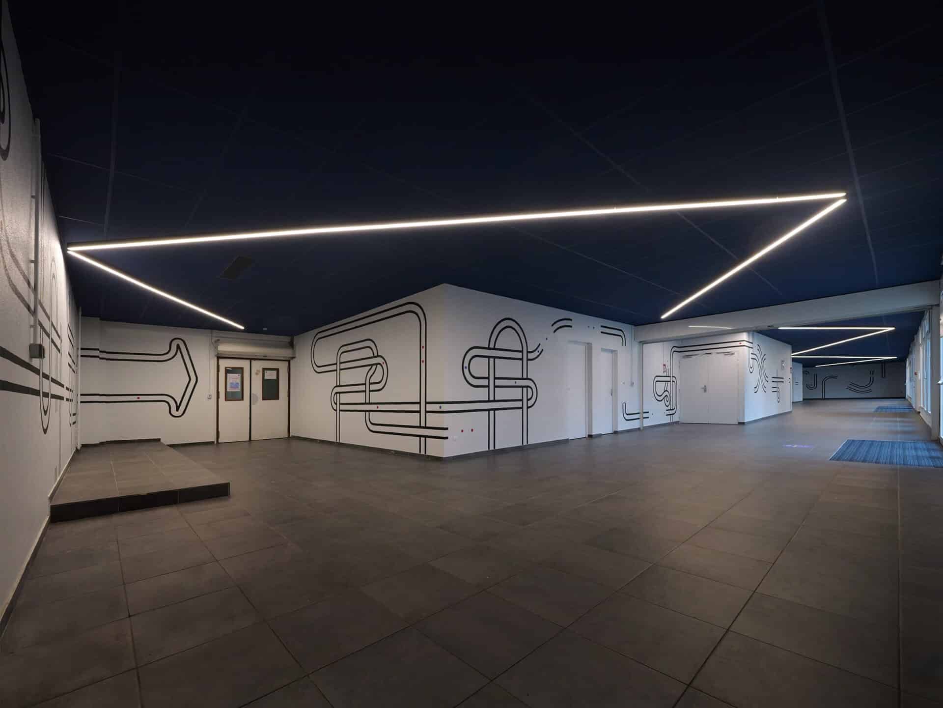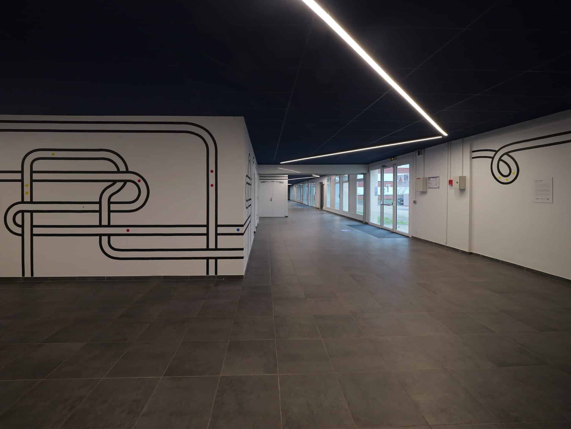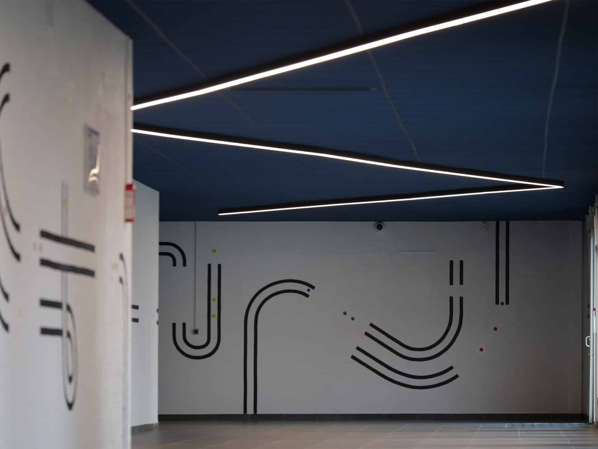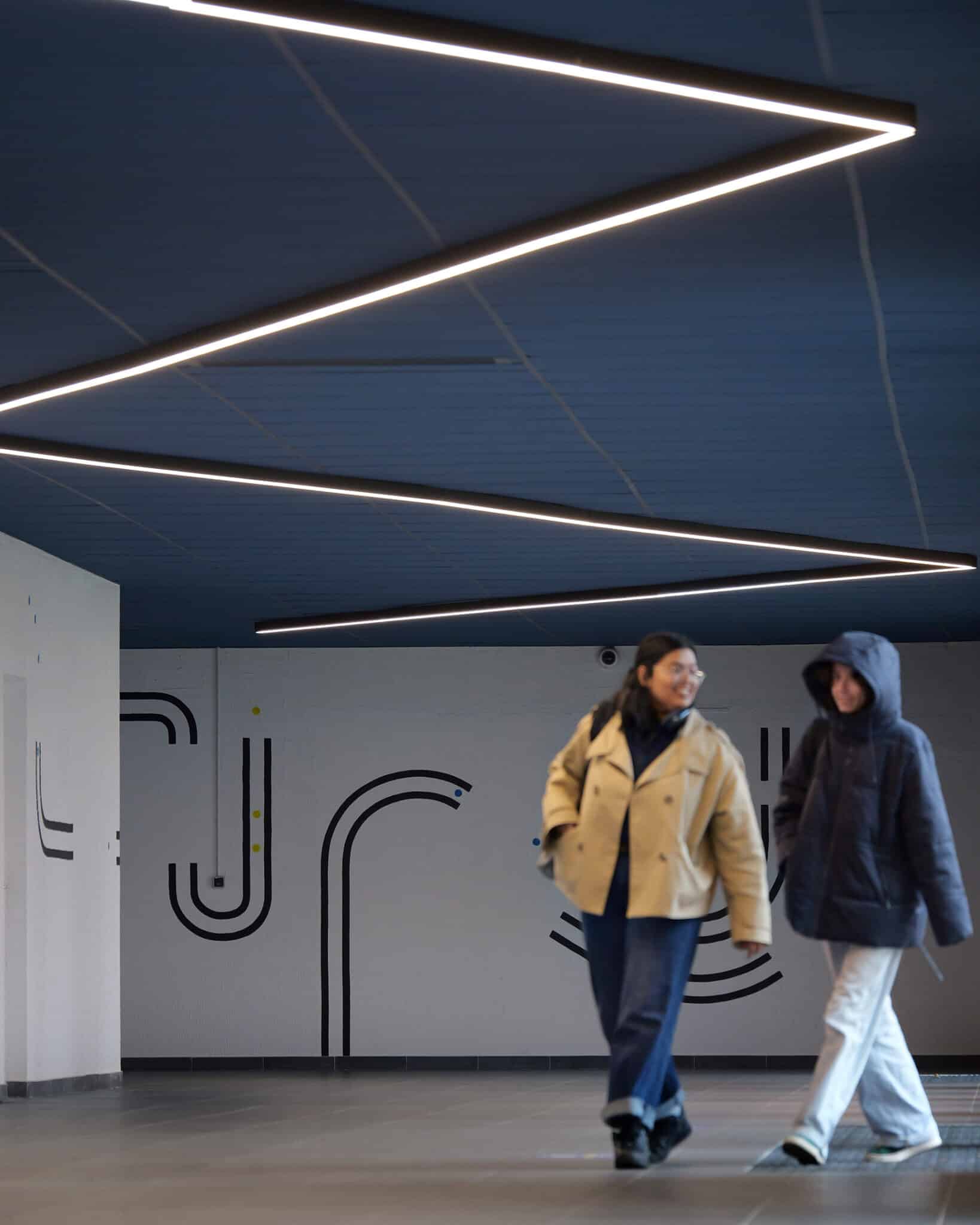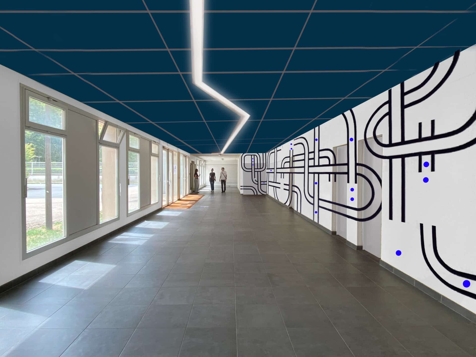 En dialogue avec le grand éclair lumineux du plafond, l’œuvre fait de ce couloir une zone de passage vivante et dynamique, où l’art accompagne concrètement les déplacements des étudiants.
