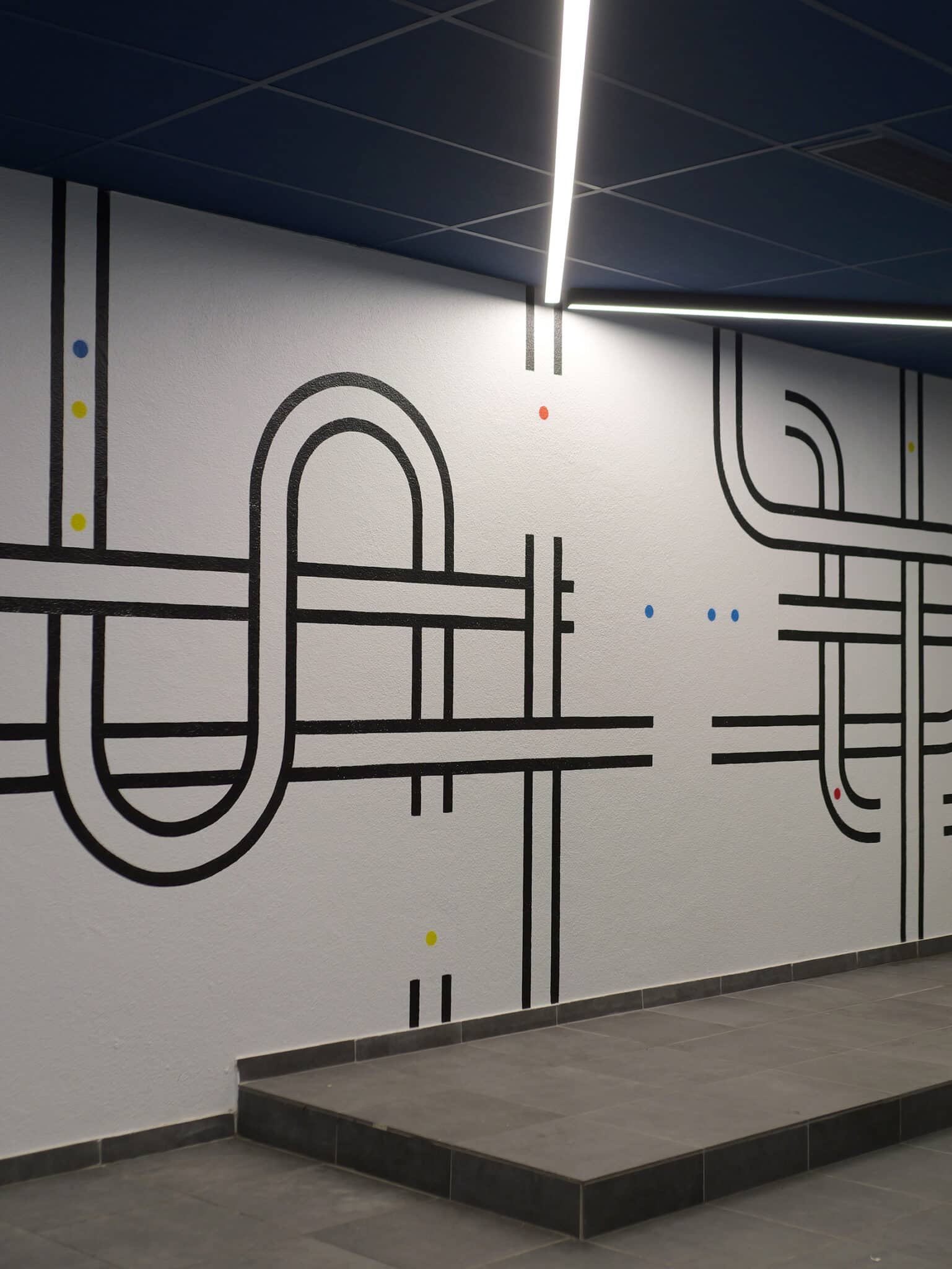 Avec l’artiste Elliott Causse, nous avons créé « Jeu de Piste », une fresque qui déploie des lignes, des chemins et des billes de couleur inspirés des cartes urbaines. Le motif se densifie ou s’allège selon l’architecture pour guider le regard, rythmer la circulation et accompagner les usages du quotidien à travers une approche graphique et contemporaine.