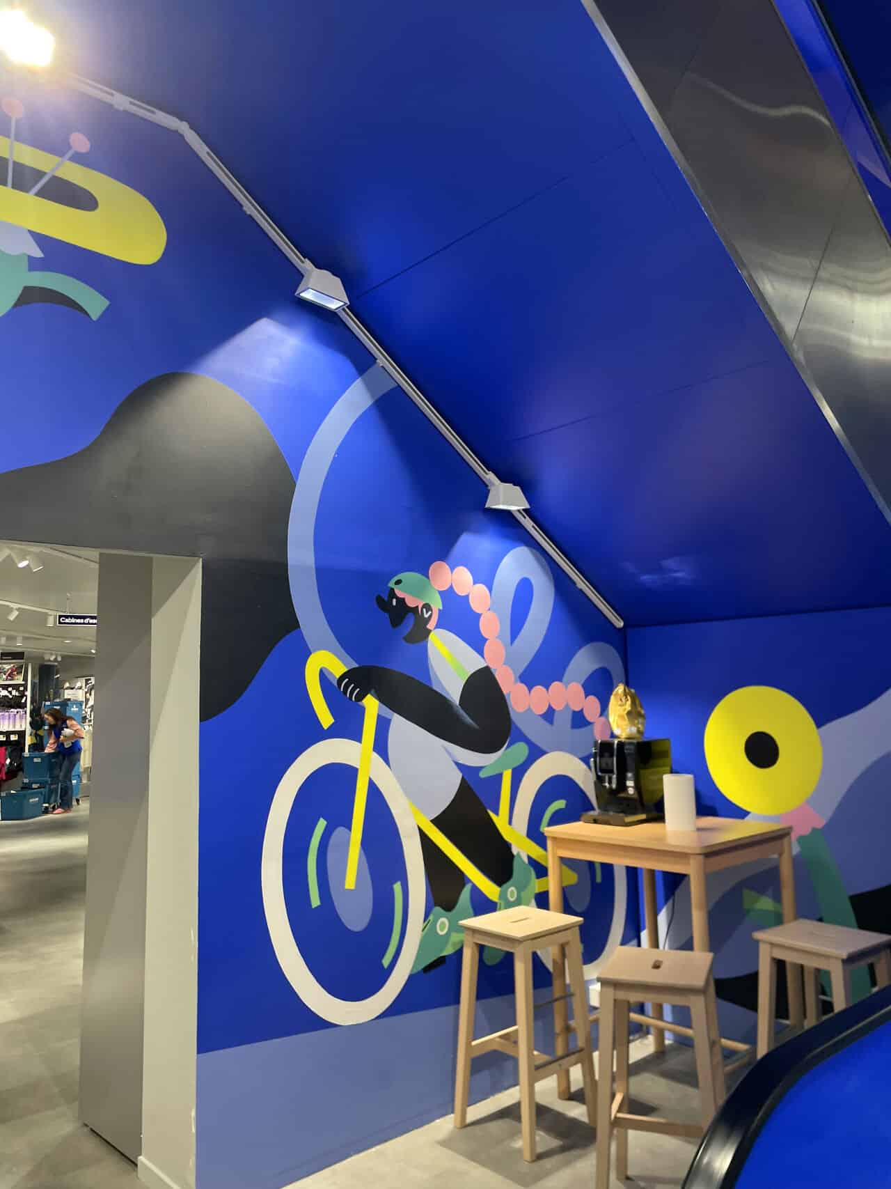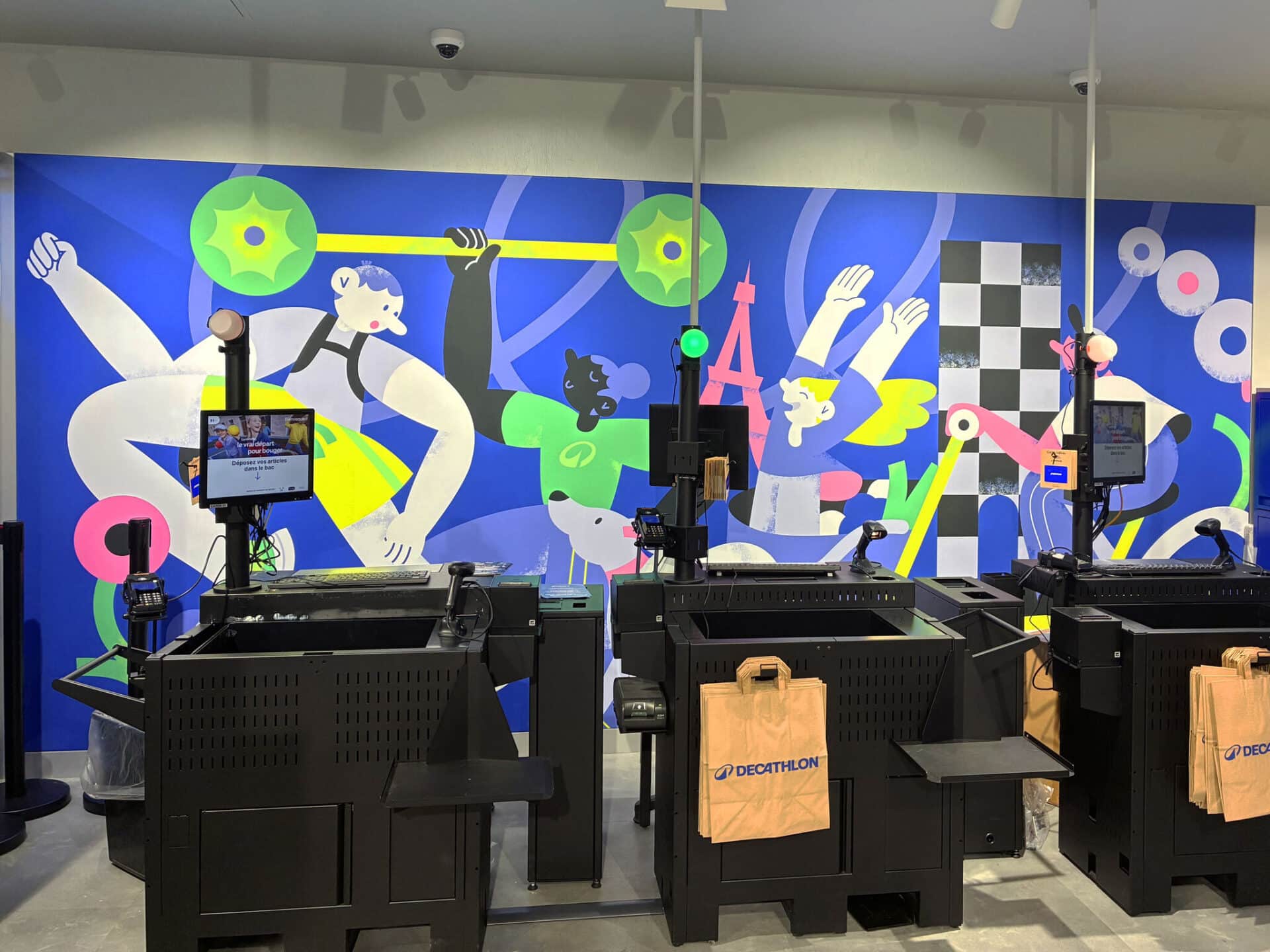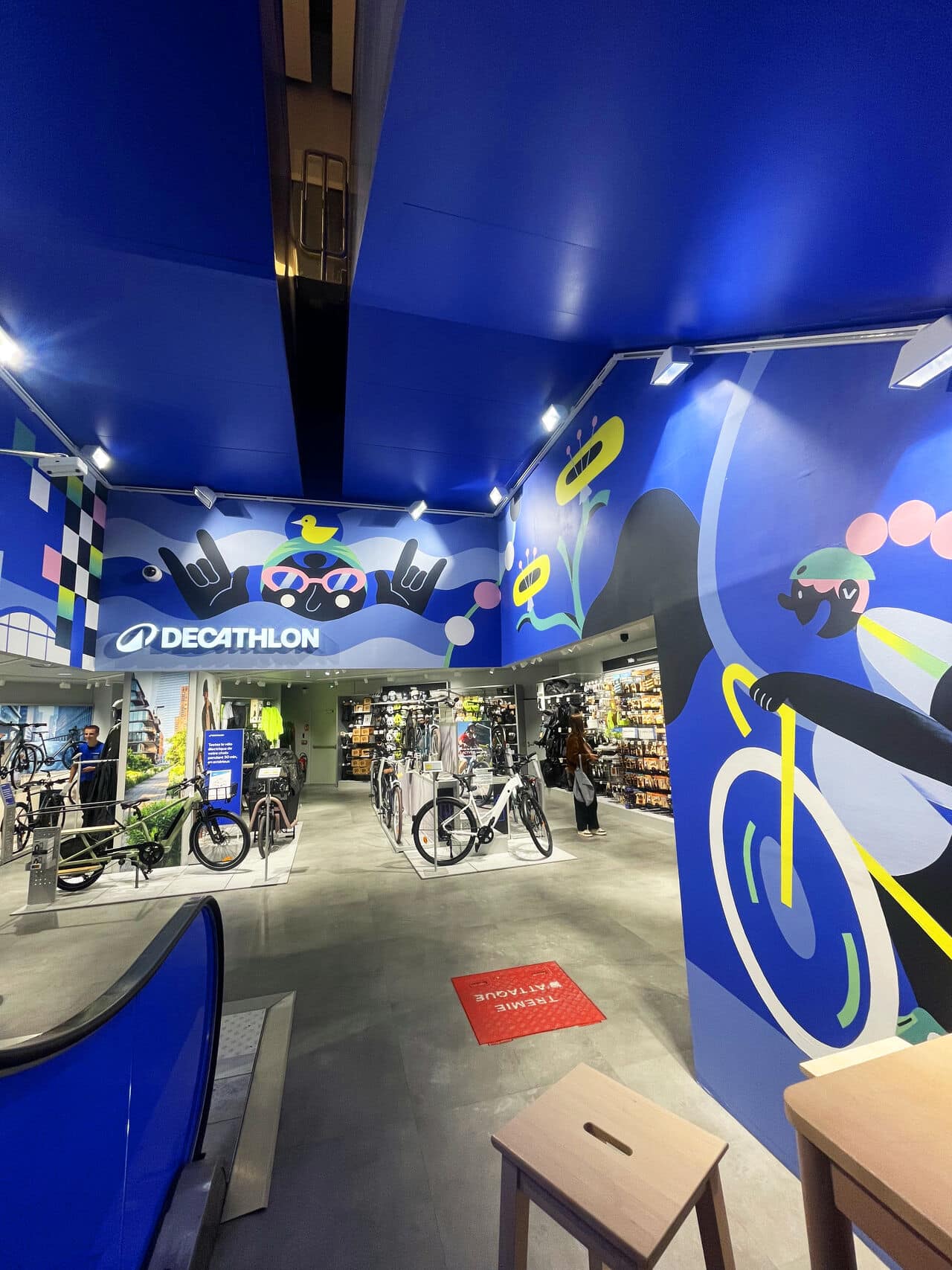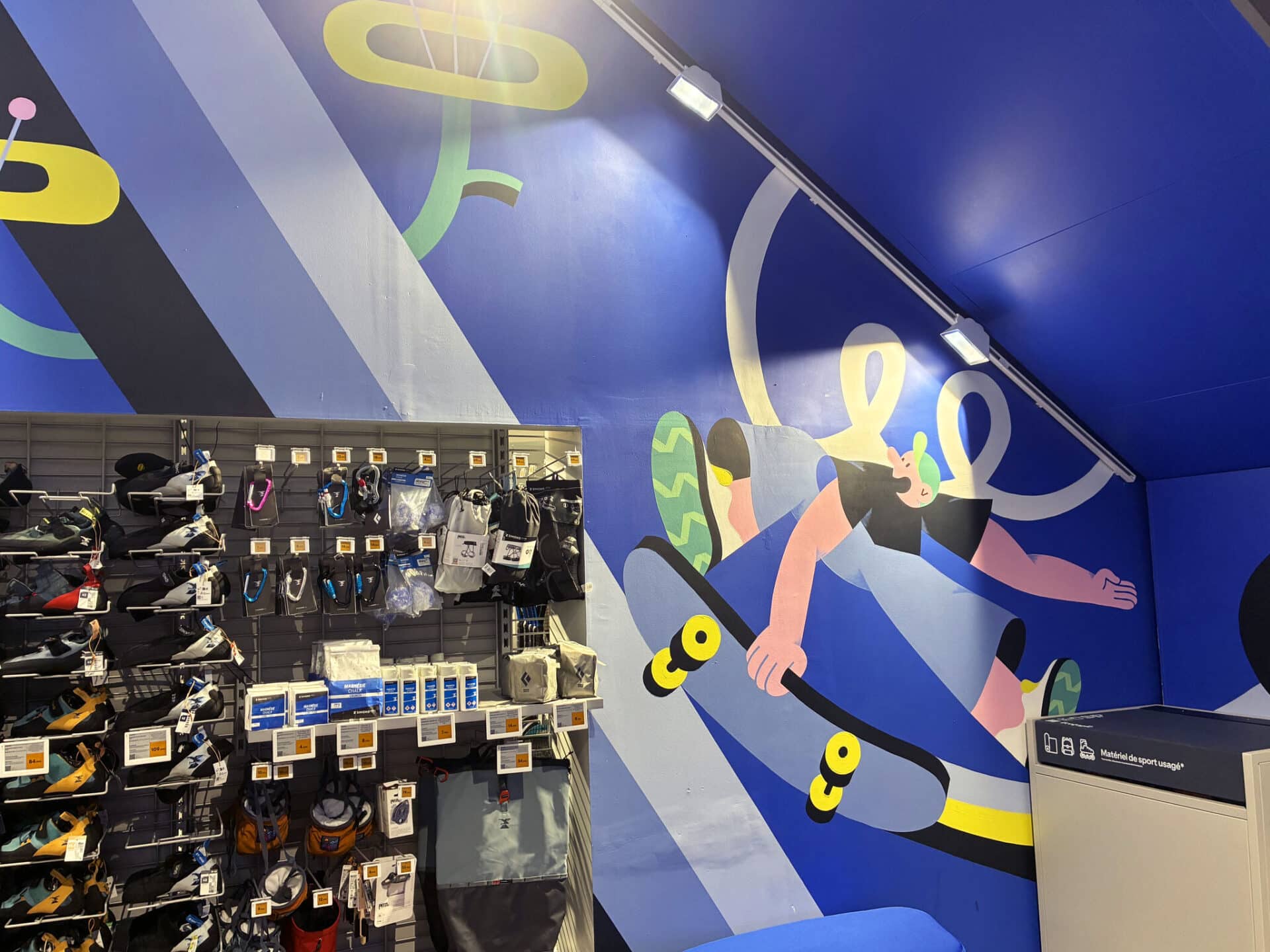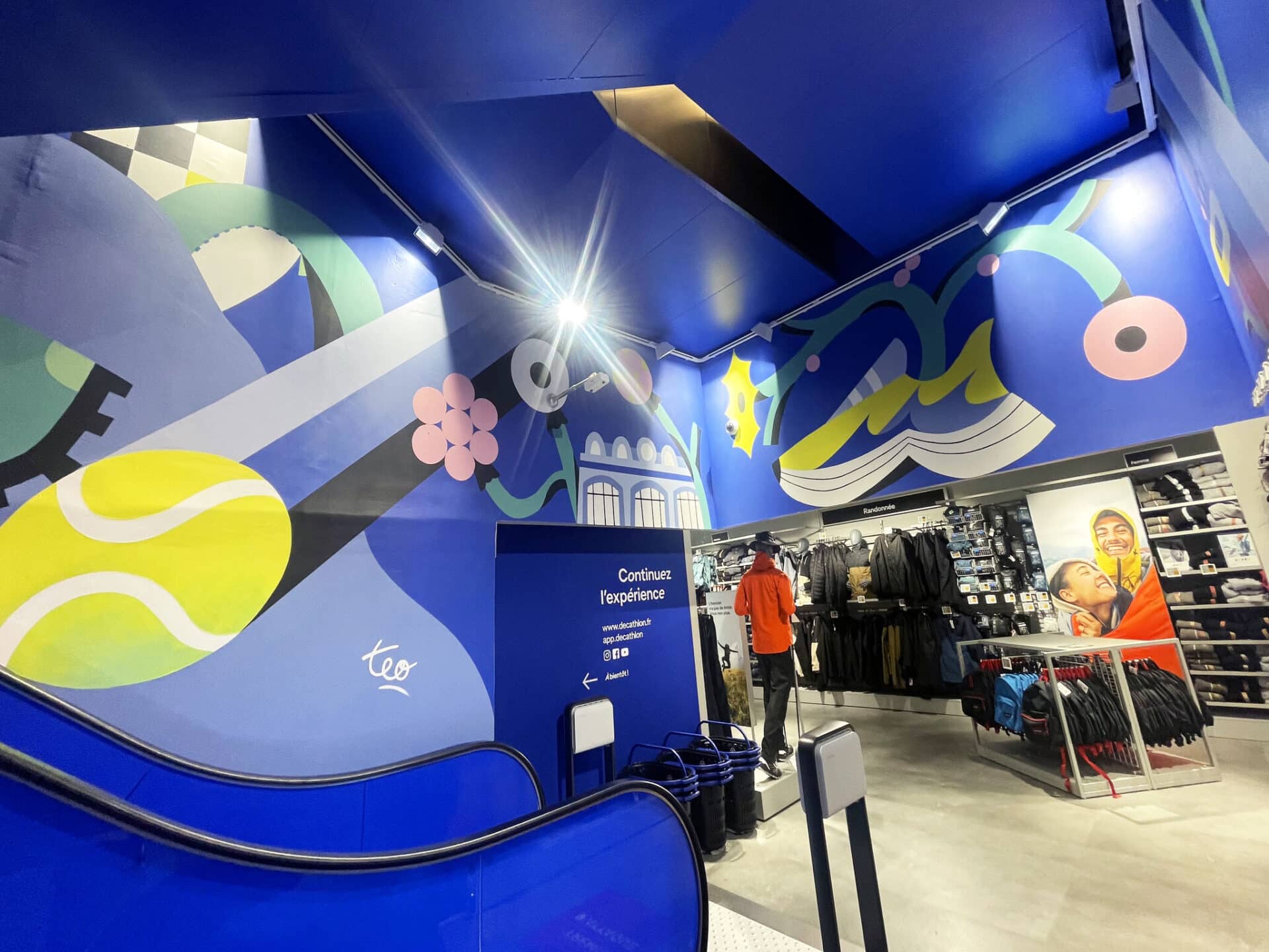 Pour le nouveau magasin Décathlon Montparnasse, l’intervention est signée Théo Le Roux. Son univers est ludique, optimiste et accessible : personnages minimalistes, formes simples, couleurs franches. Inspiré par la nature, les comportements humains et la notion de relation, il conçoit des œuvres qui créent du lien et transmettent une énergie positive. En mêlant peinture, illustration et arts numériques (mapping vidéo), il transforme l’espace en une expérience ouverte et accueillante, tournée vers le partage. En l’invitant au cœur du magasin, nous affirmons que le commerce peut aussi être un terrain d’expression culturelle.