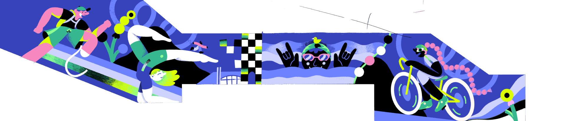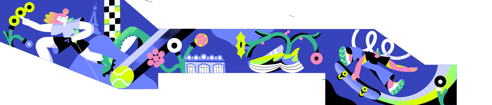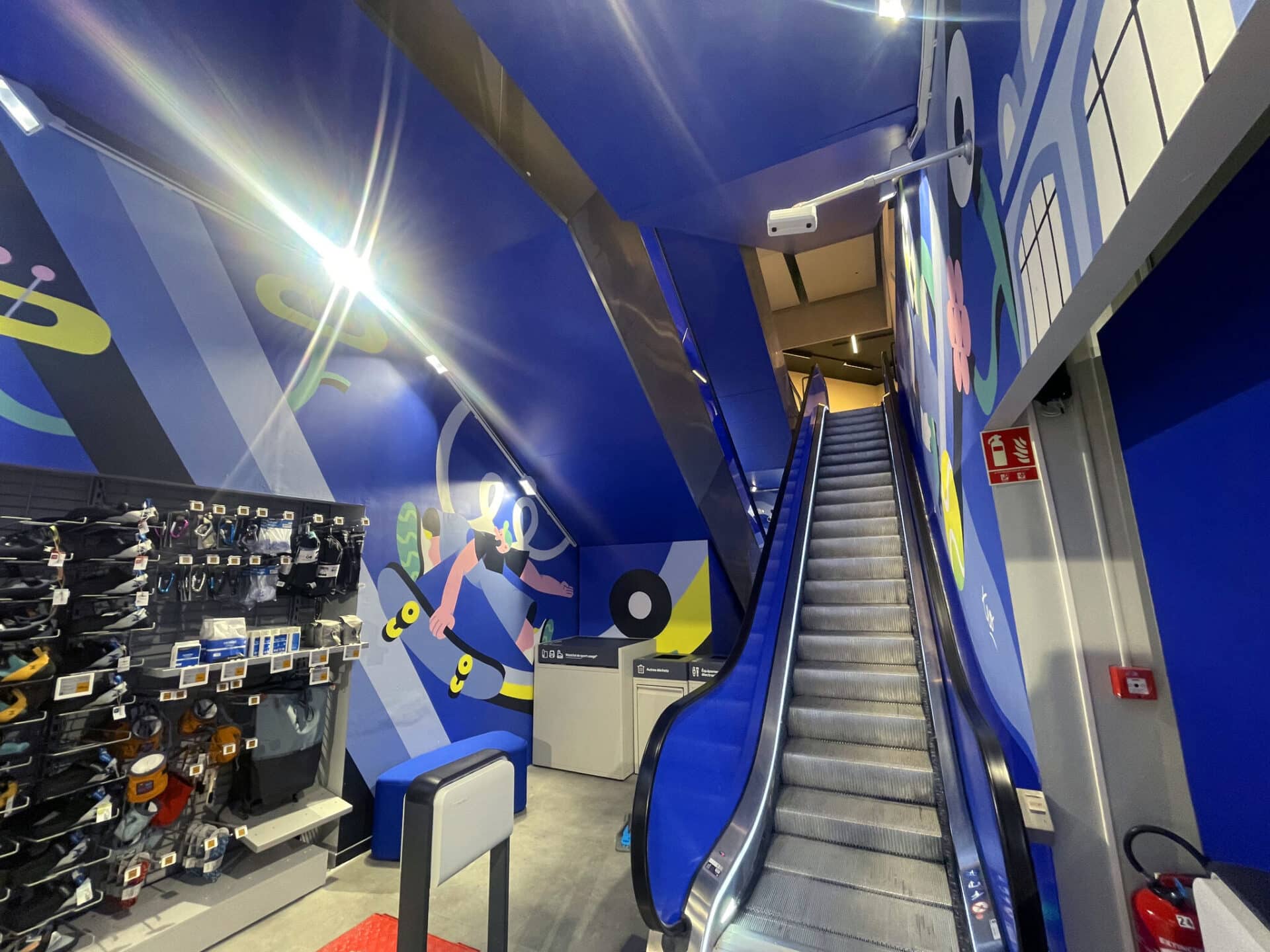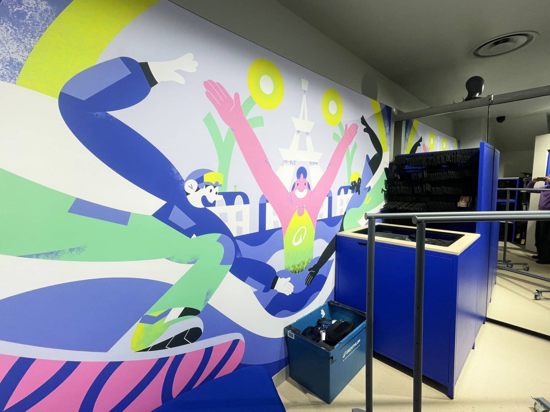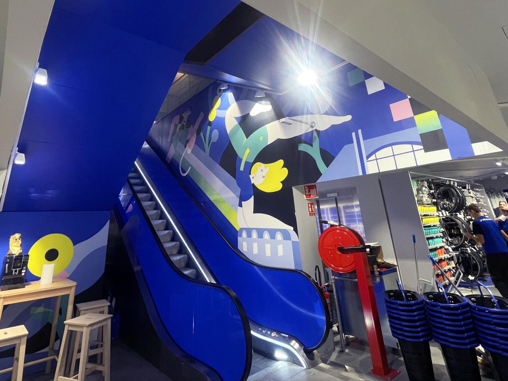 Pour le nouveau magasin Décathlon Montparnasse, l’intervention est signée Théo Le Roux. Son univers est ludique, optimiste et accessible : personnages minimalistes, formes simples, couleurs franches. Inspiré par la nature, les comportements humains et la notion de relation, il conçoit des œuvres qui créent du lien et transmettent une énergie positive. En mêlant peinture, illustration et arts numériques (mapping vidéo), il transforme l’espace en une expérience ouverte et accueillante, tournée vers le partage. En l’invitant au cœur du magasin, nous affirmons que le commerce peut aussi être un terrain d’expression culturelle.