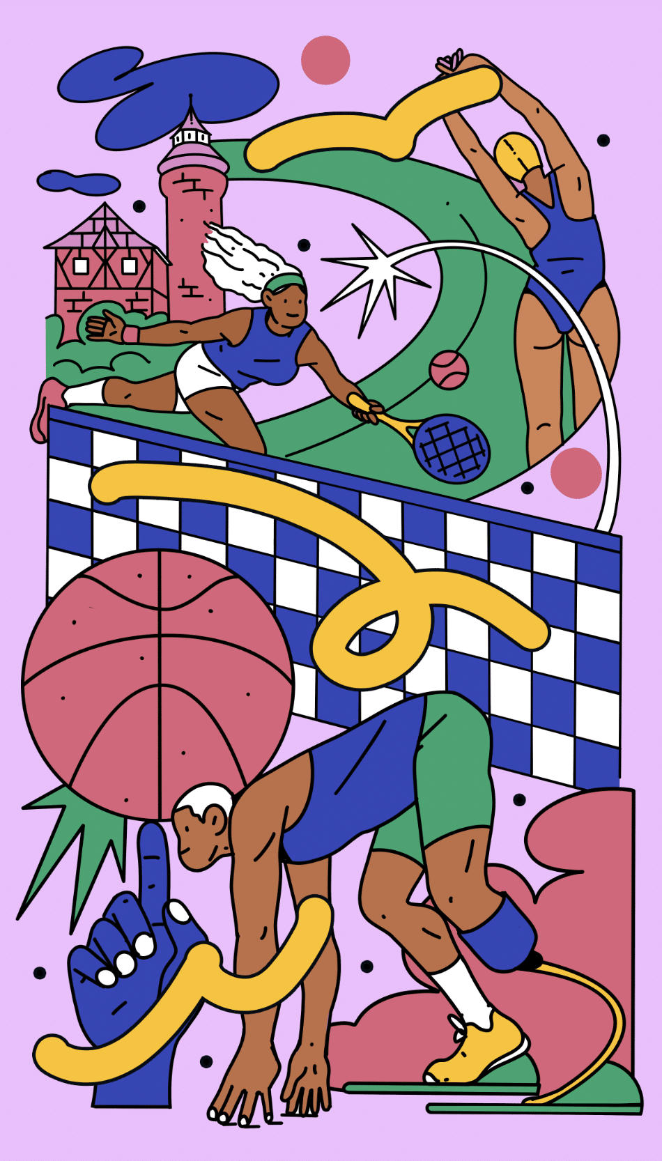 La fresque imaginée par l’artiste Gizem Erdem vient injecter de l’énergie dans la cage d’escalier : silhouettes sportives, formes géométriques, lignes inspirées des terrains et du design urbain. Un univers joyeux et accessible, connecté aux valeurs du sport : mouvement, jeu, diversité, collectif.
