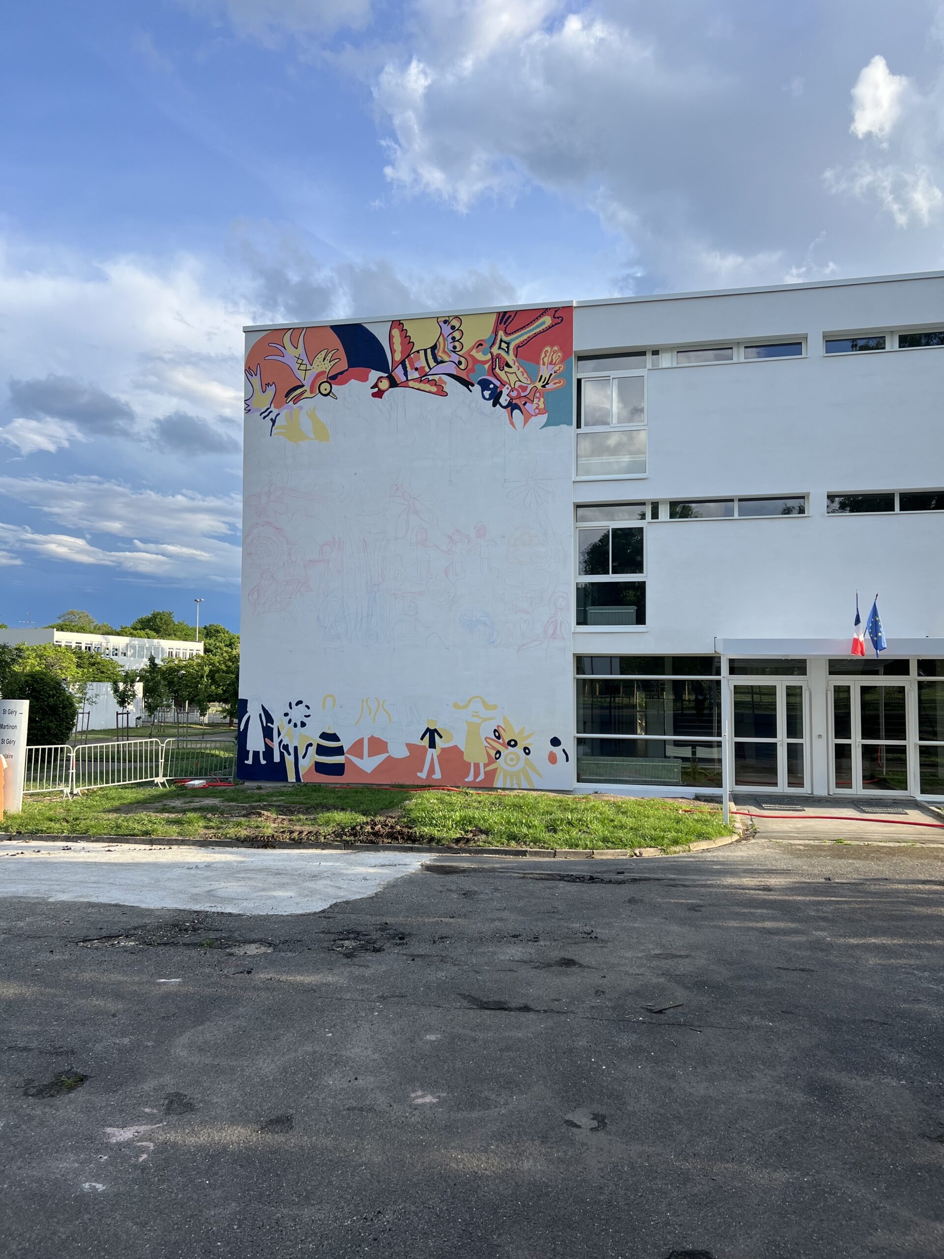 Aux côtés de l’artiste Nawel BOUSSOURI, nous avons imaginé une direction artistique respectueuse des formes initiales, mais repensée dans une palette plus vive et contemporaine. Résultat : une fresque psychédélique, joyeuse et vibrante, en écho au dessin des enfants et à l’ambiance de la cour de récré.