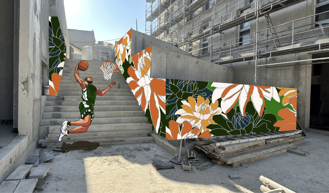 En complément, un motif floral a été réalisé à proximité, créant un dialogue entre sport, culture locale et végétalisation. Les couleurs de la fresque, inspirées de la charte chromatique de la ville, permettent une meilleure intégration dans le paysage urbain et renforcent l’identité du lieu.