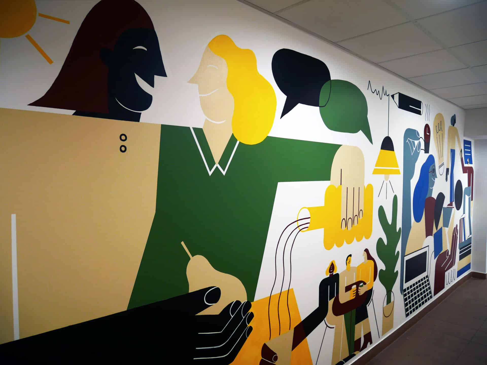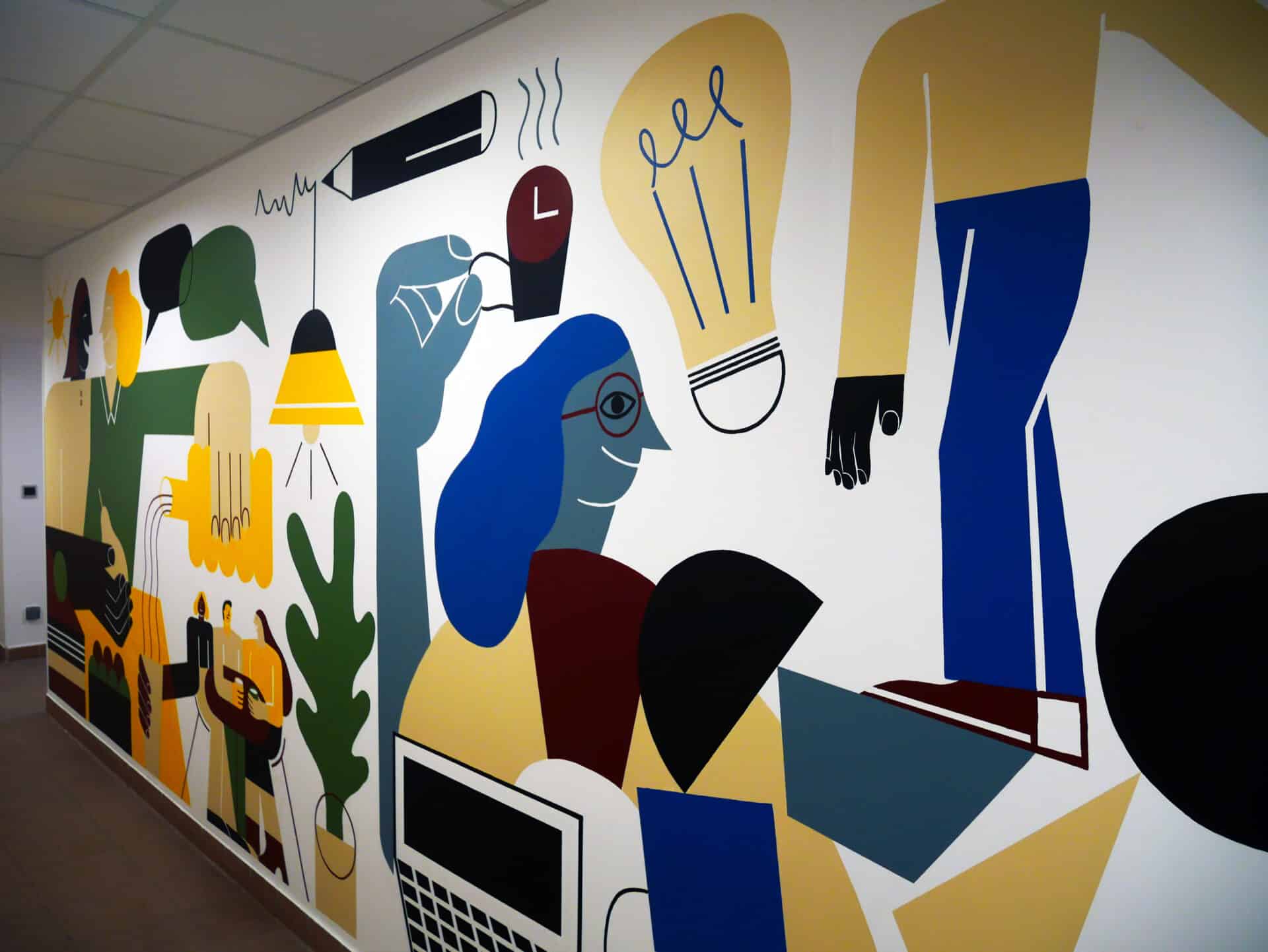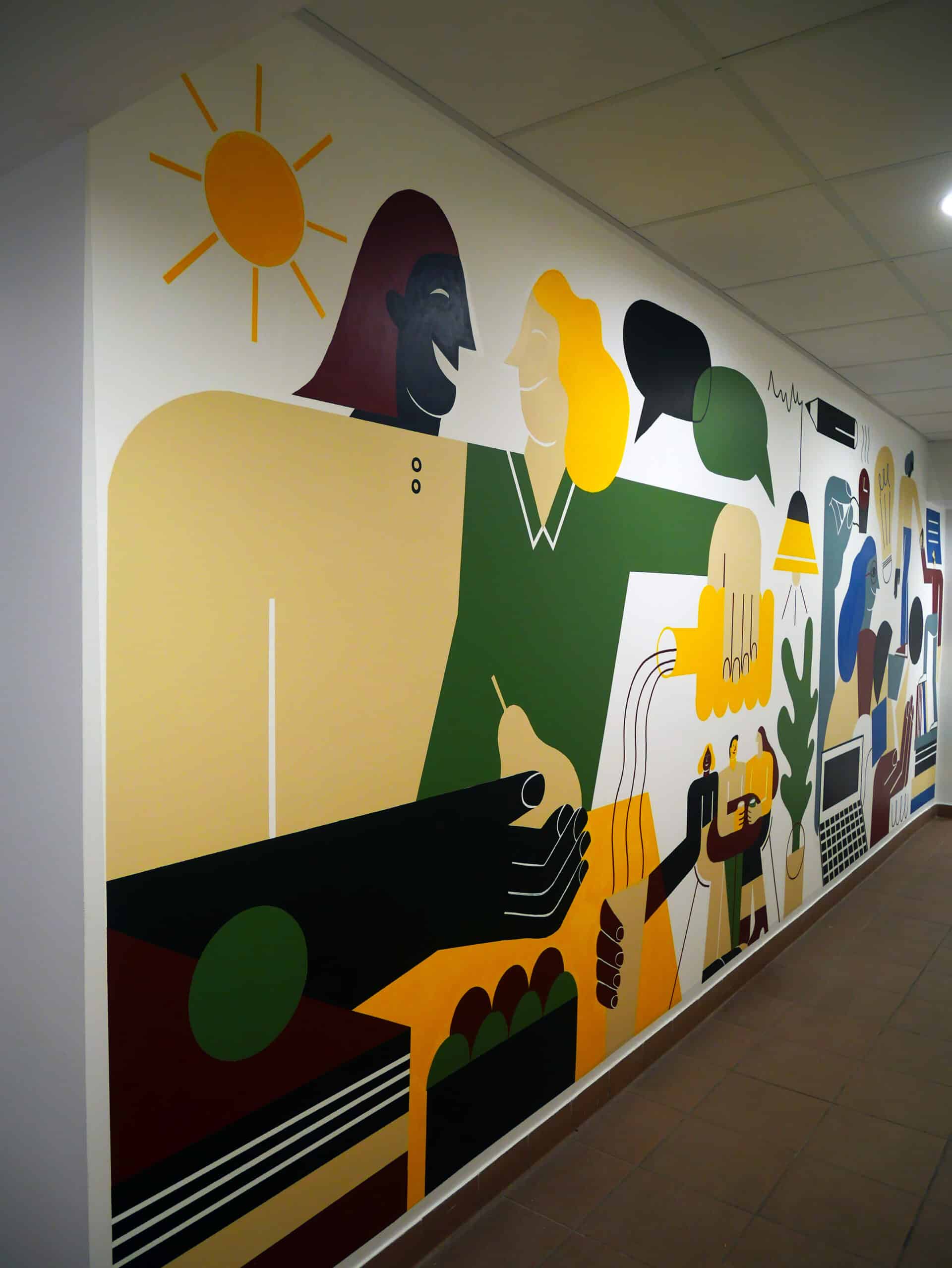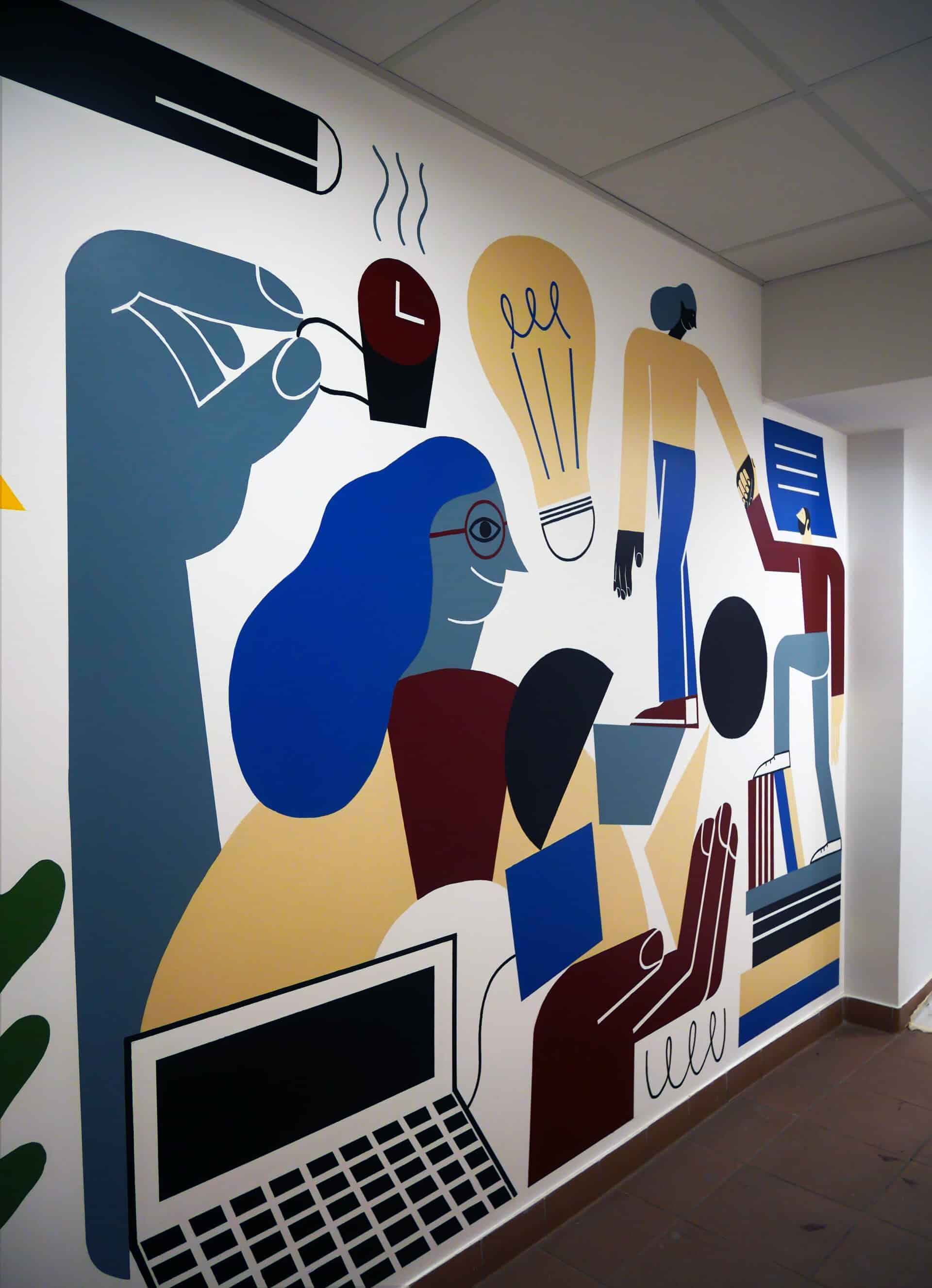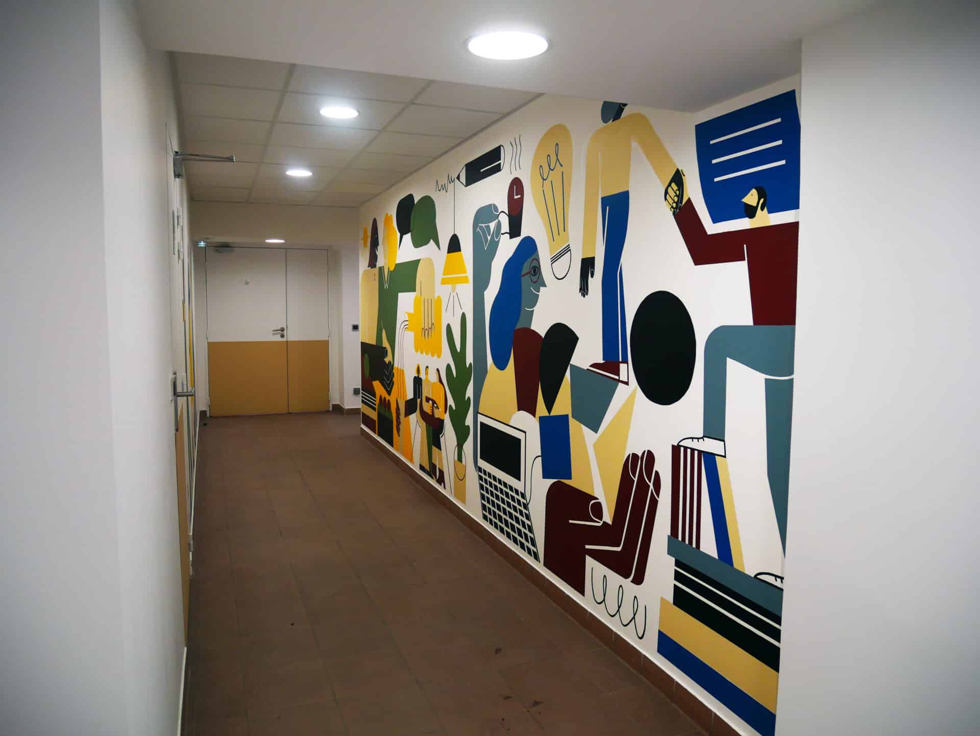 La fresque propose une composition dynamique mêlant formes abstraites et éléments figuratifs, mettant en lumière les métiers et les valeurs de l’entreprise. Pensée comme un repère visuel fort, elle apporte couleur, énergie et cohésion au quotidien des équipes.