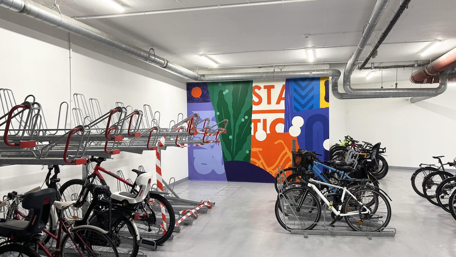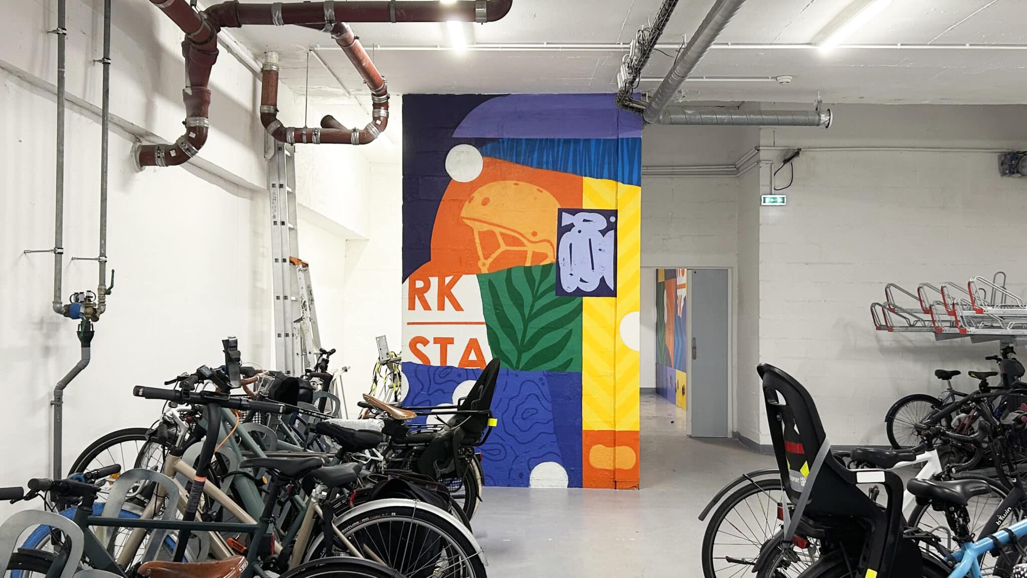Comme un local à vélos est un lieu de passage intense, nous avons placé les peintures au-dessus de 1m40. Cela permet d’éviter les rayures et les coups de guidons contre les murs. Résultat : l’œuvre reste impeccable dans le temps et l’espace est bien plus chaleureux.