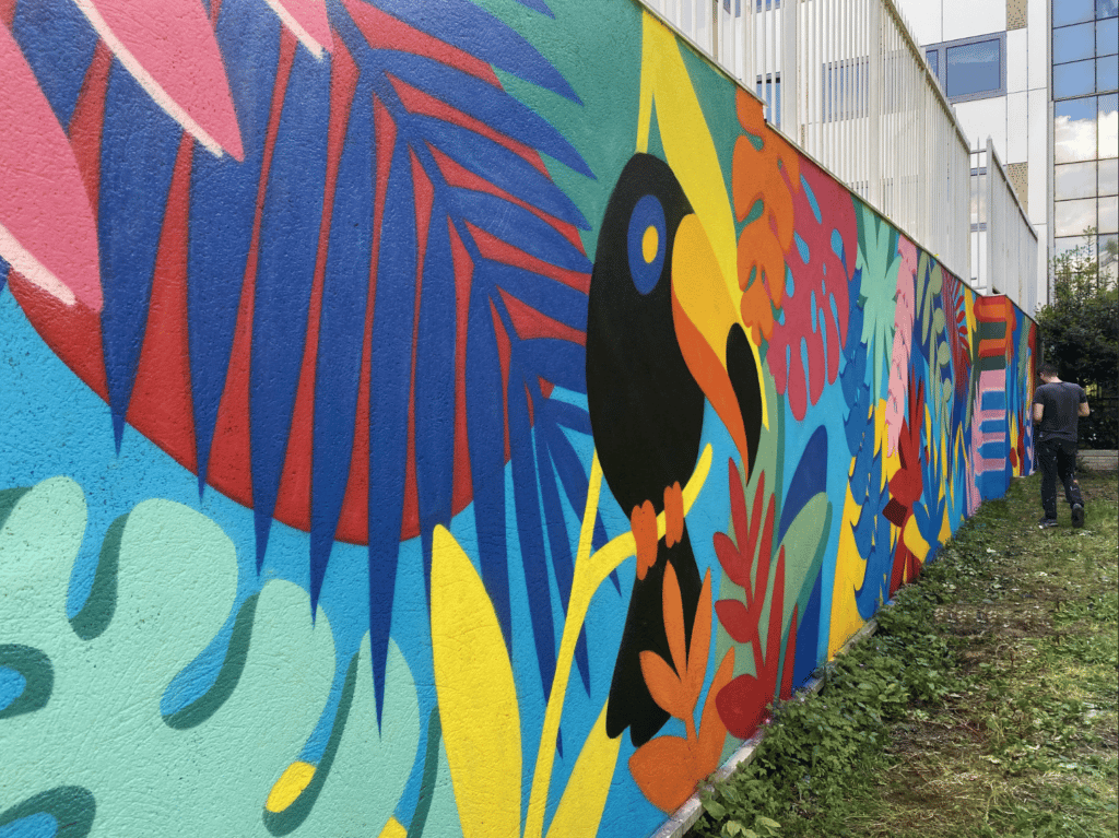Ce projet fait écho à une œuvre participative de 120 m² réalisée en amont au siège de l’entreprise, impliquant 50 collaborateurs. Une manière de faire résonner l’identité de la marque depuis l’interne jusqu’au grand public, avec un langage visuel fort.