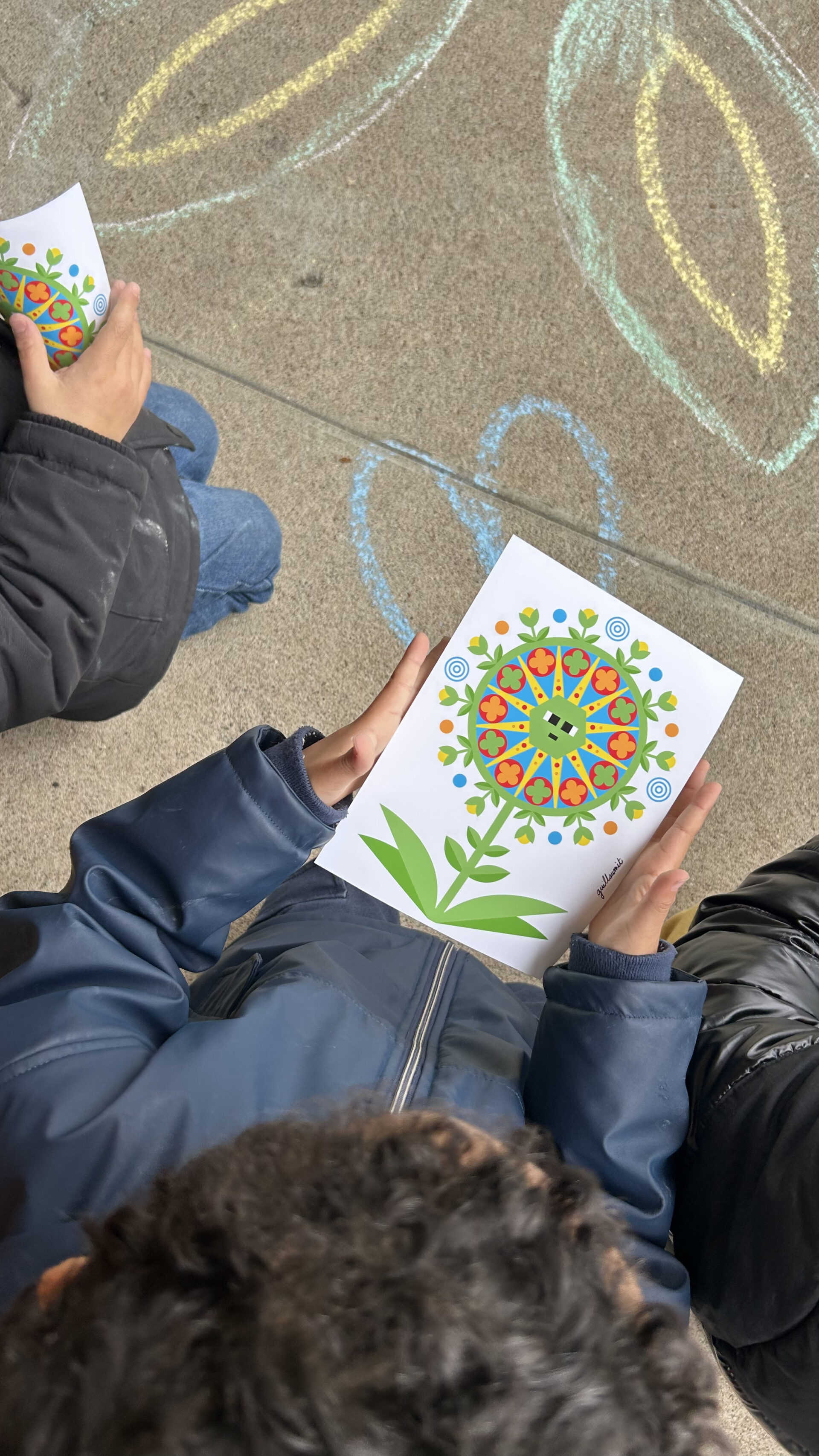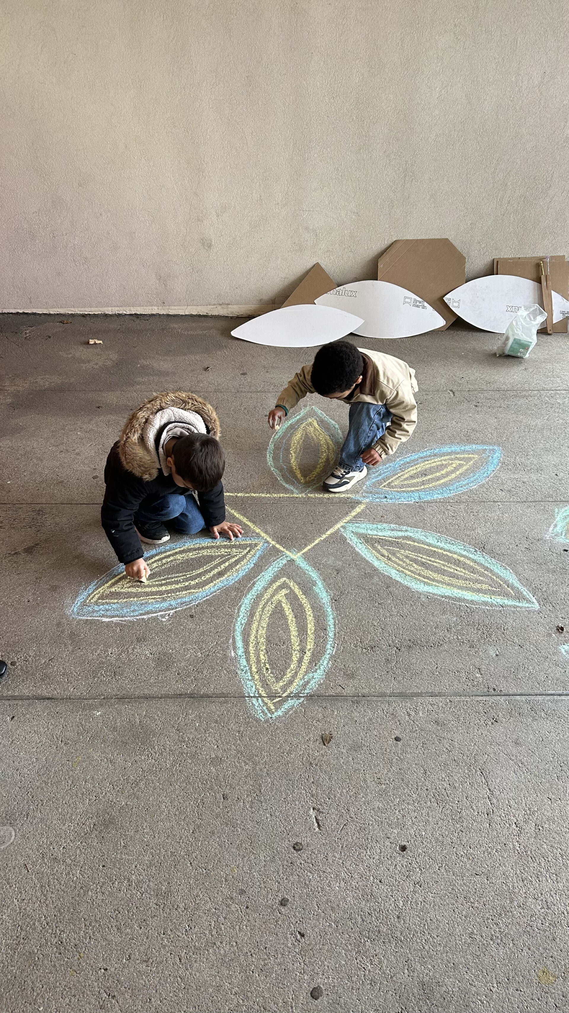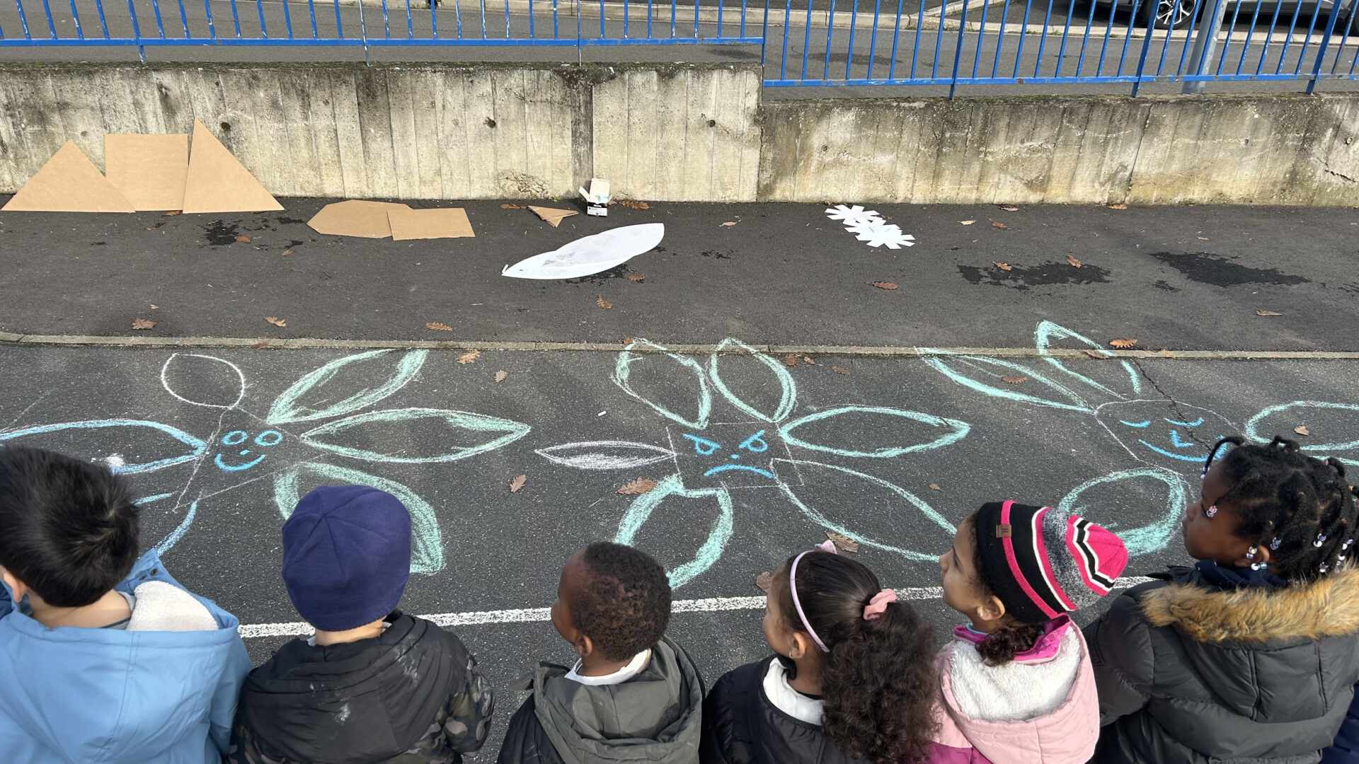 Des ateliers pédagogiques avec les élèves viennent compléter le projet : rencontre avec l’artiste, échanges autour de la ville et de la sécurité routière, réappropriation de la cour par le dessin et la couleur.