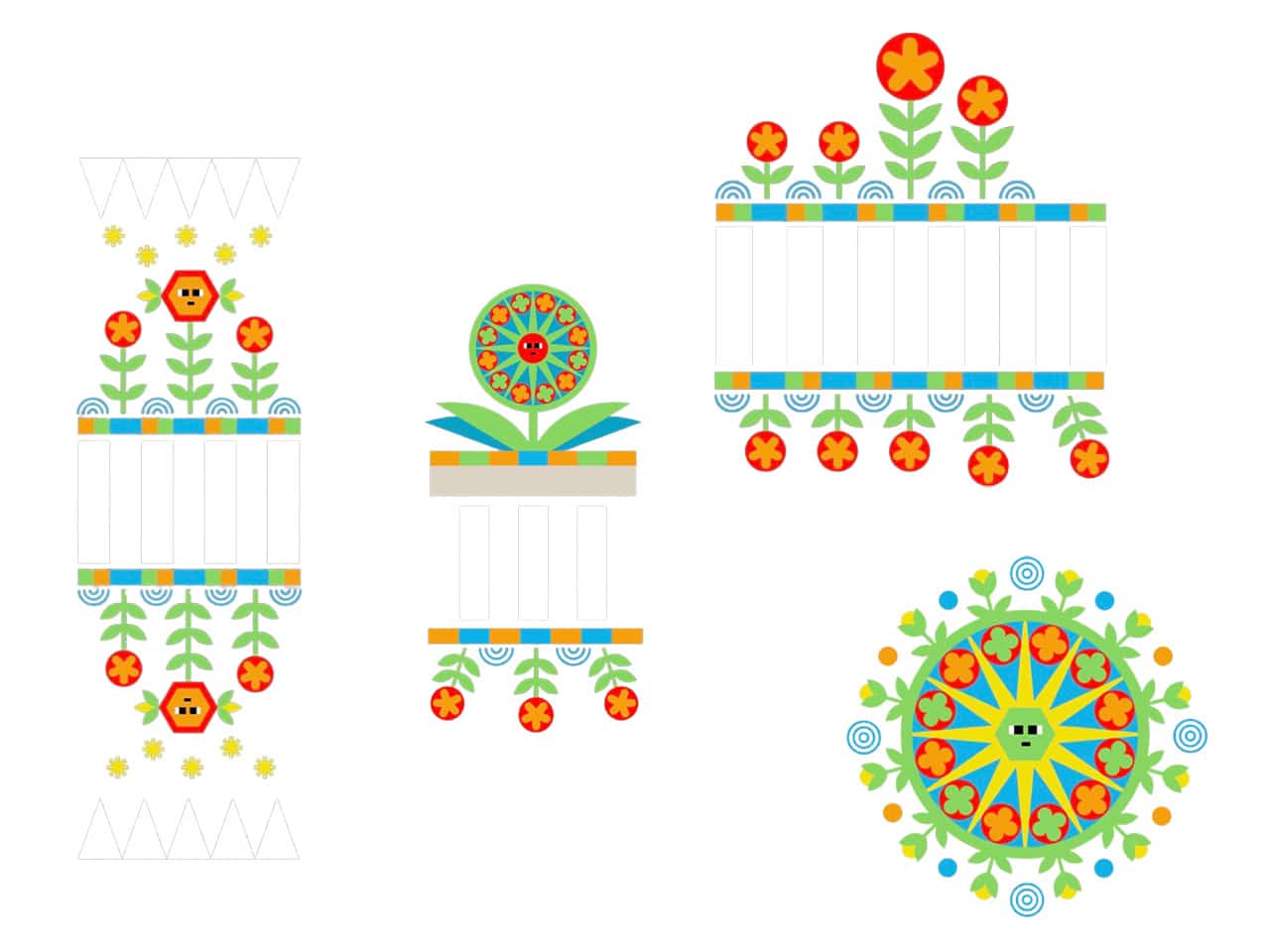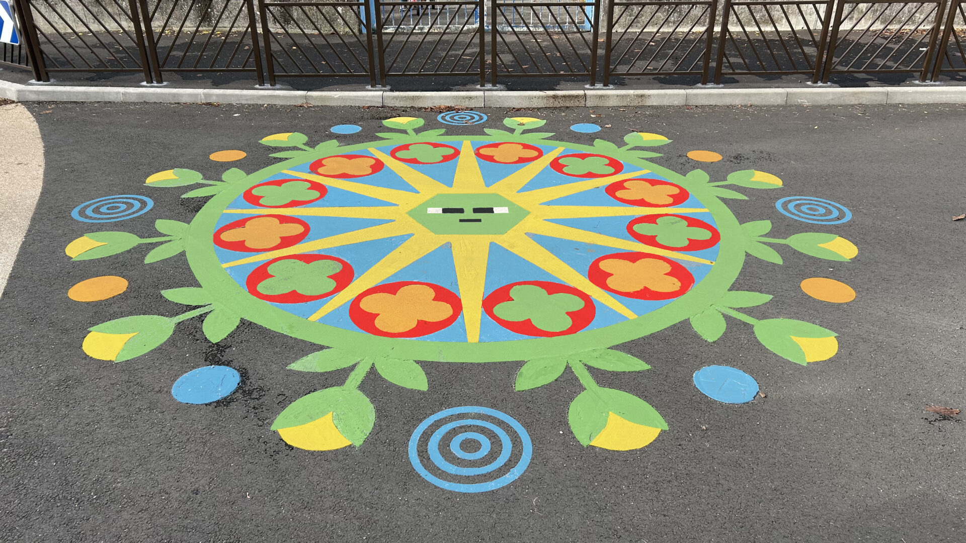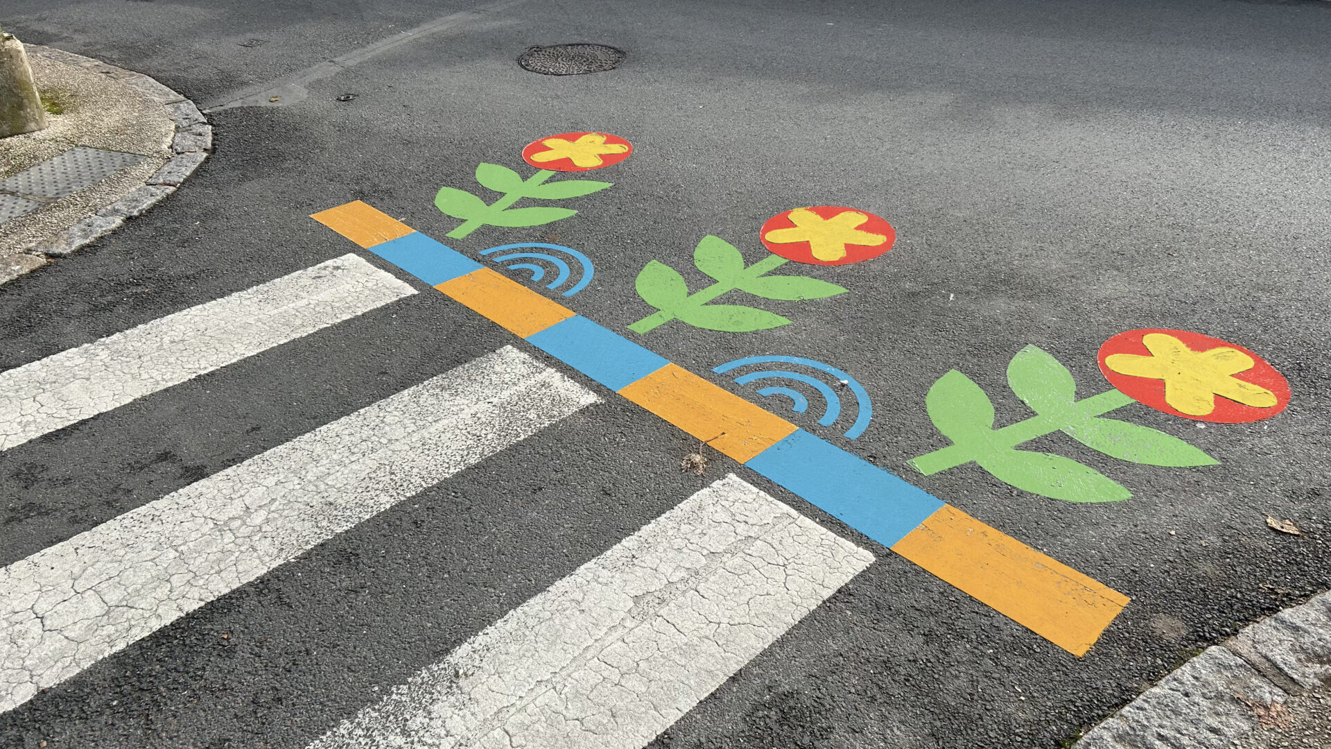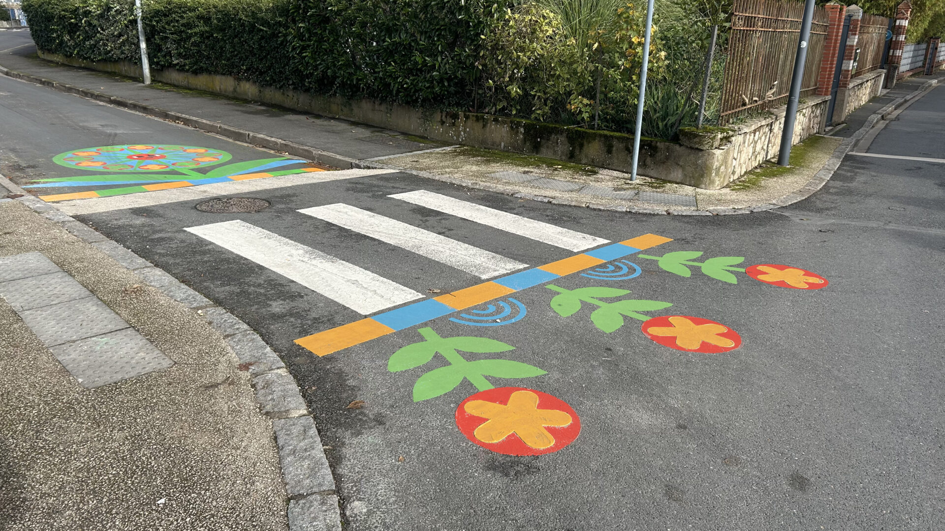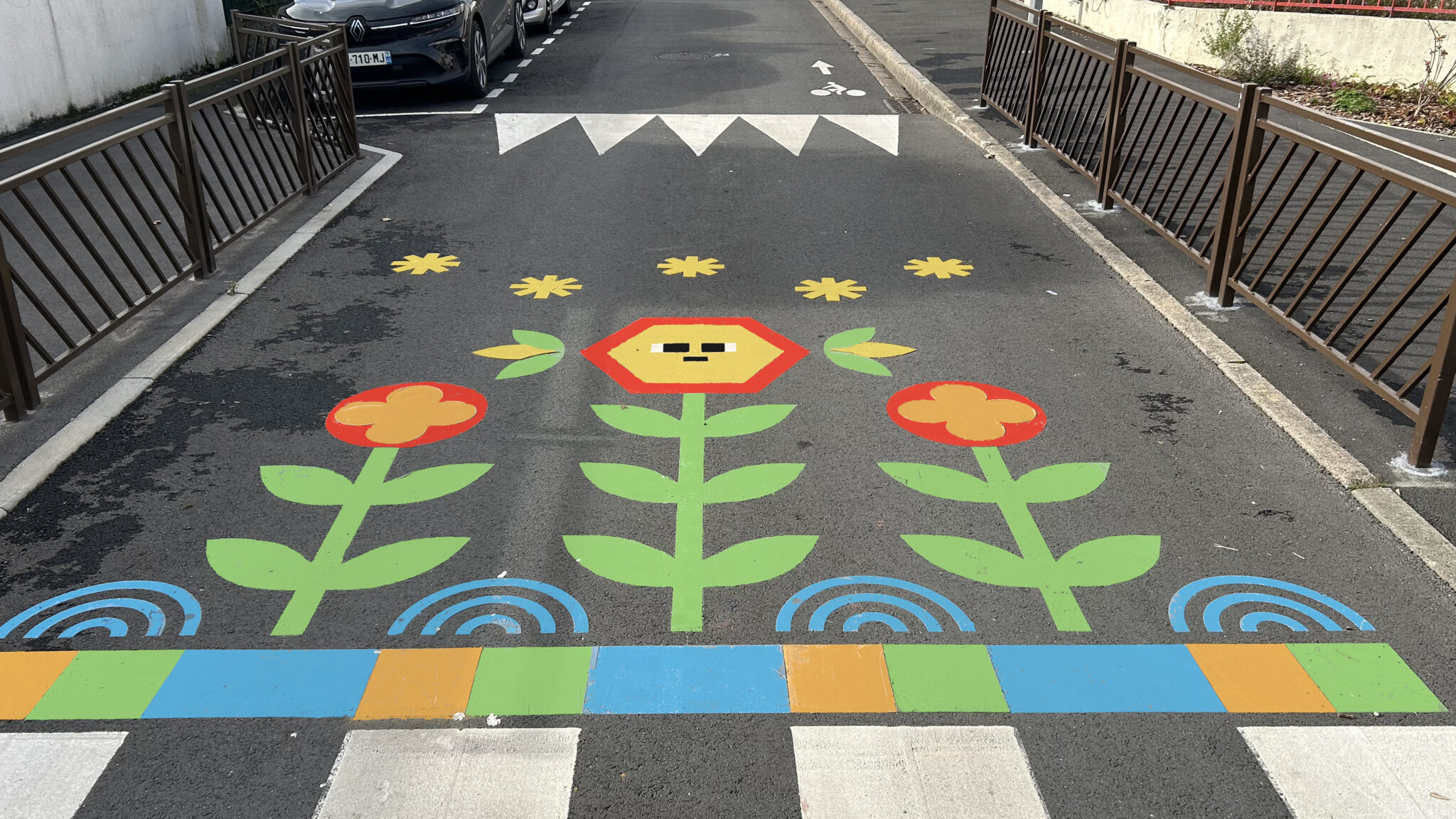 Les couleurs vives et les motifs géométriques créent un ralentisseur visuel qui capte le regard des conducteurs et rappelle la présence des enfants.