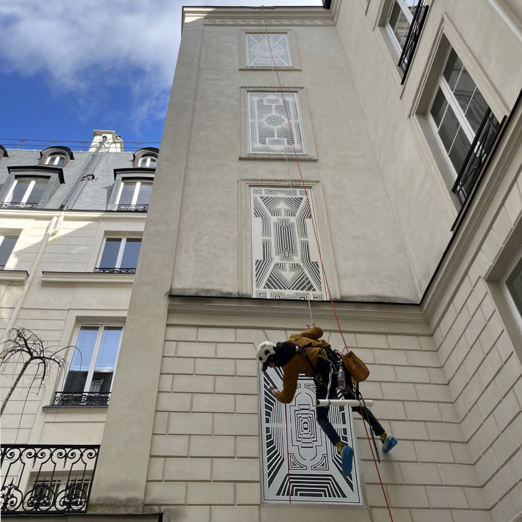 L’anamorphose est composée de bandes adhésives peintes avec un effet métallique cuivré, évoquant les pièces de monnaie. Les teintes ont été développées spécifiquement en laboratoire pour garantir leur tenue dans le temps et leur éclat sous la lumière du soleil. La façade ayant un statut patrimonial, un film protecteur a été posé en amont pour assurer une intervention 100 % réversible.