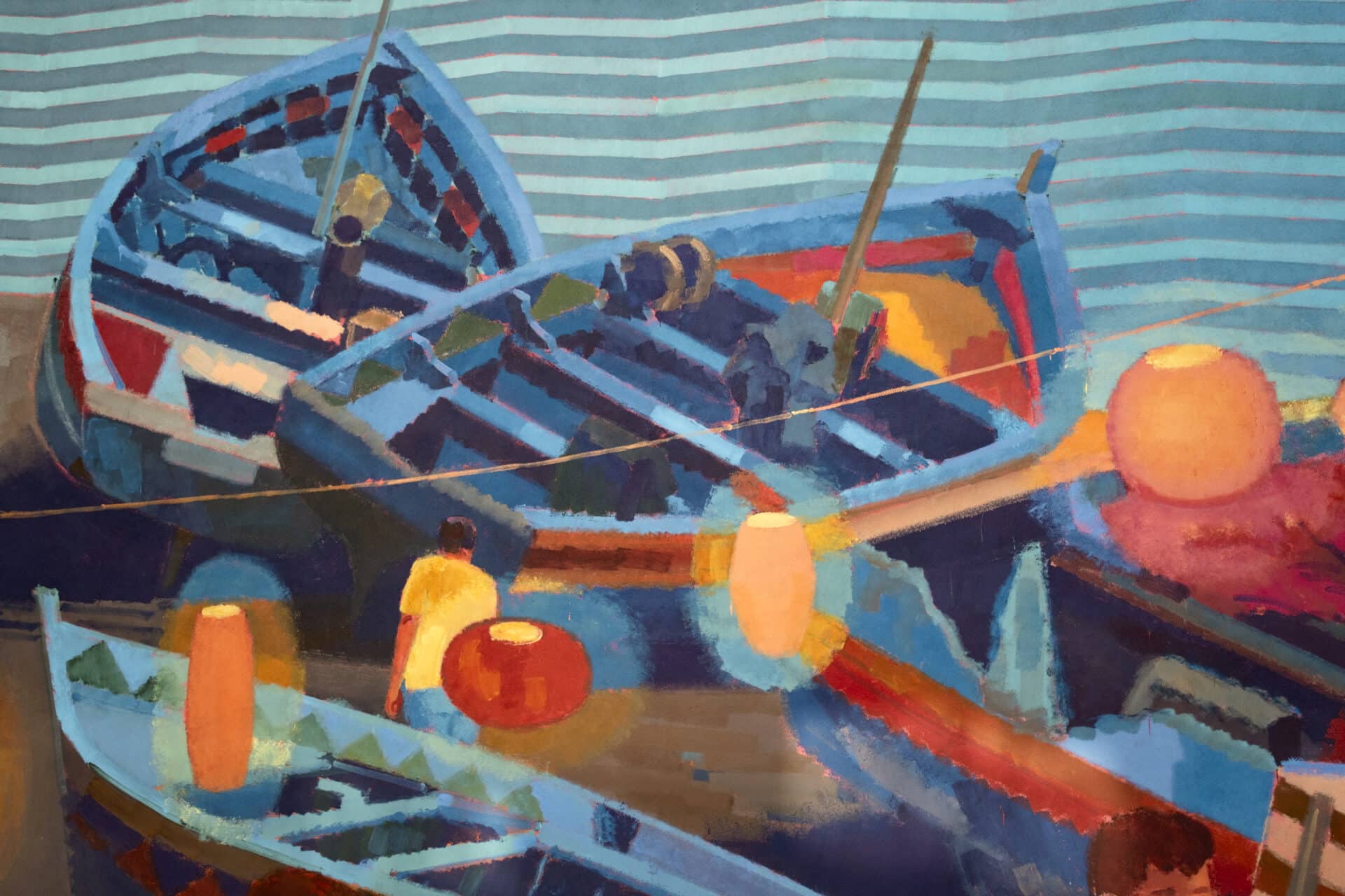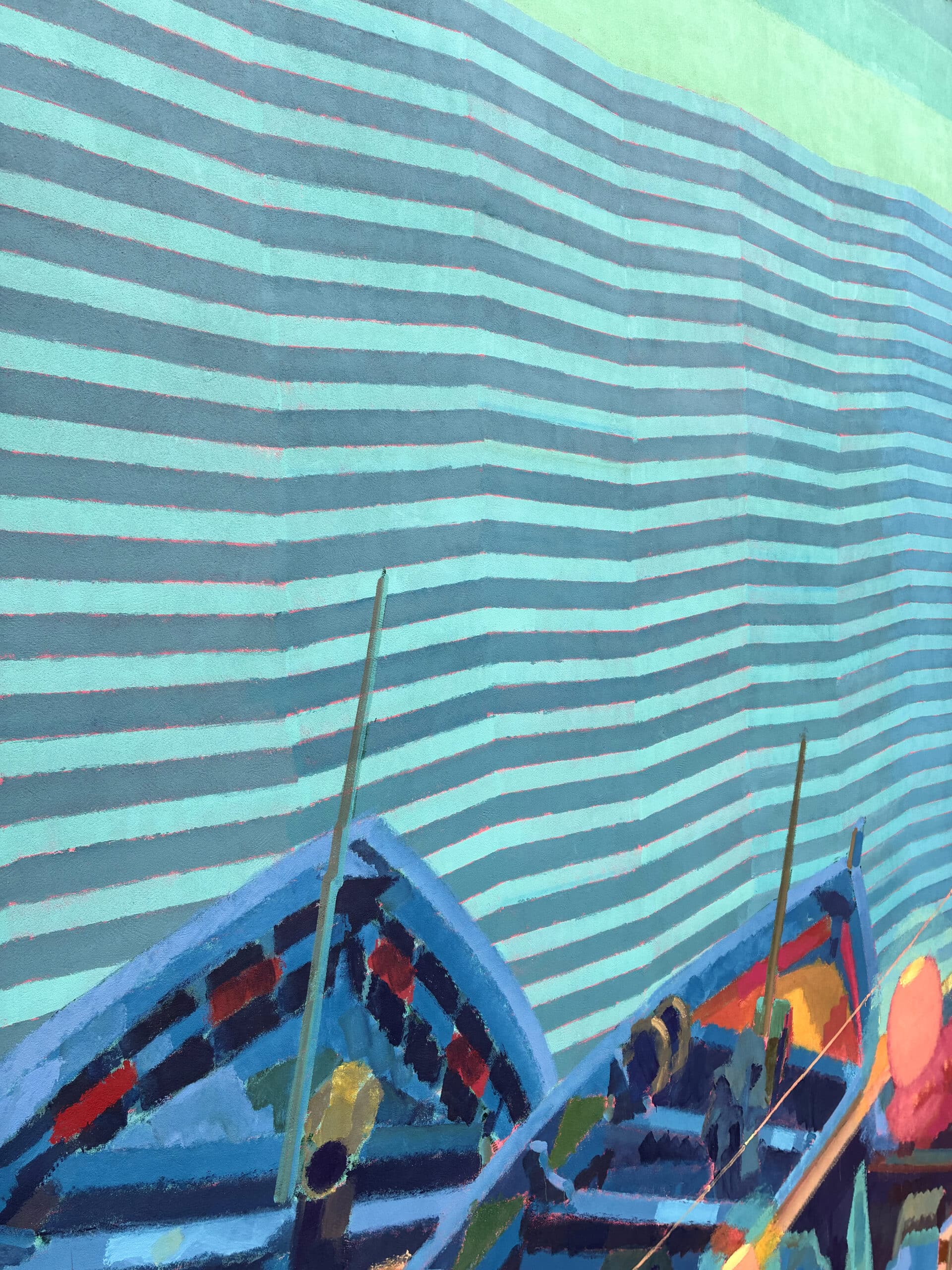 Signée par l’artiste Matthieu Pommier, l’œuvre rend hommage à la richesse de l’artisanat et de la culture marocains : bateaux, objets typiques, sable, enfants qui jouent au football… Certains éléments sont peints avec une grande précision, d’autres évoquent la liberté d’un carnet de voyage. À l’arrière-plan, l’océan devient motif graphique, tandis que des lampes surdimensionnées apportent une touche presque surréaliste à la scène.