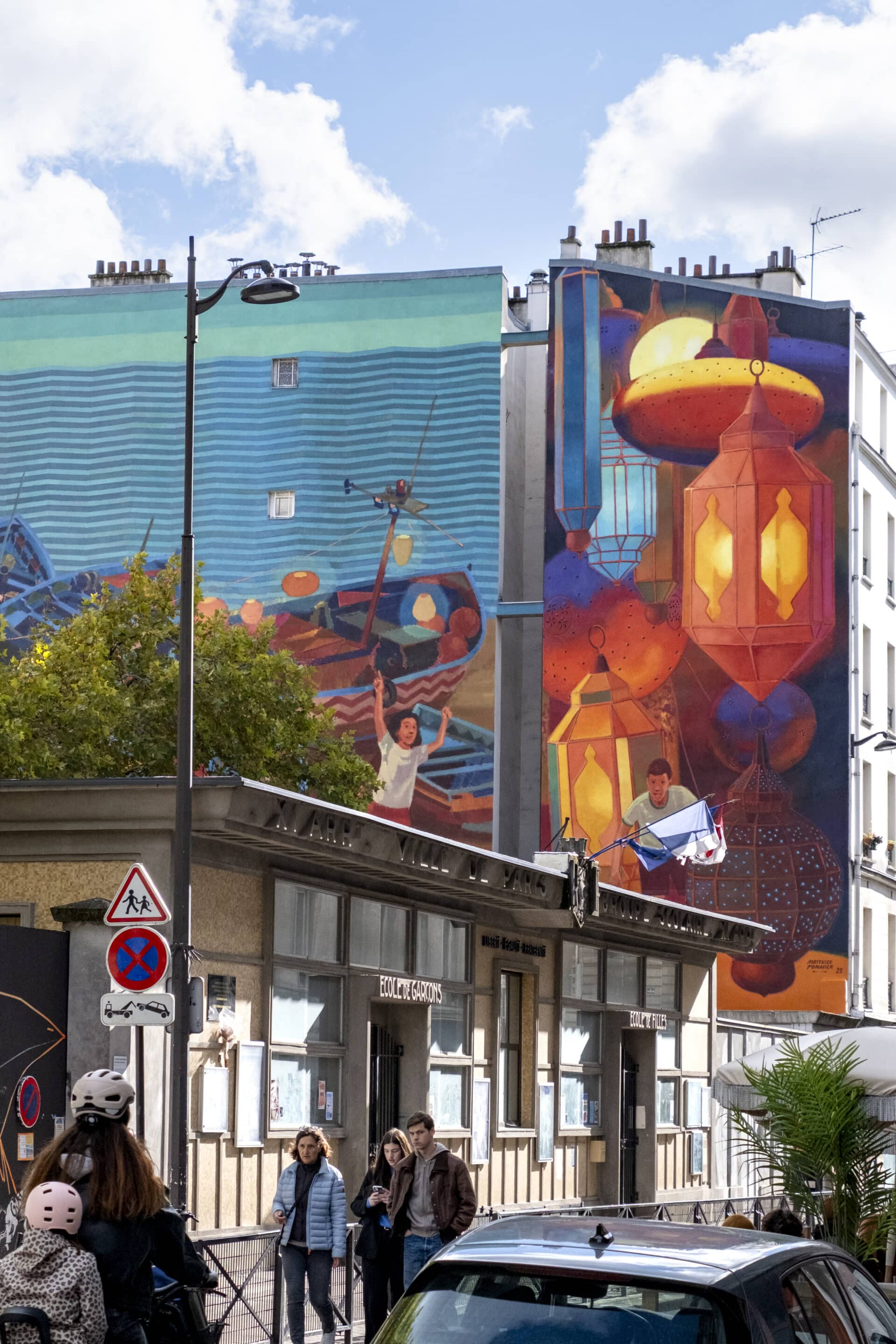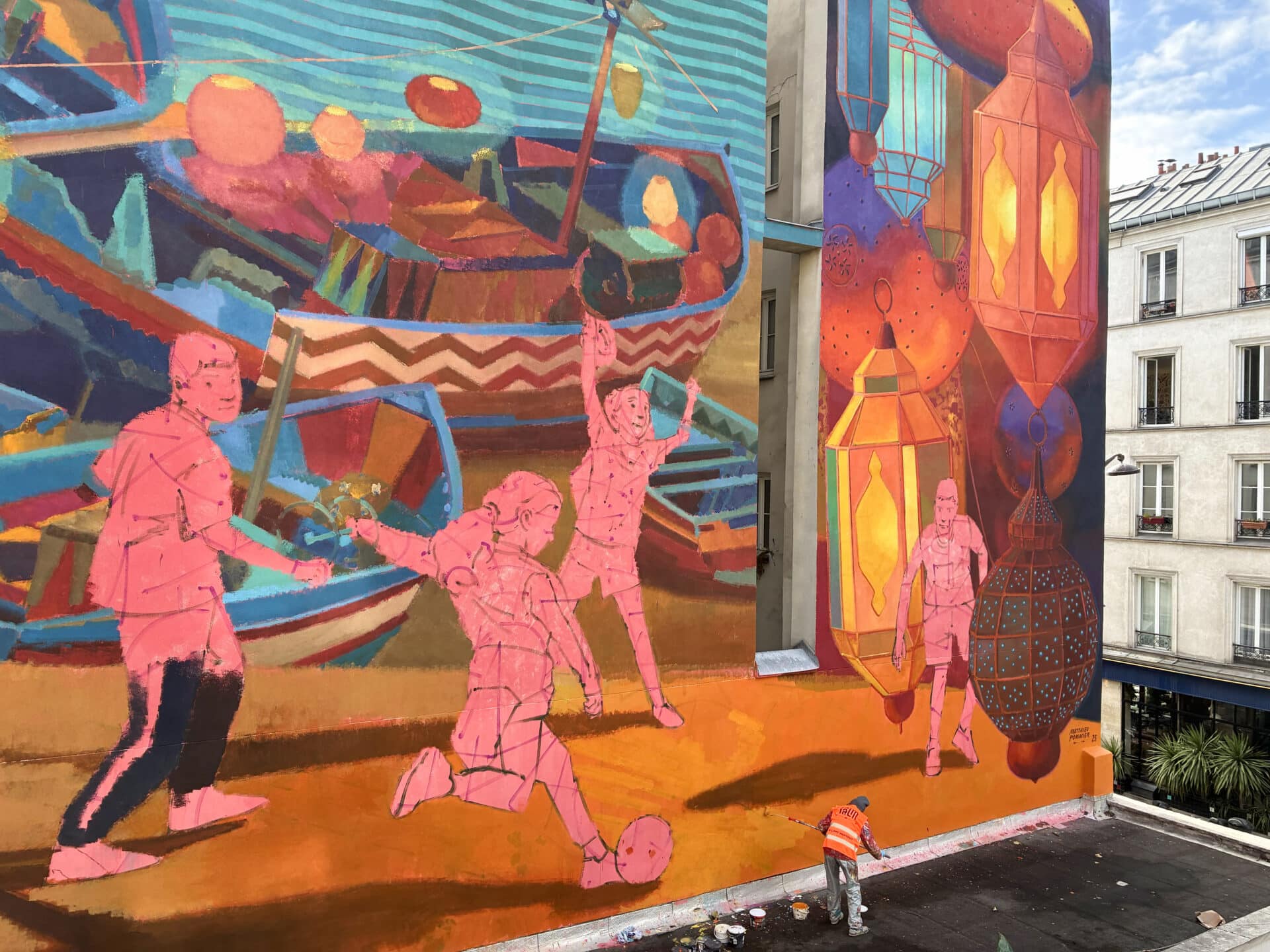 Réalisée dans le 11ᵉ arrondissement de Paris, la fresque « Fawanis » fait entrer le Maroc dans la ville. Inspirée d’un voyage récent, elle retranscrit paysages, ambiances et scènes de vie à travers une composition monumentale qui mêle horizon marin, objets du quotidien et imaginaire poétique.