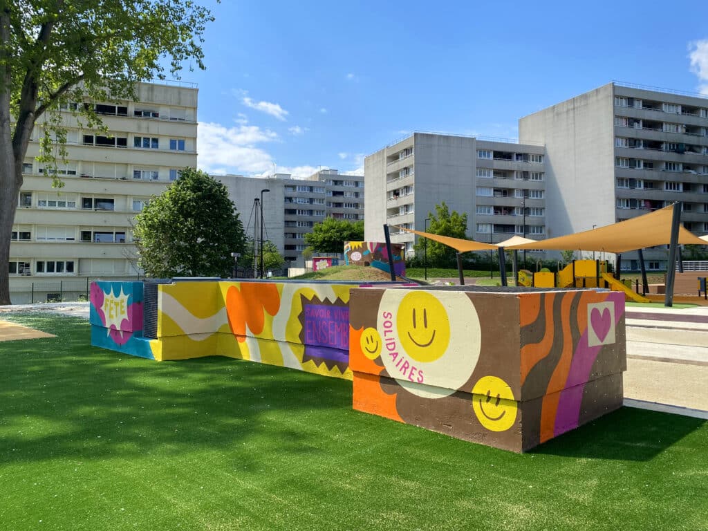 L’œuvre a été réalisée en concertation avec les habitants et les jeunes du quartier, impliqués via des ateliers pédagogiques autour du dessin et de la mise en peinture avec l’artiste.
