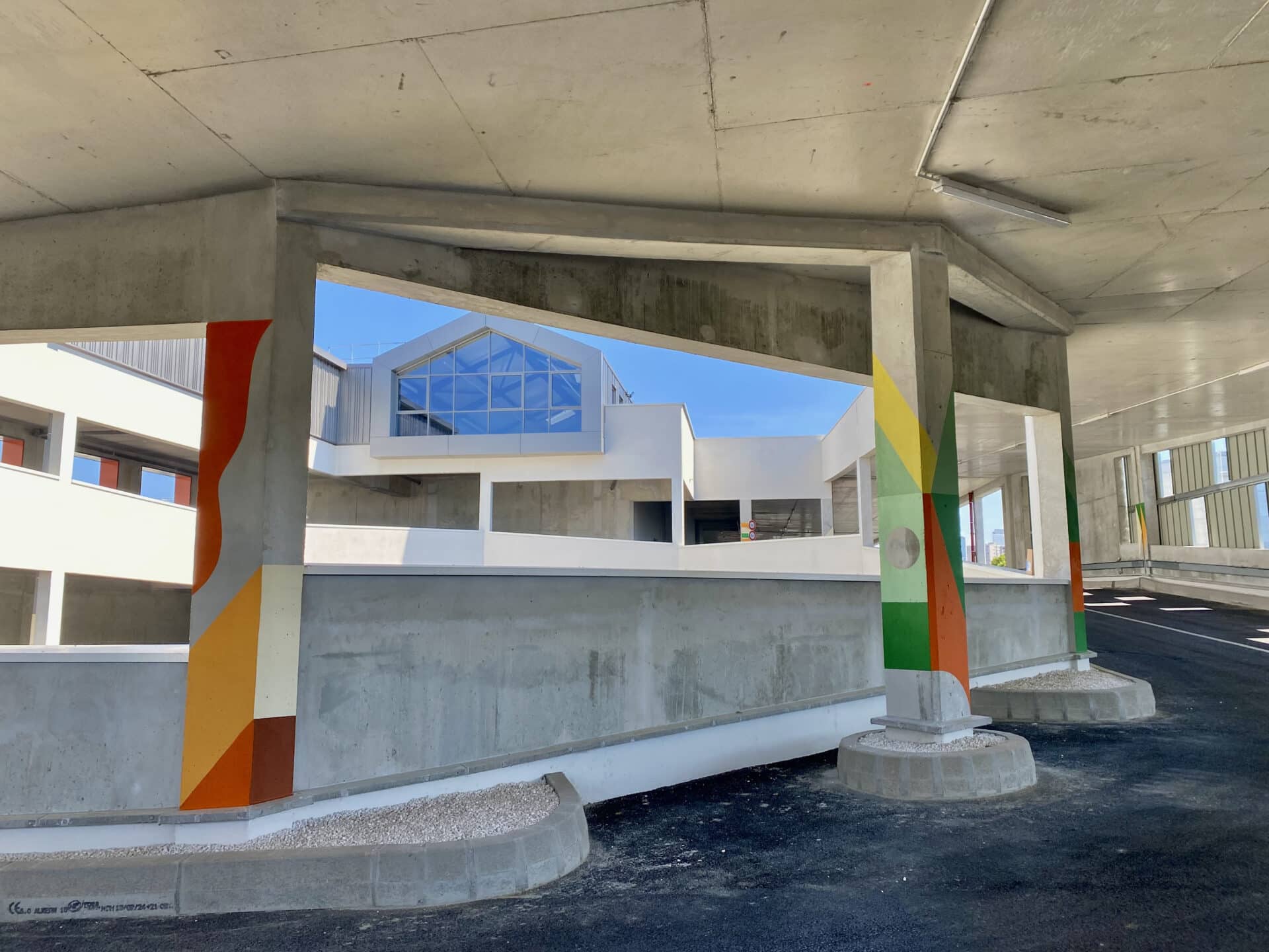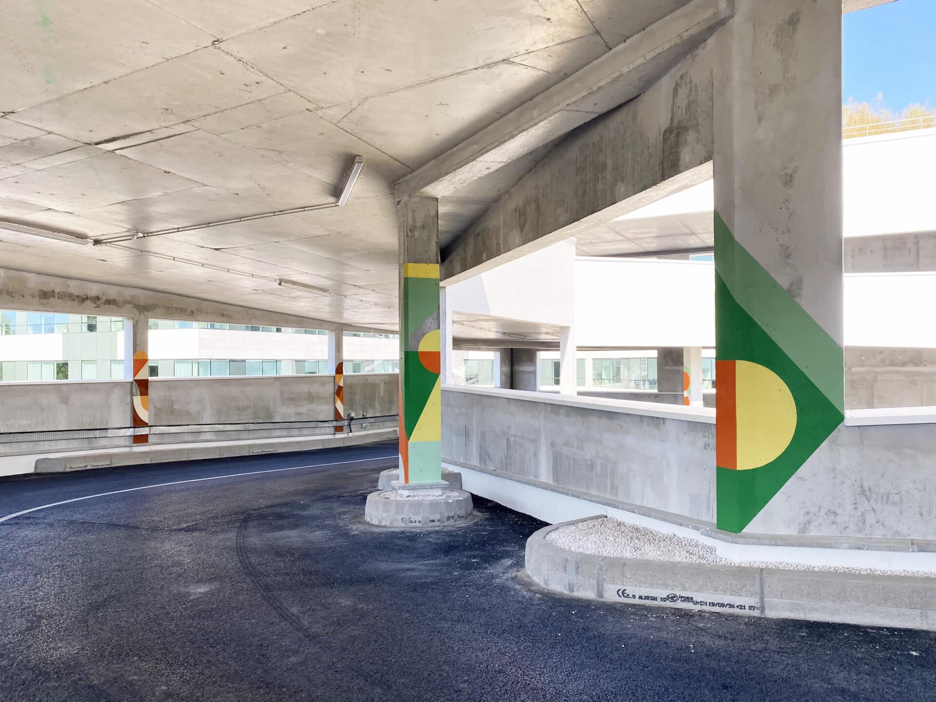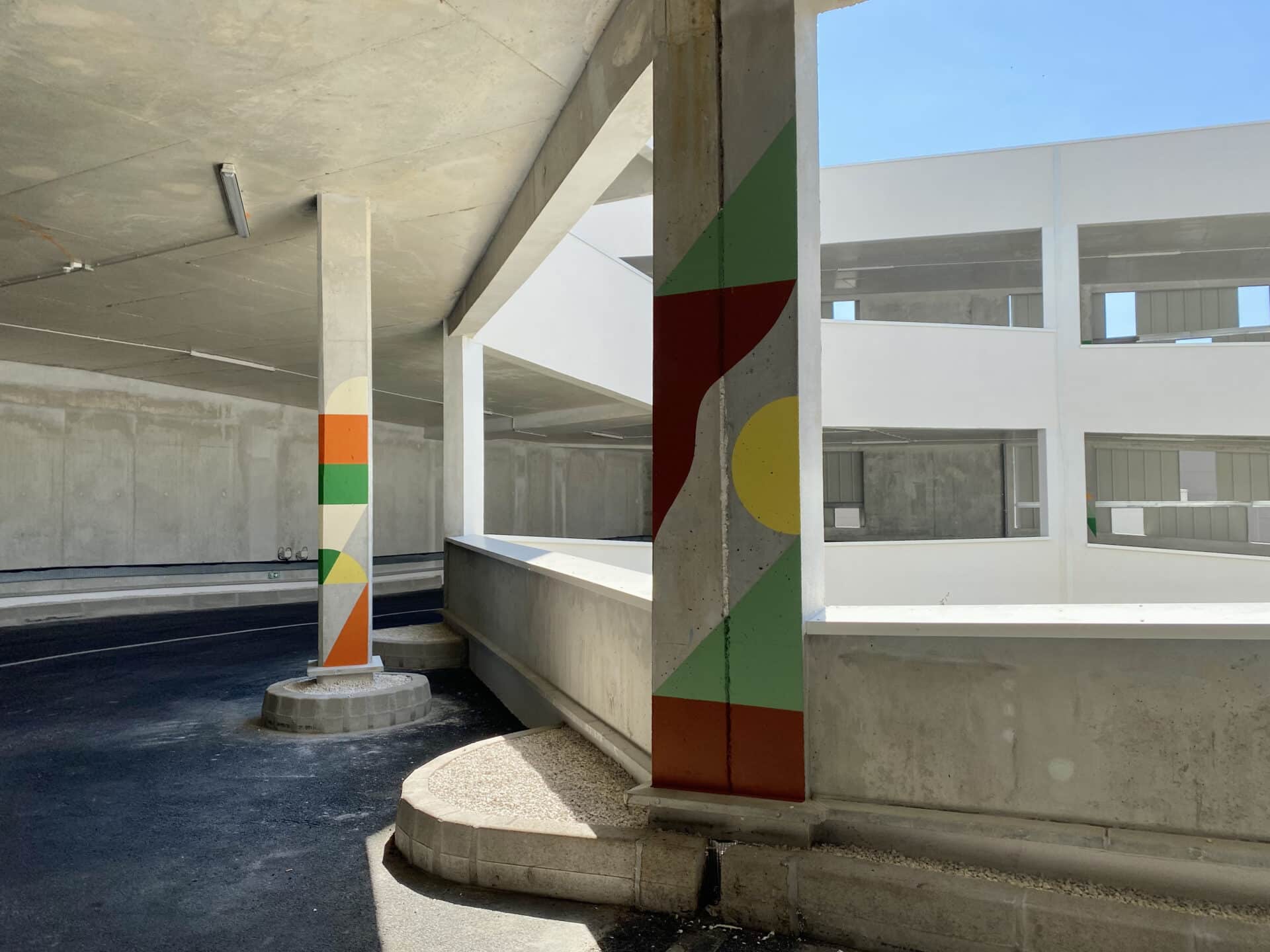 Invité par PALM, Clément Laurentin déploie un vocabulaire de couleurs, de lumière et de formes géométriques. Son travail, entre peinture murale, graphisme et installation, compose un rythme visuel qui accompagne les déplacements et révèle le site.