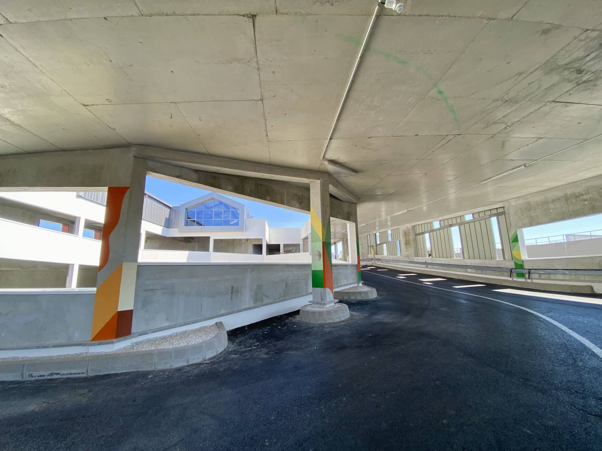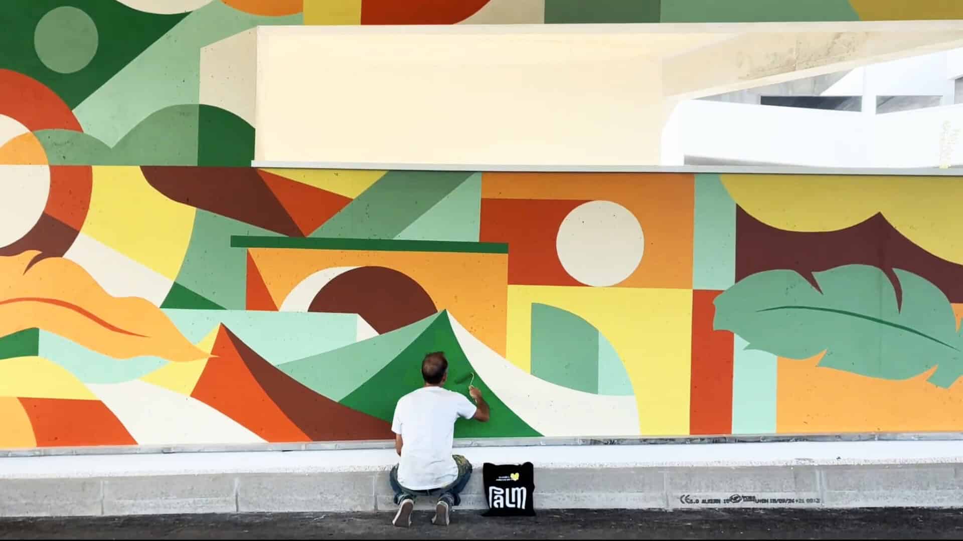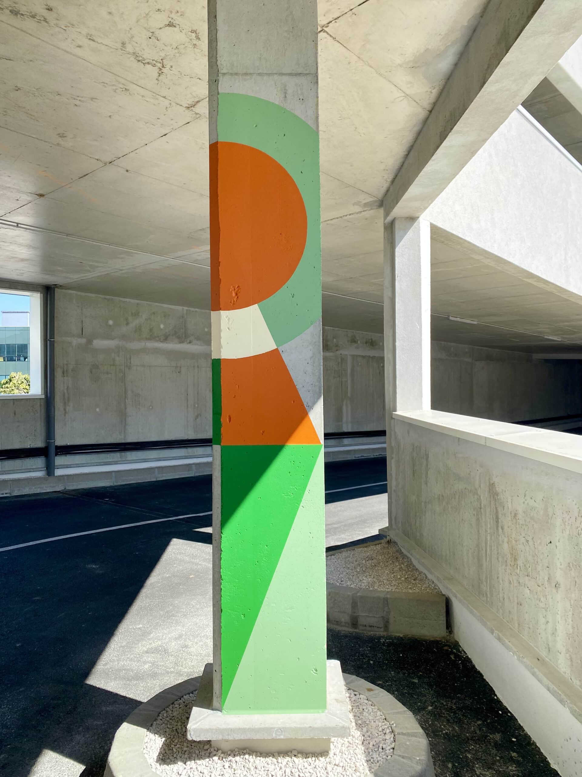 Invité par PALM, Clément Laurentin déploie un vocabulaire de couleurs, de lumière et de formes géométriques. Son travail, entre peinture murale, graphisme et installation, compose un rythme visuel qui accompagne les déplacements et révèle le site.