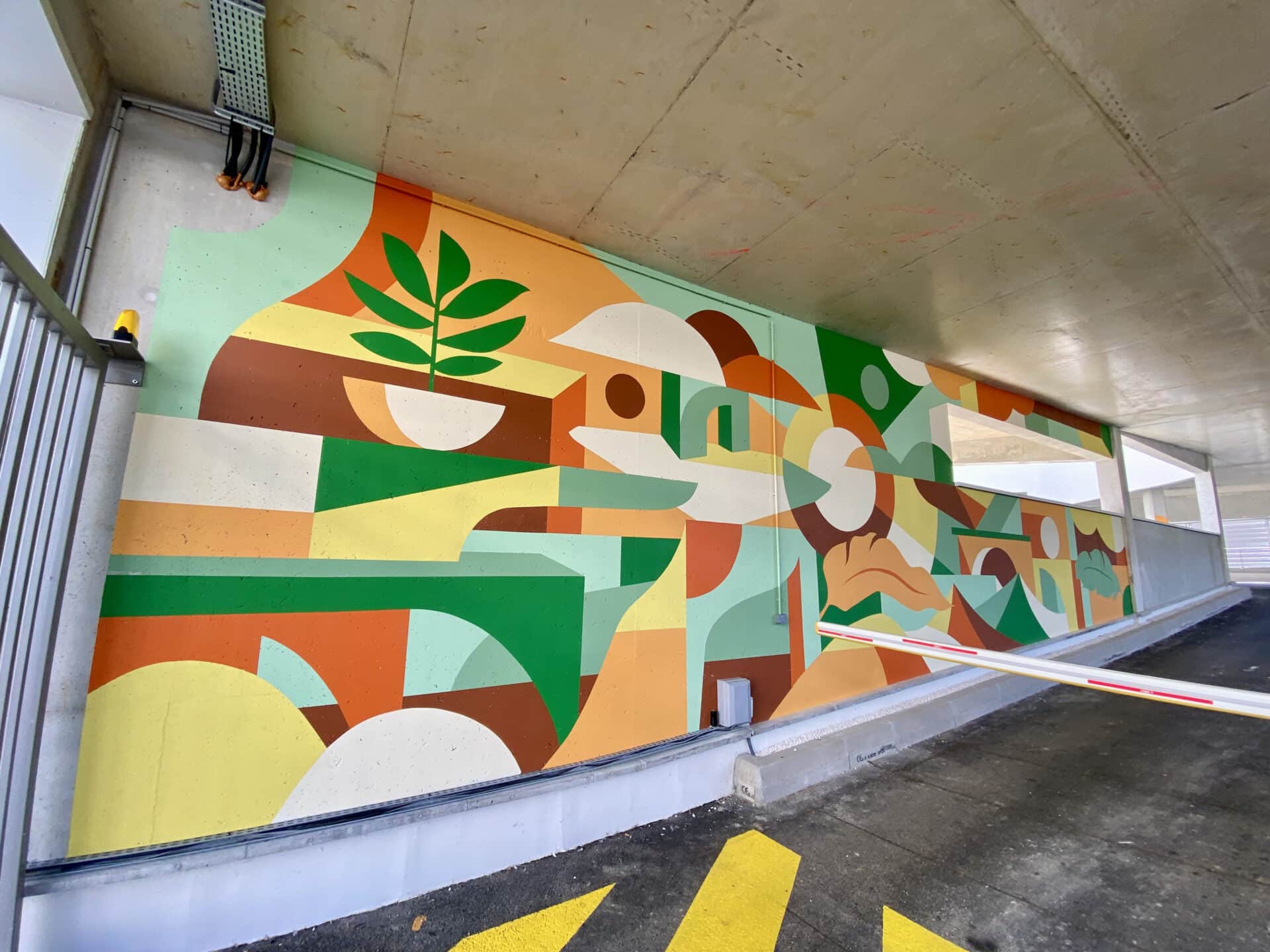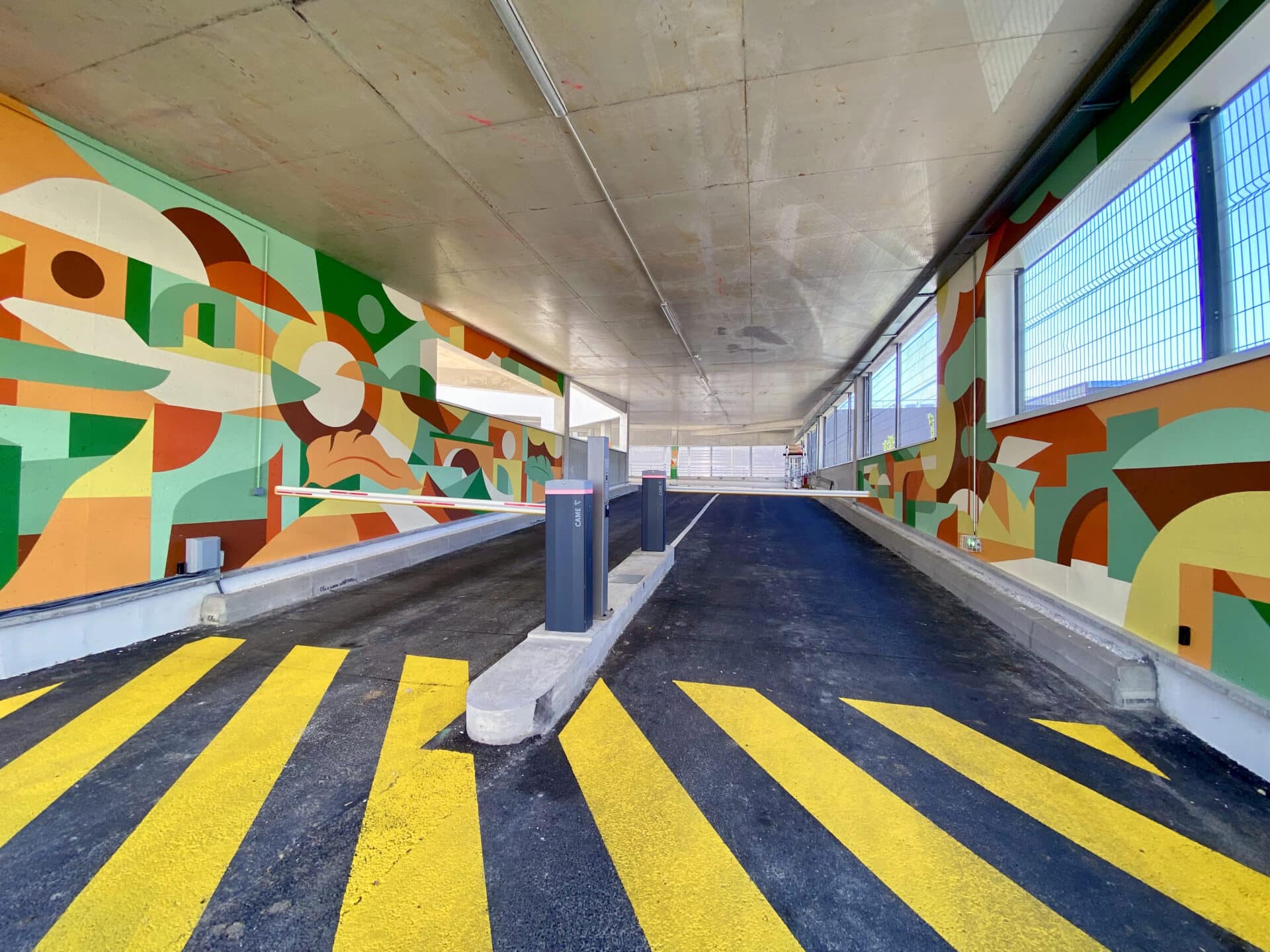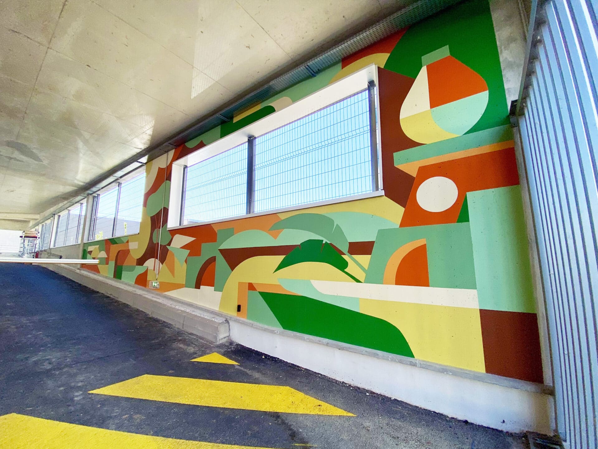L’entrée est mise en scène par une peinture immersive qui accueille le visiteur et annonce l’identité du lieu. Sur la rampe d’accès, 43 poteaux deviennent une séquence visuelle : des compositions colorées et géométriques rythment la montée et la descente, rendent l’orientation plus naturelle et signent le parcours. Le message de l’œuvre est clair : accueillir, orienter, identifier. Elle fait d’un passage fonctionnel un moment de qualité, reconnaissable et mémorisable.