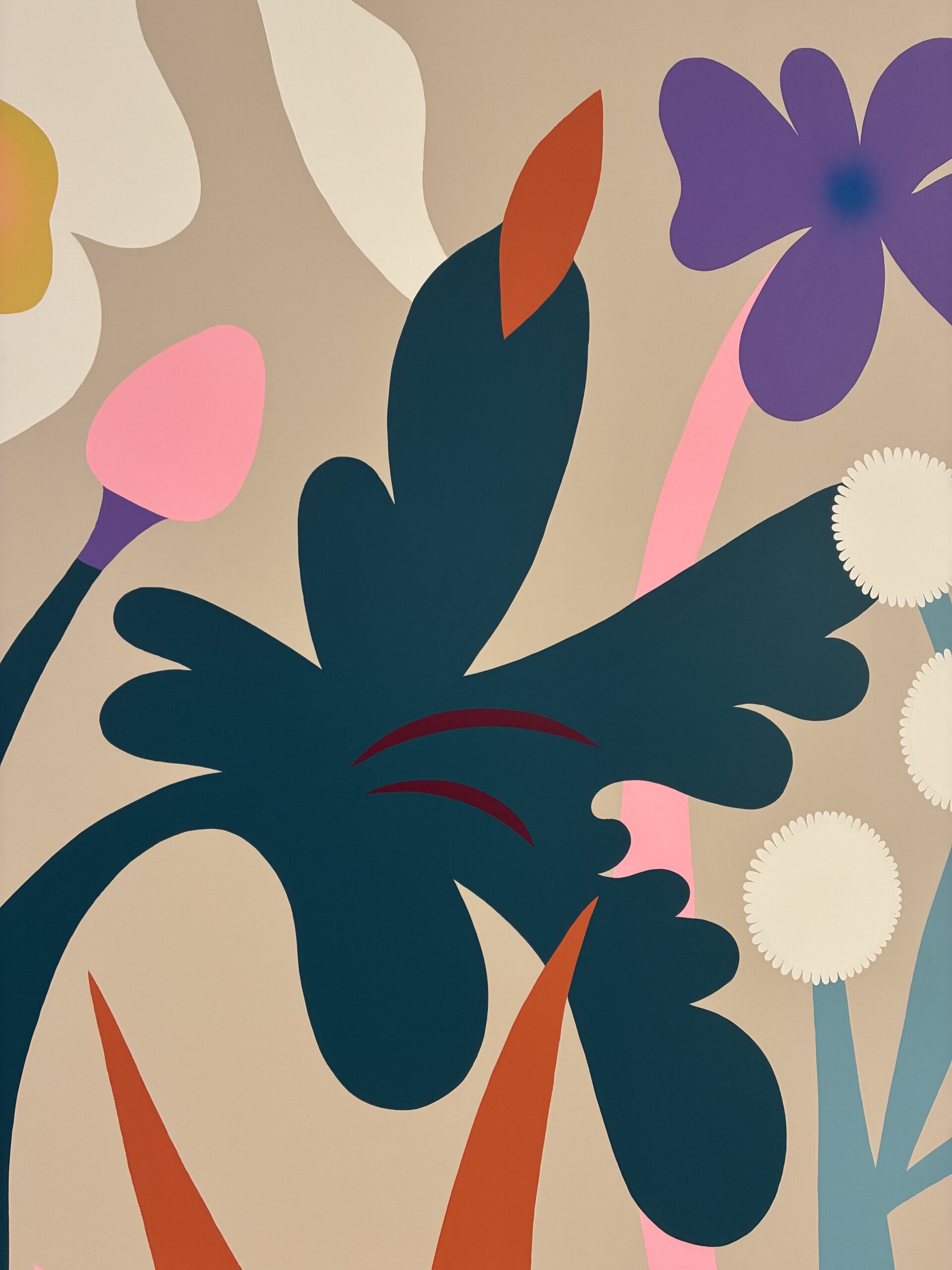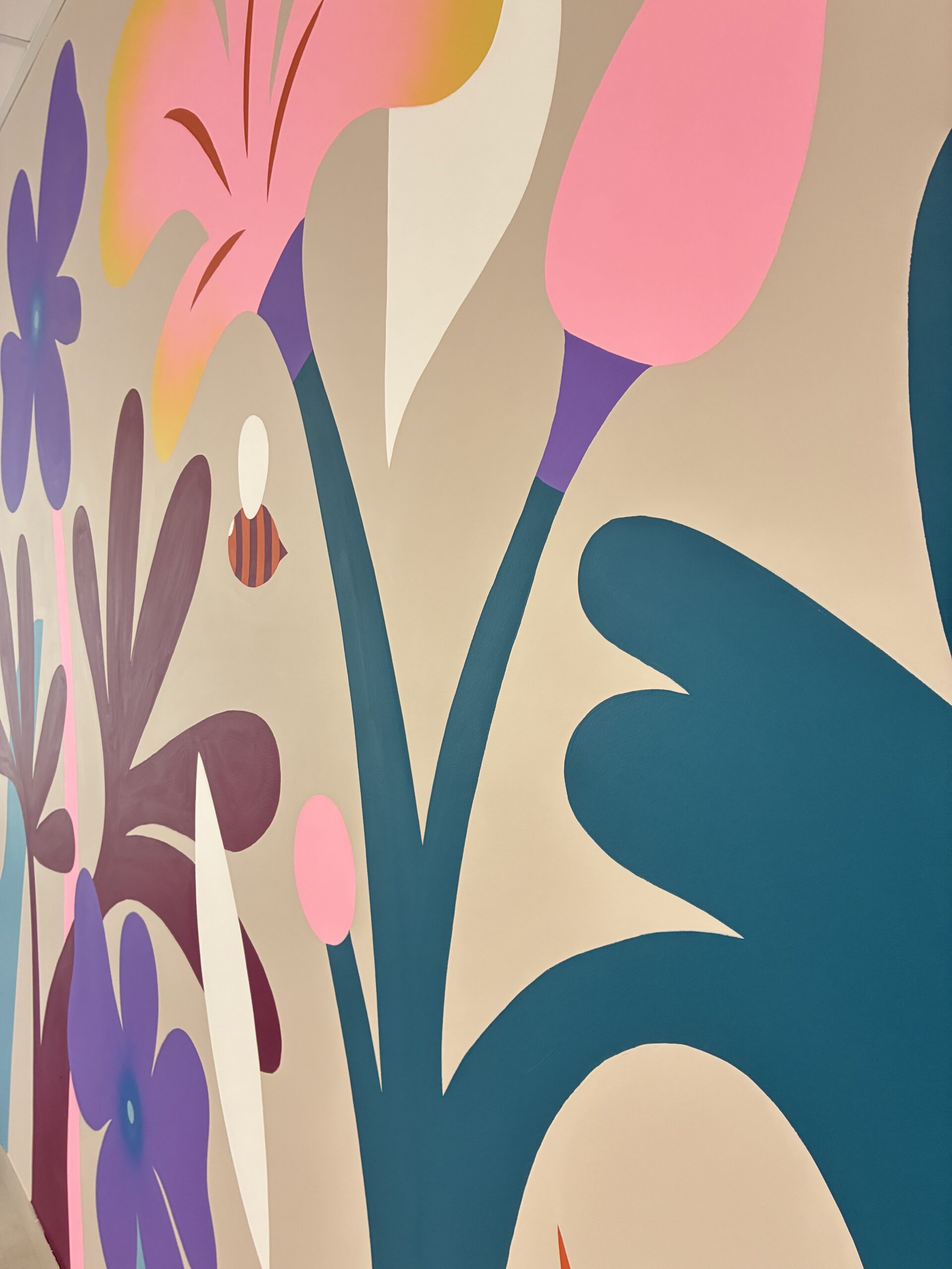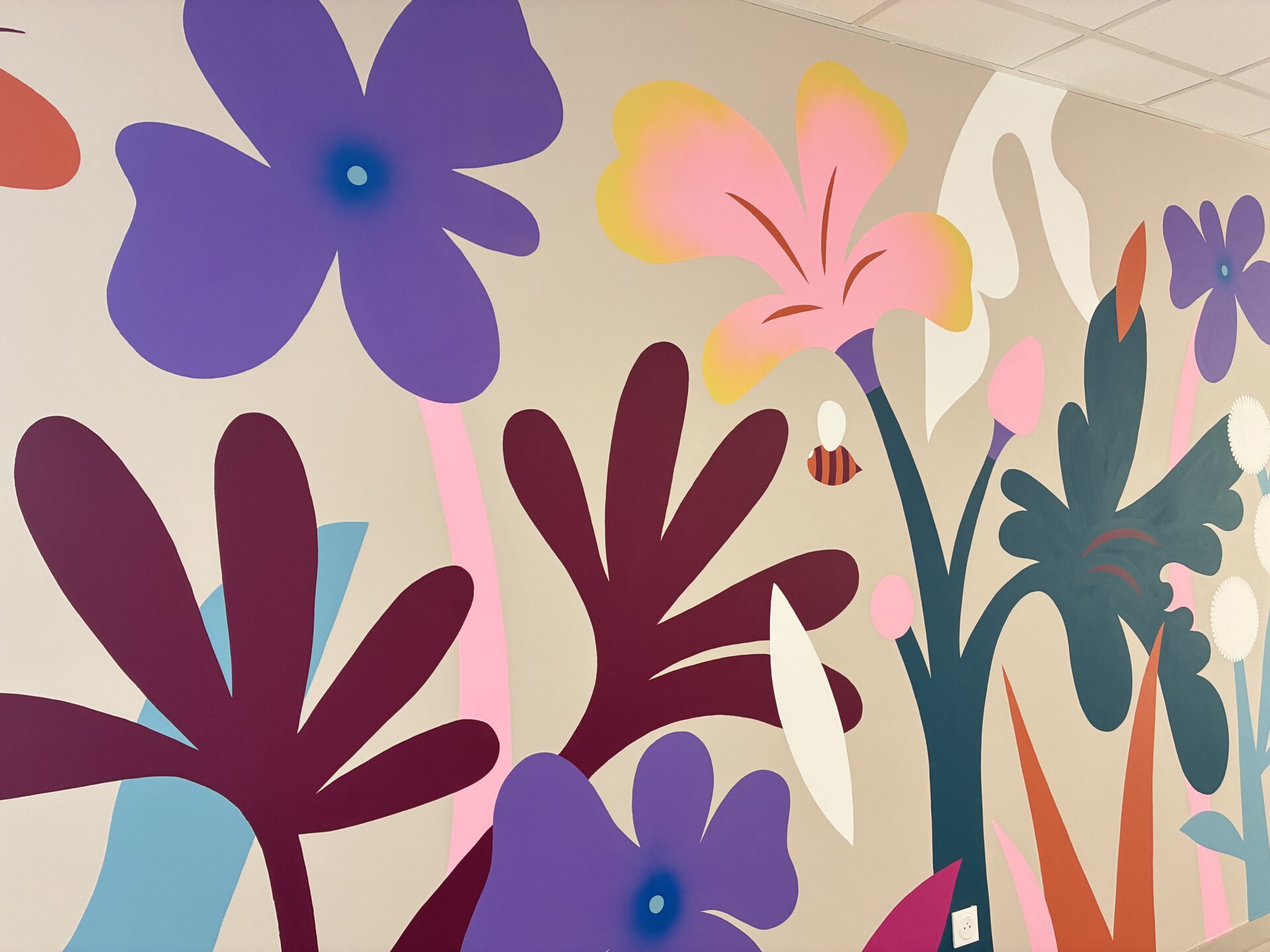 Pour ce projet, l’artiste Alix d’Anselme, illustratrice et muraliste locale, signe une fresque florale immersive. Une plongée dans un parterre de fleurs géantes, comme si l’on devenait un insecte naviguant entre tiges graphiques et pétales pop. Les couleurs vives réveillent ce local baigné de gris et ouvrent une double lecture, entre poésie visuelle et sensibilisation à la biodiversité.