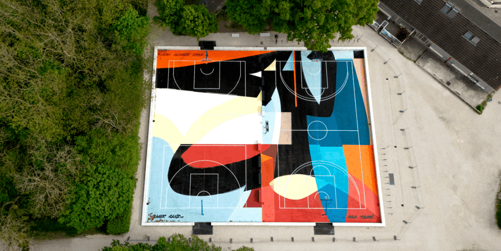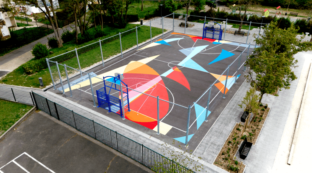 Le sol devient alors une canopée inversée, un terrain de sport transformé en jardin graphique. Inspirée par l’histoire du site, ses anciens jardins particuliers, son jardin partagé, sa vocation intergénérationnelle. Cette fresque artistique invite à jouer, rêver, se rassembler autrement.