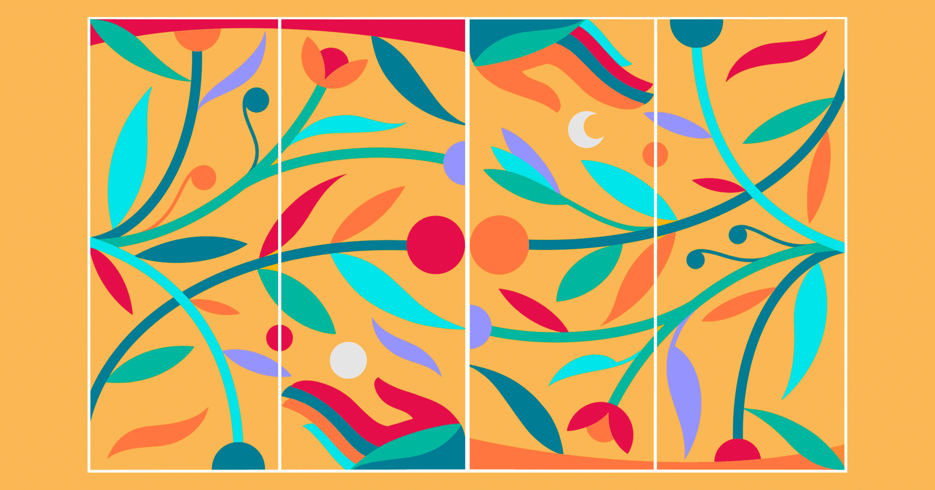 Autour d’elles, les formes végétales s’élancent dans un foisonnement de feuilles, de bourgeons et de couleurs.
