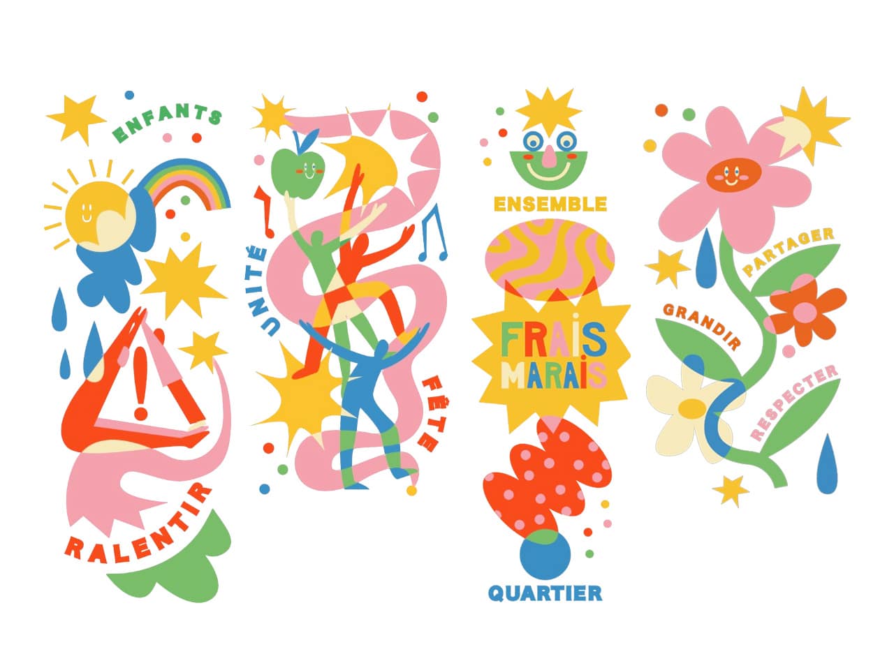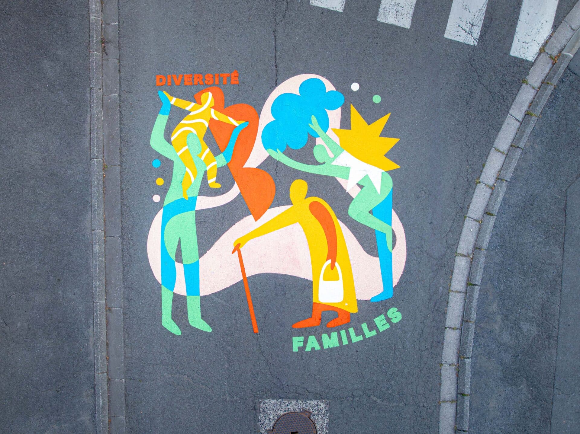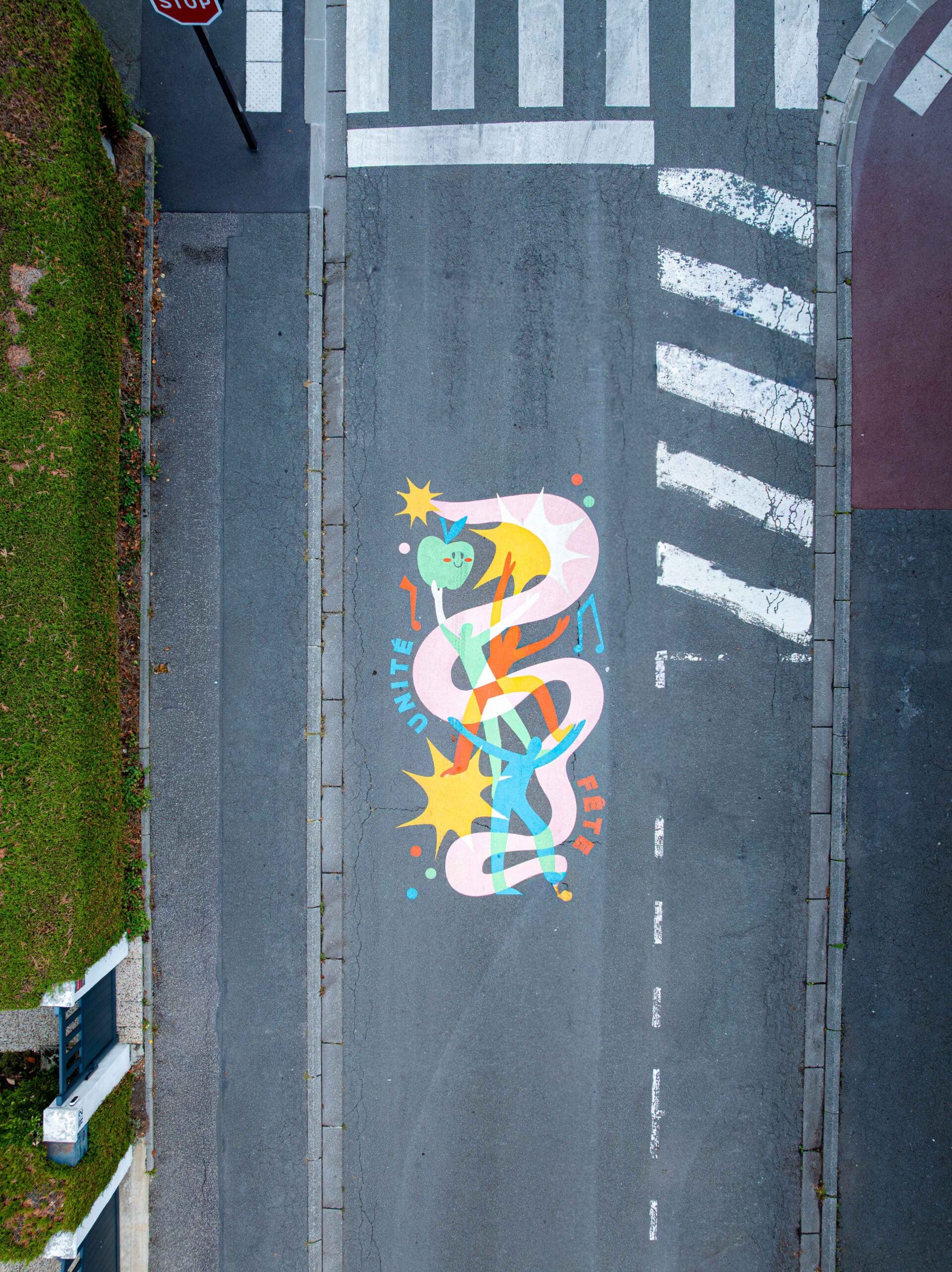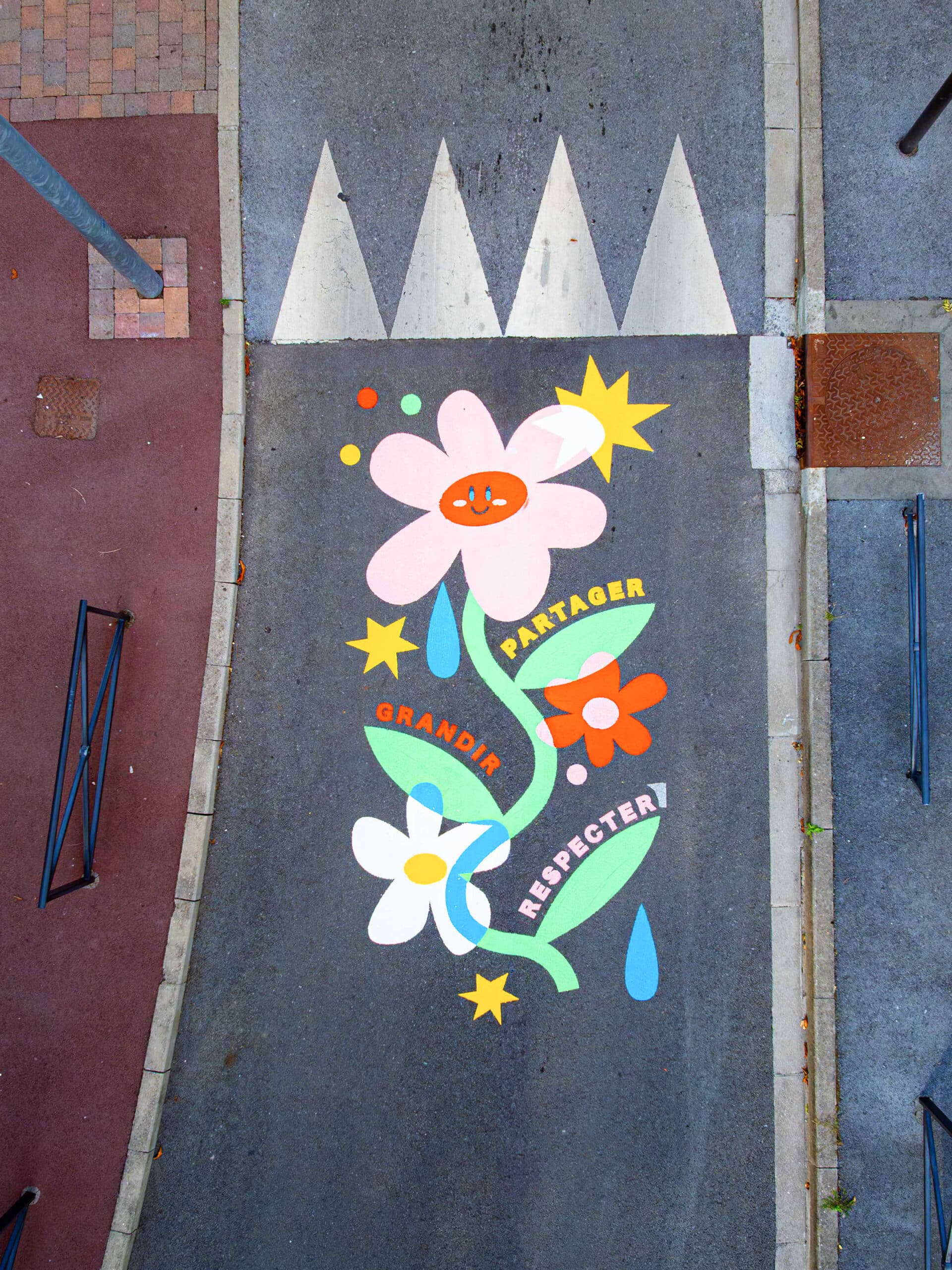 L’artiste Perrine Honoré, illustratrice et muraliste française, développe un univers festif, coloré et spontané. Avant la réalisation, des ateliers ont été menés avec les enfants de l’école et les habitants autour de thèmes clés : vivre-ensemble, mémoire du quartier, rassemblement, intergénérationnel.