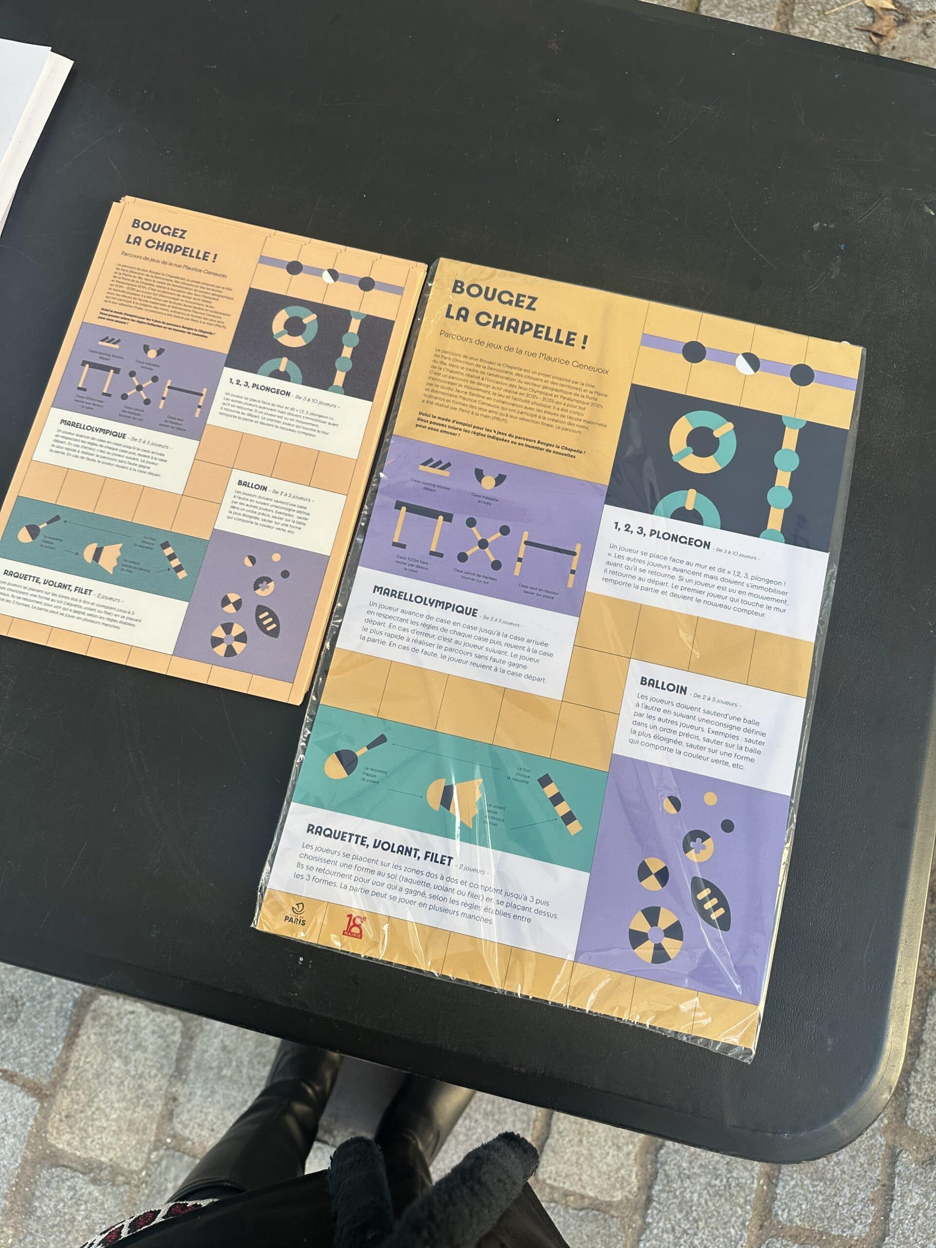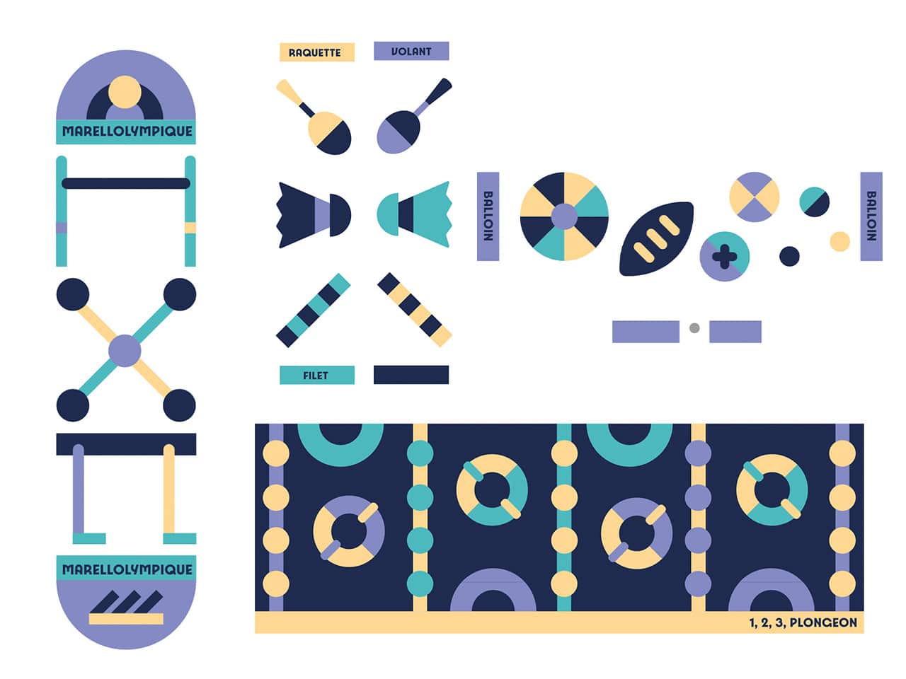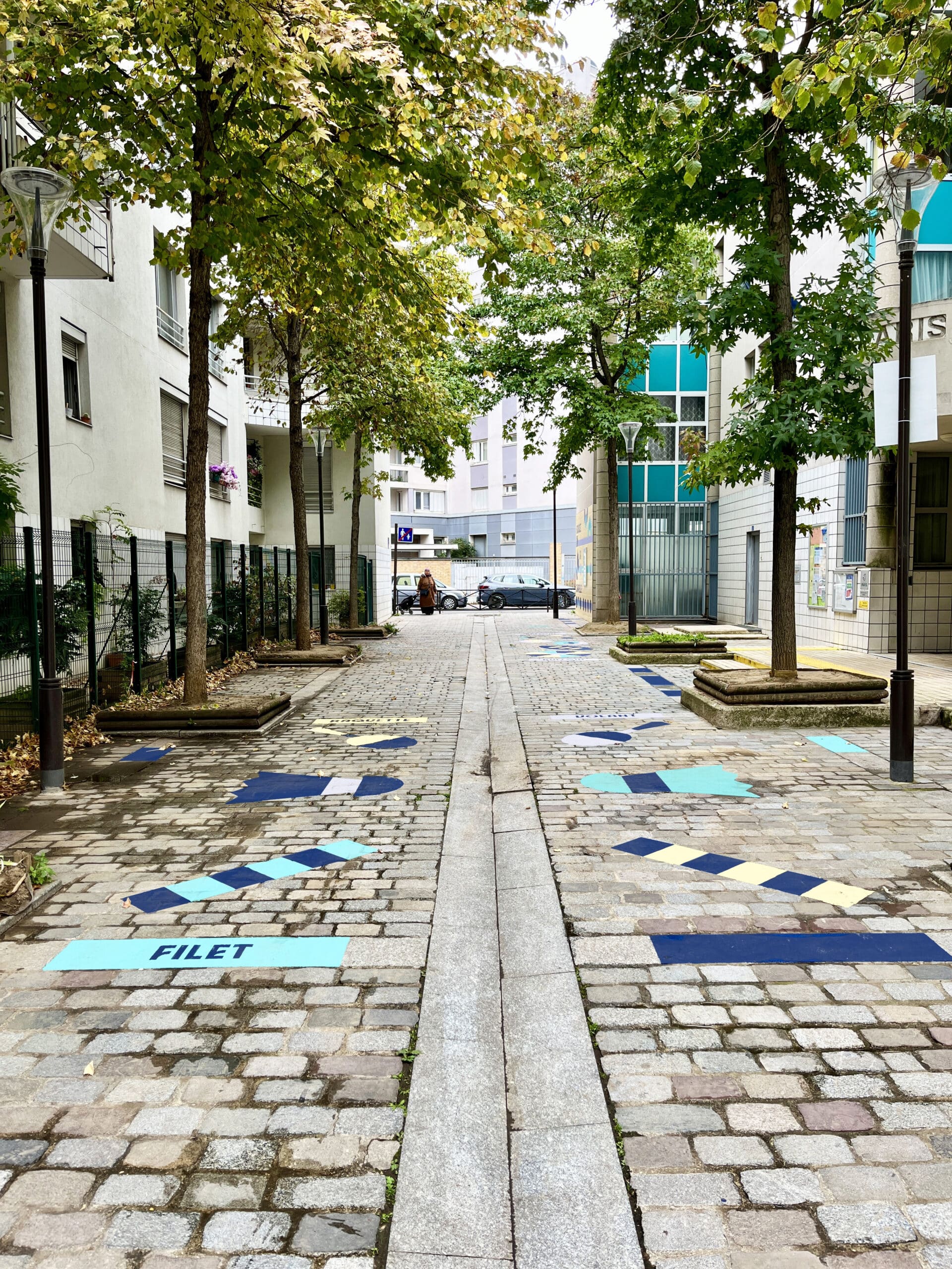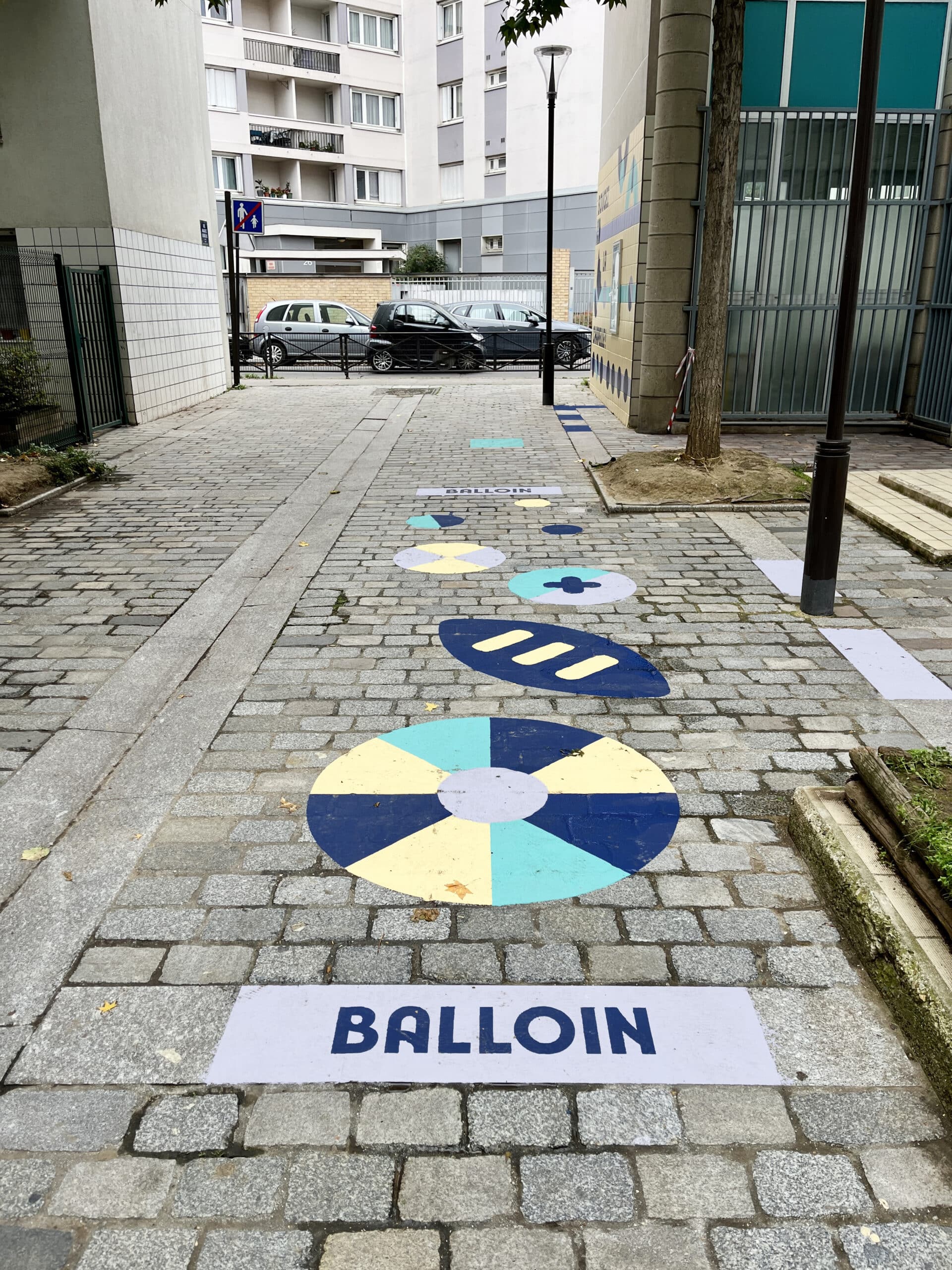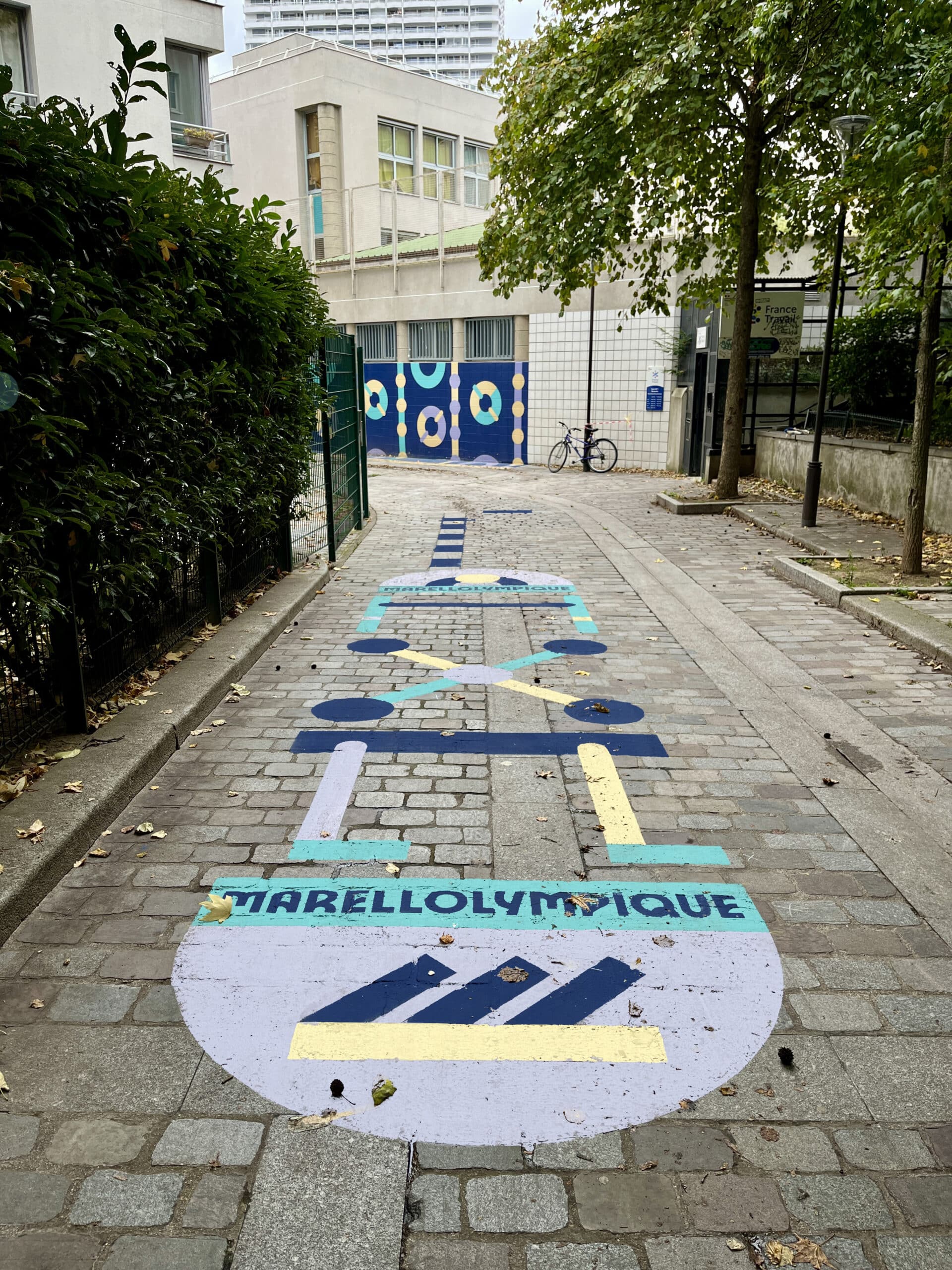 Le parcours a été conçu à partir d’ateliers menés avec les élèves de l’école Maurice Genevoix. Jeux, règles, motifs et idées ont été co-inventés avec eux, puis traduits en un langage graphique inspiré du sport, du jeu et des codes visuels des JO 2024.