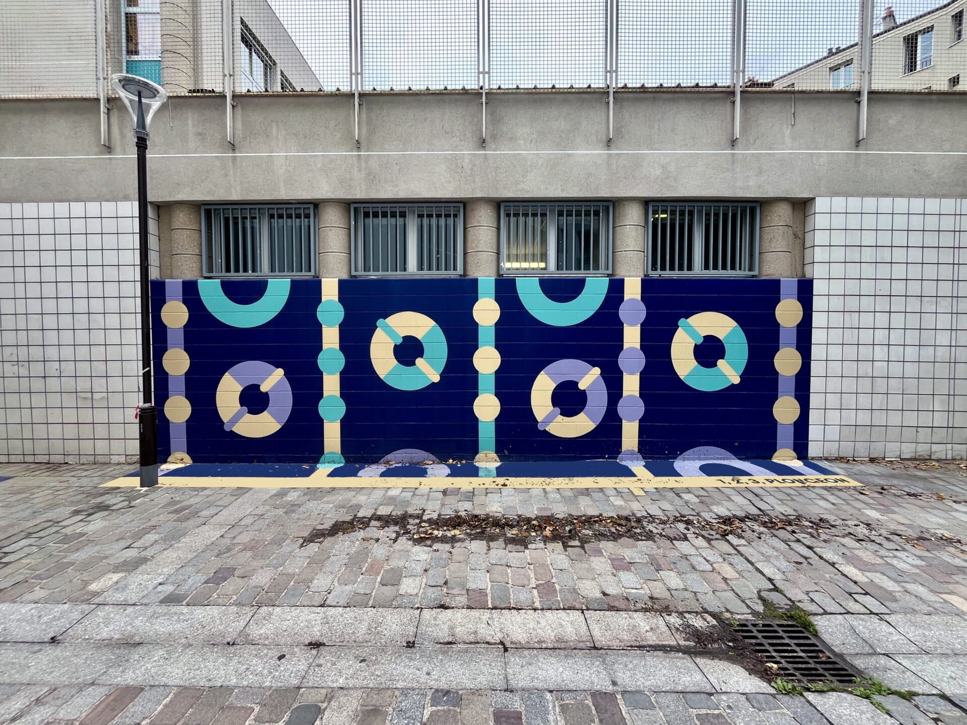Le dispositif se déploie en plusieurs zones peintes, au sol et sur les murs. On y retrouve des jeux revisités, de la signalétique et des compositions graphiques non figuratives, pensées pour être intuitives, accessibles et adaptées à tous les publics.