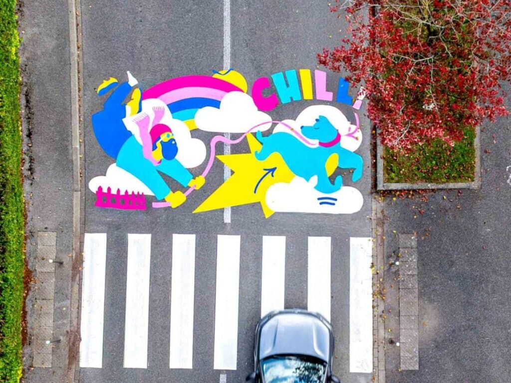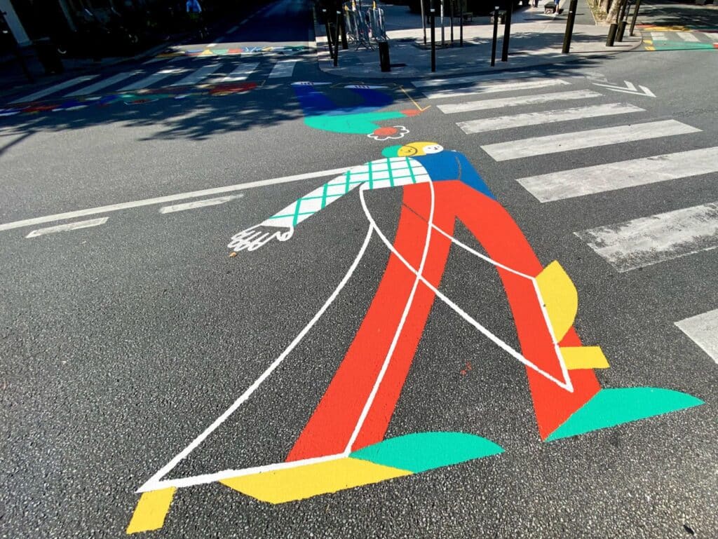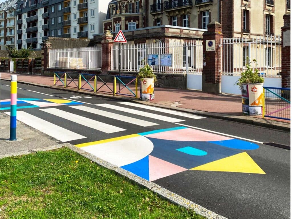 Notre art urbain combine design actif et co-création : artistes, habitants et enfants conçoivent des parcours lisibles, des points d’ancrage et des messages clairs pour automobilistes, cyclistes et piétons. Les abords scolaires deviennent des espaces repérés, partagés et accueillants un véritable outil de sensibilisation et de citoyenneté.