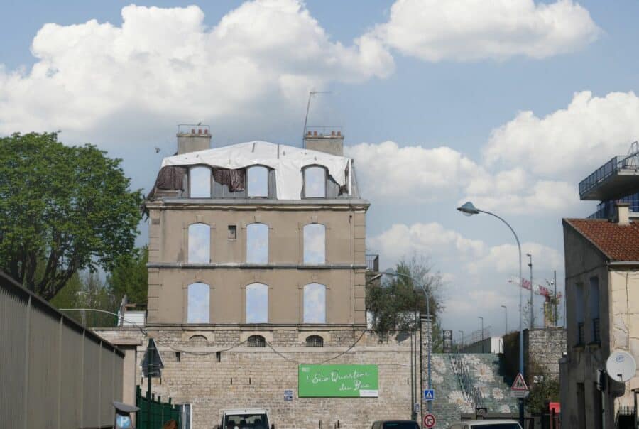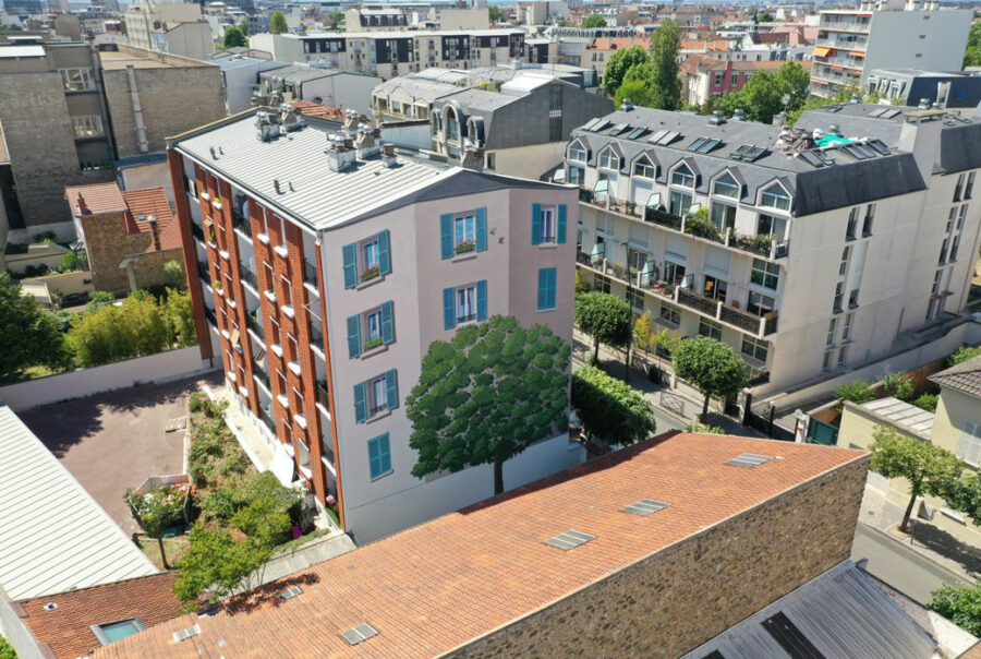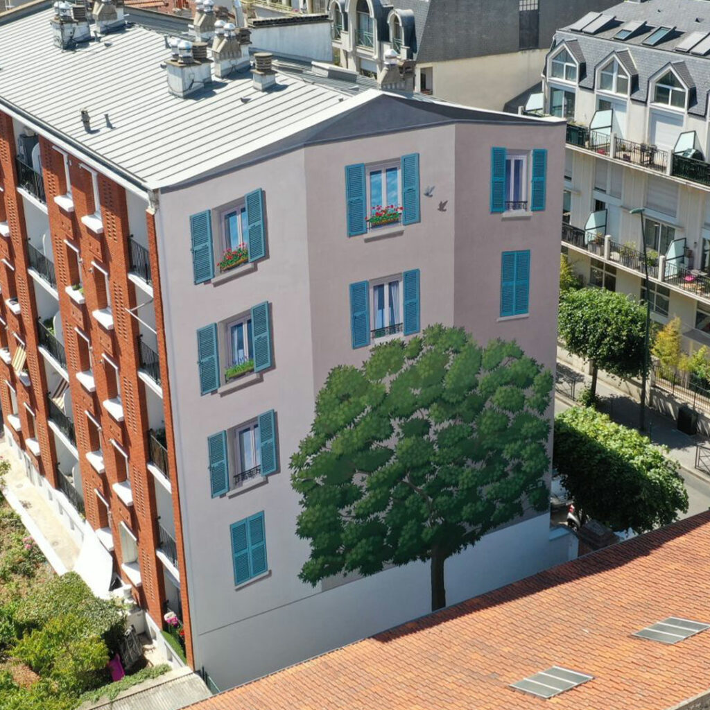 Une nouvelle façade terminée pour Immobilière 3F et la Mairie de La Garenne-Colombes qui se fond dans le paysage urbain. Les fausses fenêtres ont été réalisées sur toile en atelier. Puis, dans un second temps, elles ont été marouflées sur le pignon. L’arbre, quant à lui, a été directement peint sur le support.